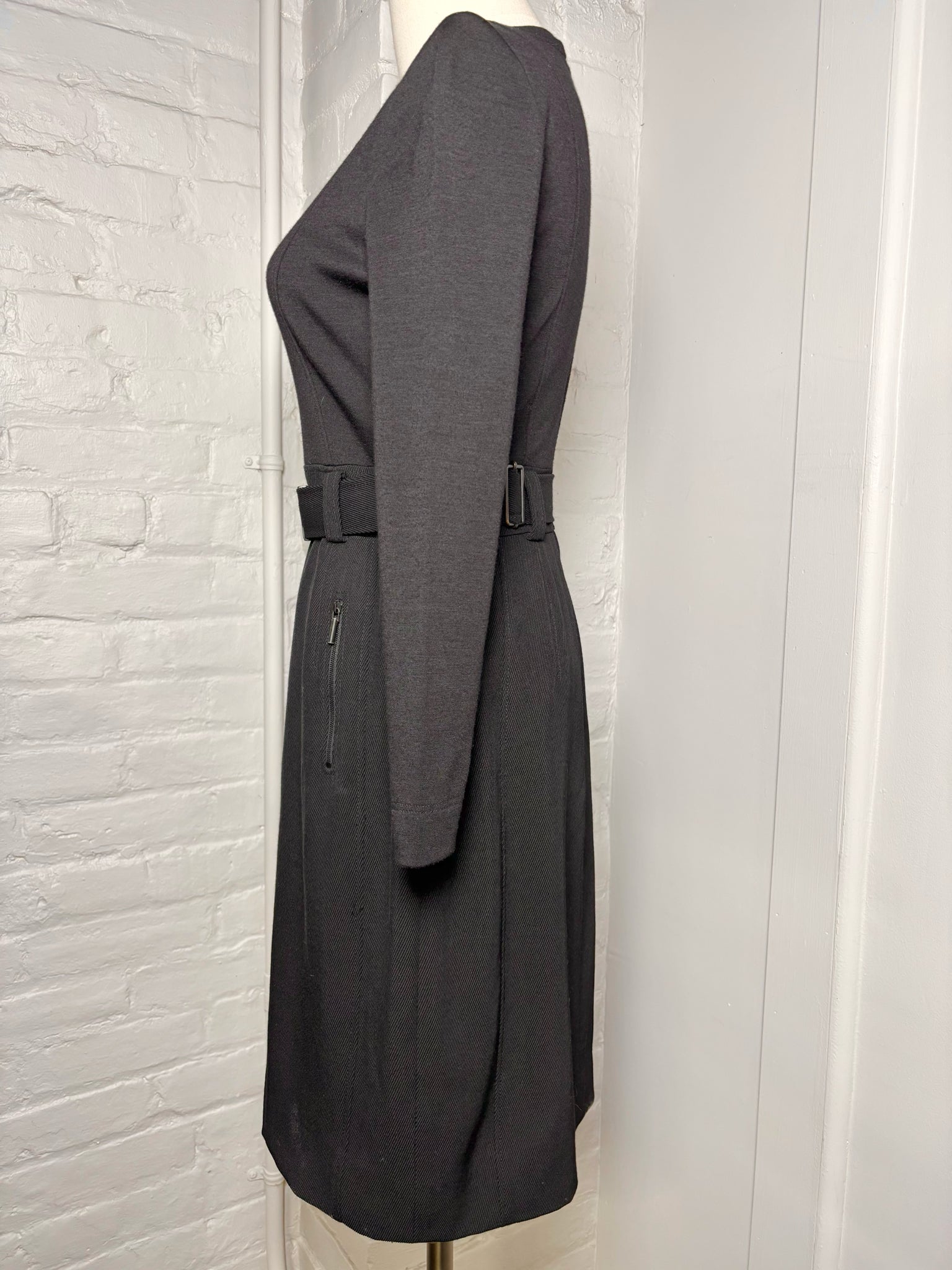 This Akris Punto black long sleeve mini dress exudes modern sophistication with its clean silhouette and impeccable tailoring. Designed with a matching adjustable waist belt to accentuate the figure and a discreet back zipper for a seamless finish, this piece embodies effortless elegance in a size 6.