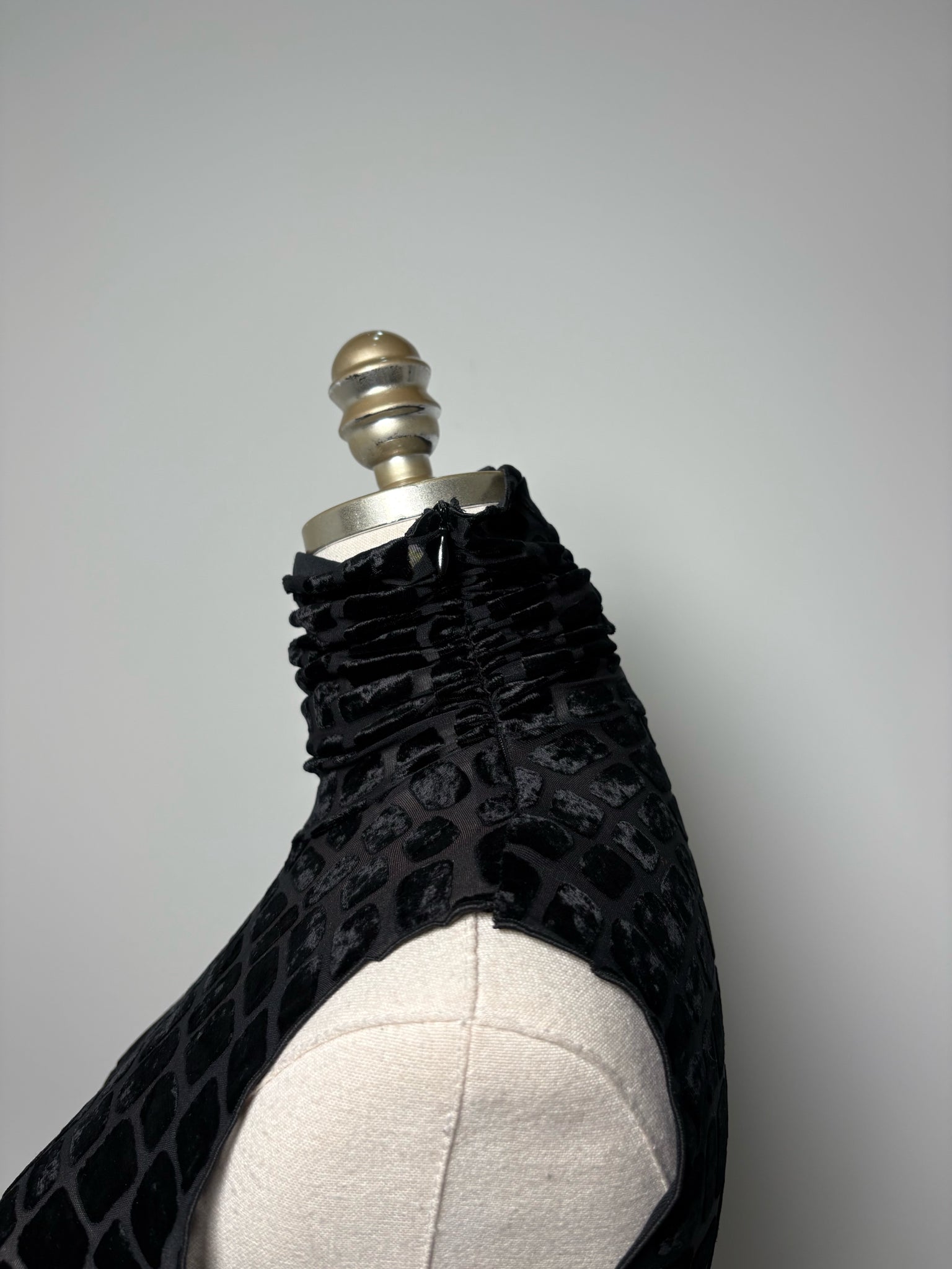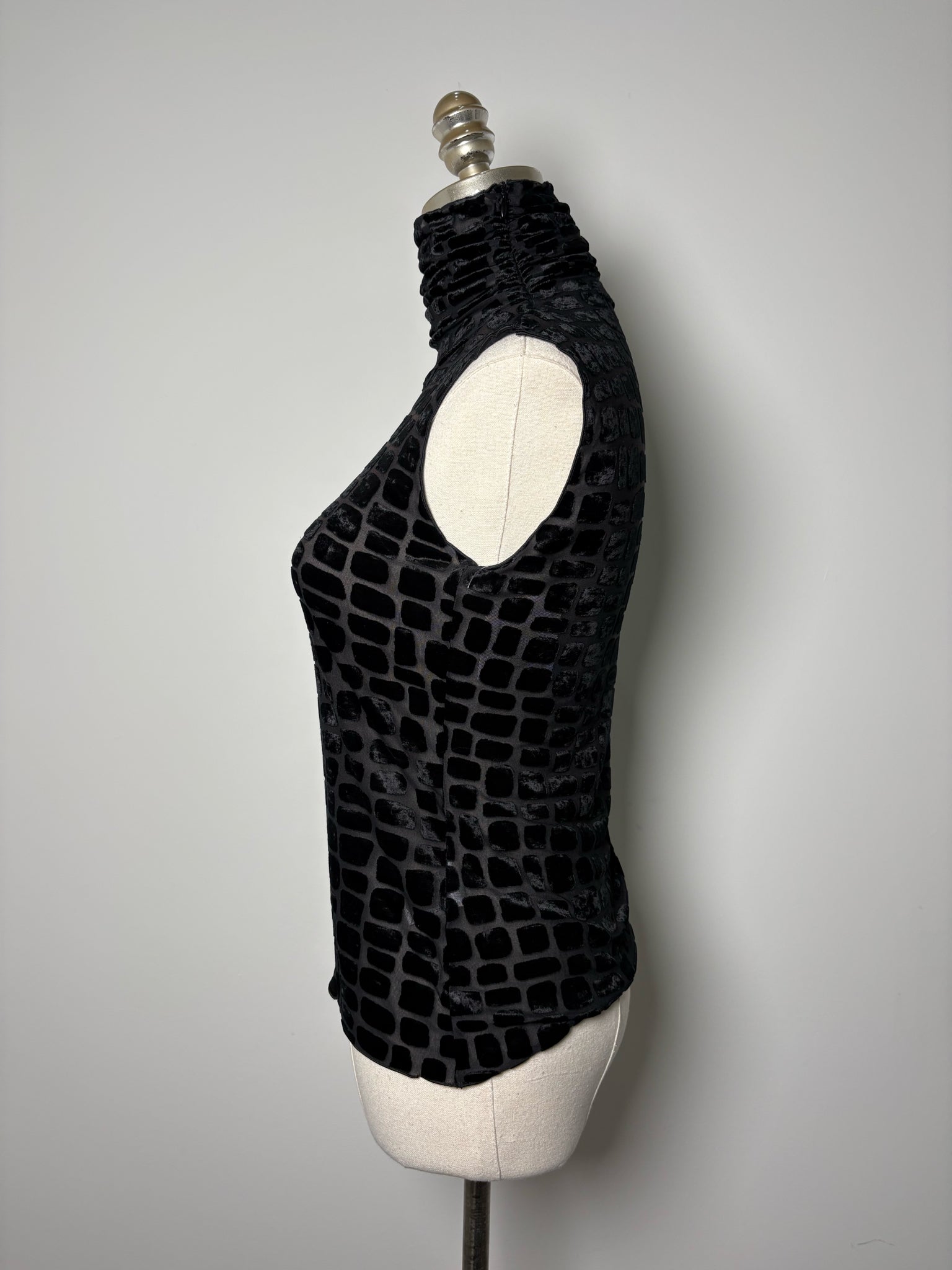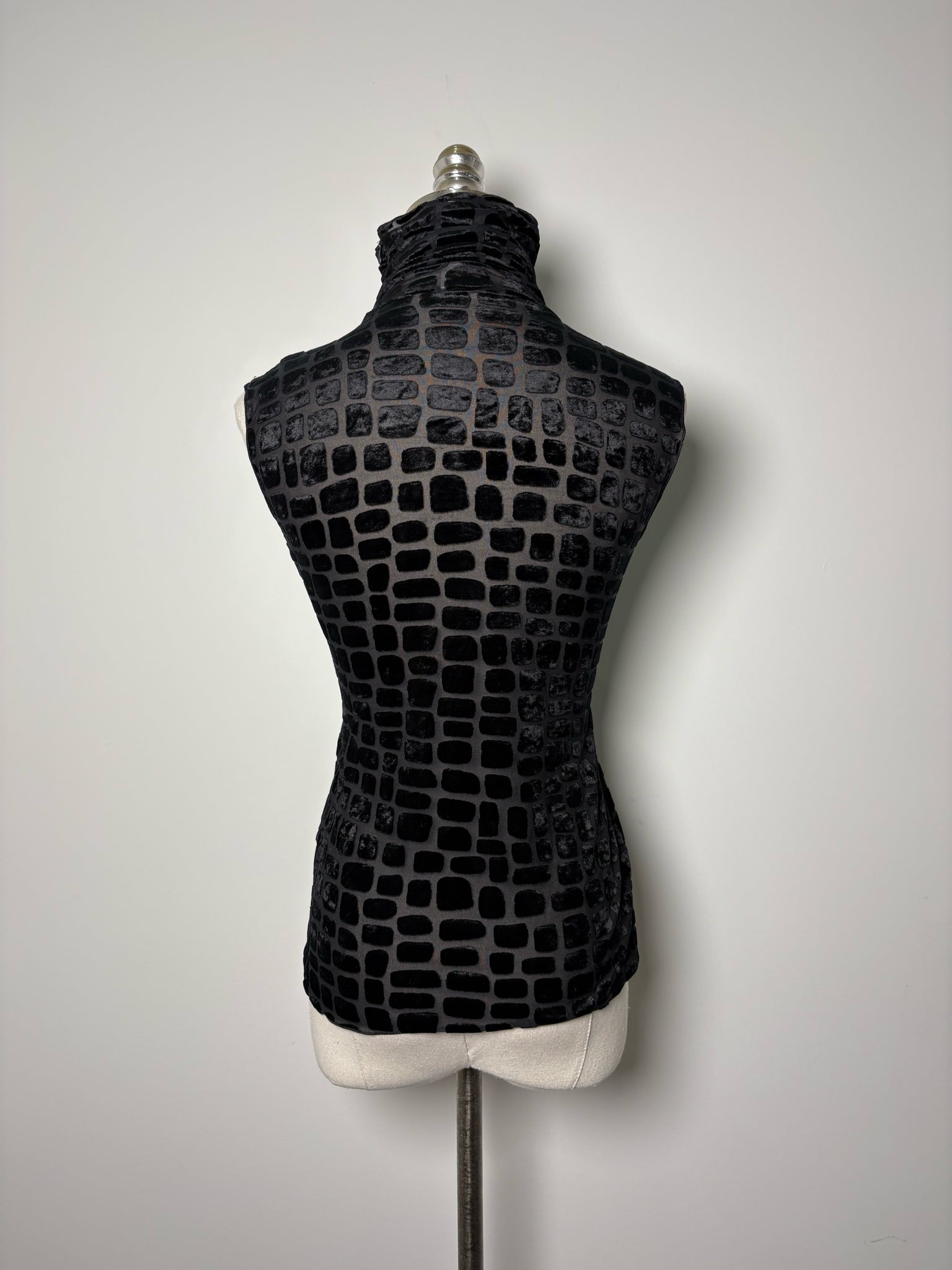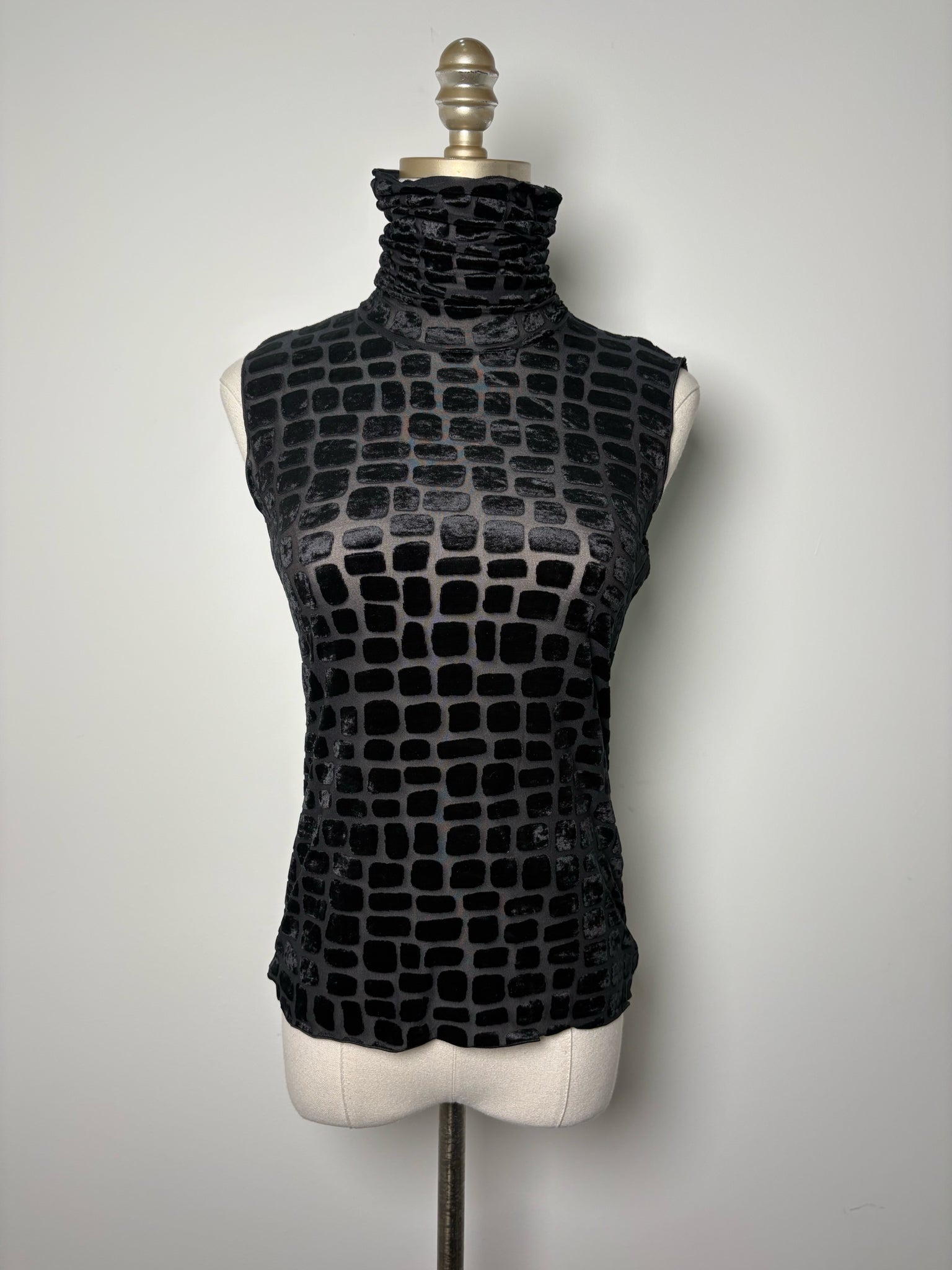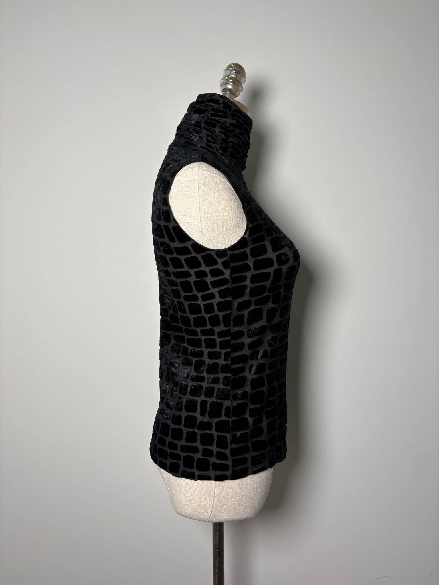 Armani Collection black squares mesh and velour mock neck top in a size 6. Pre-owned.