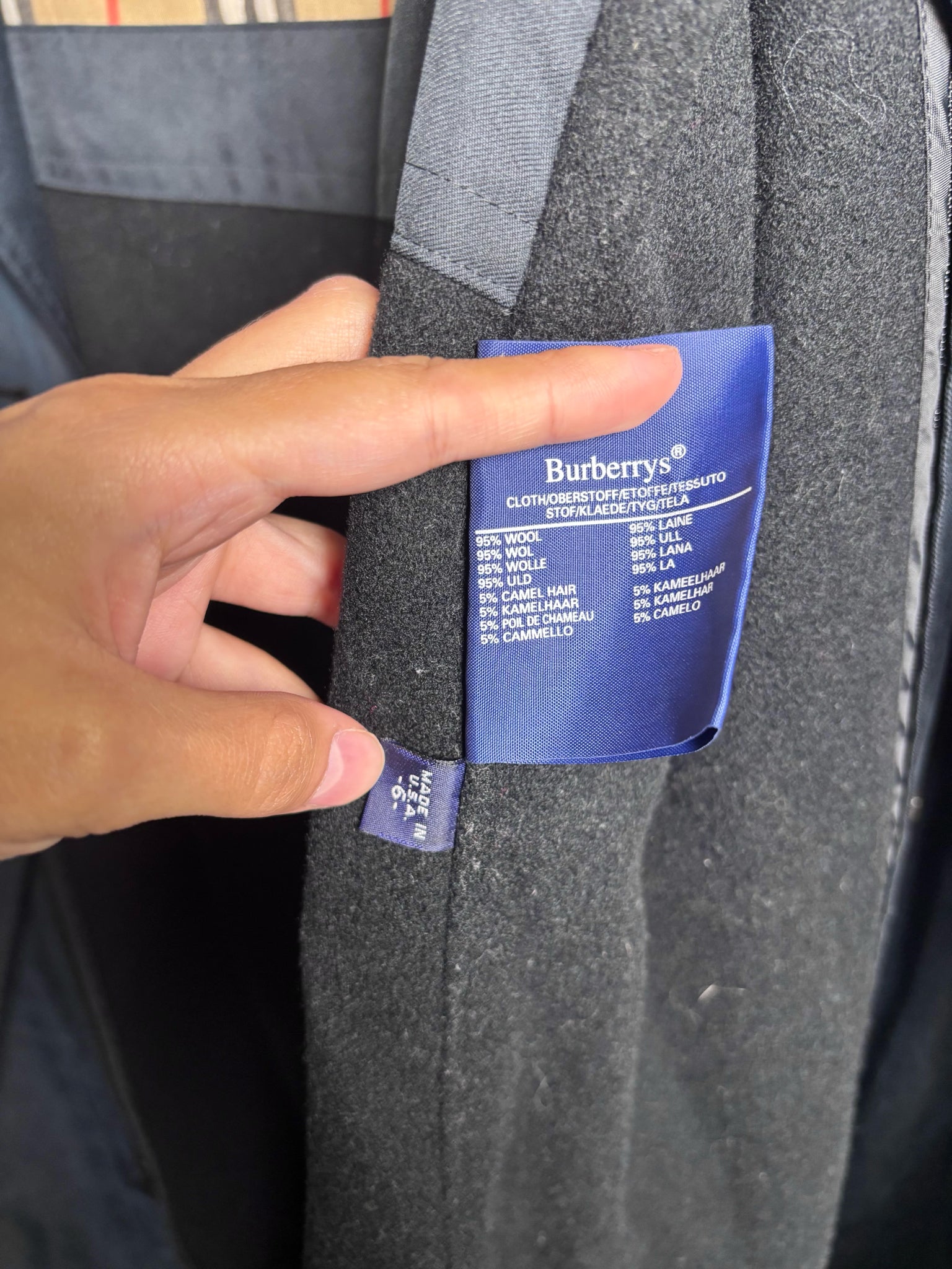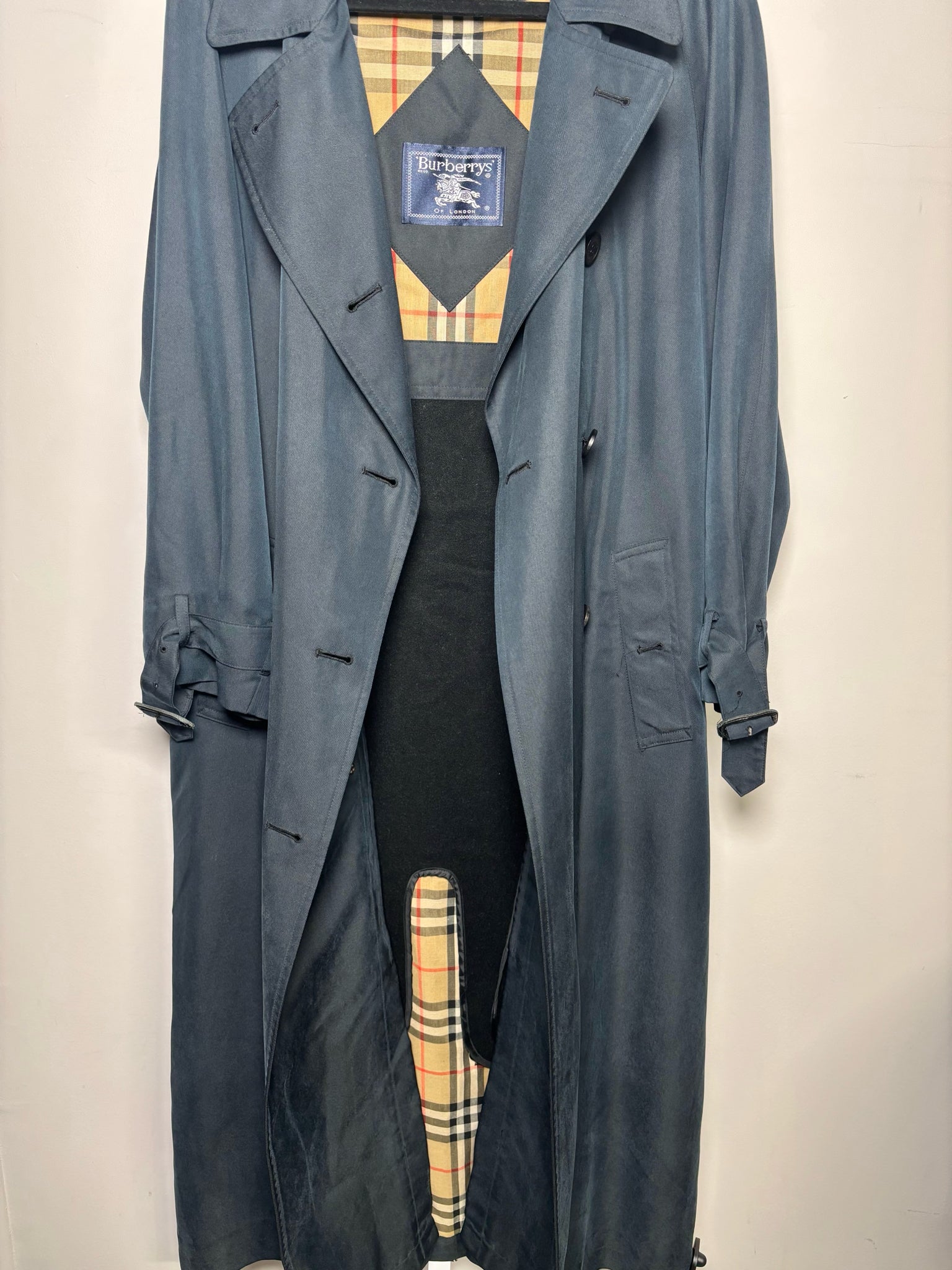VINTAGE Burberrys' navy trench coat with their signature check wool lining that is removable. It is missing a button for the left pocket and belt, priced as-is.