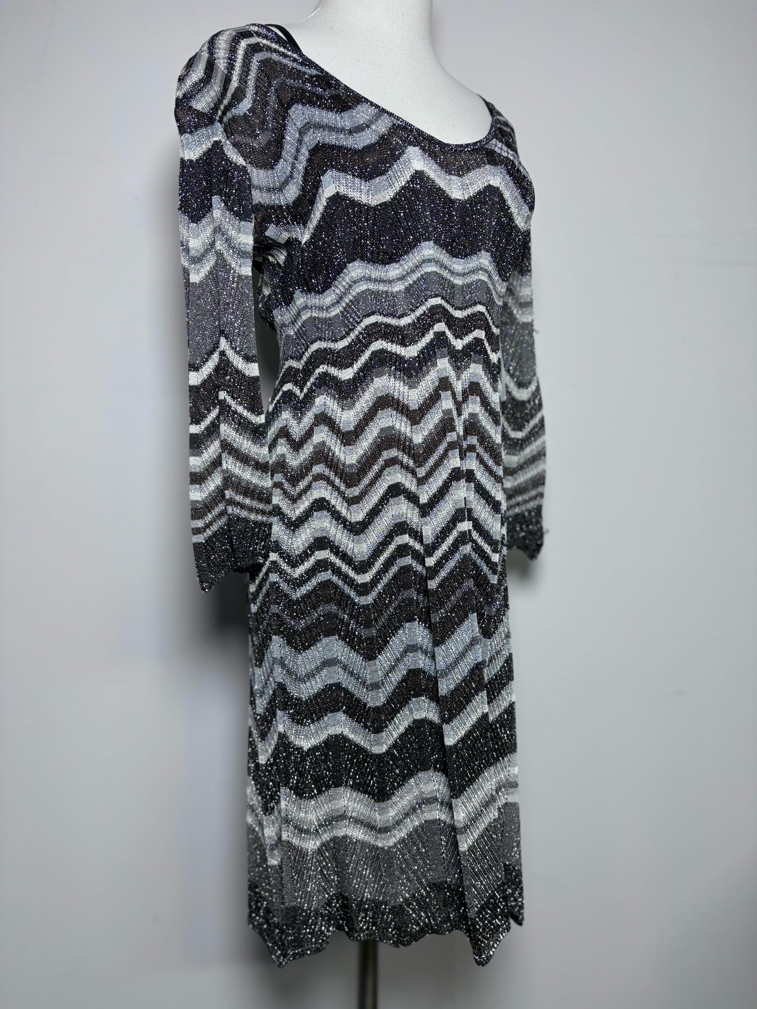 Vibrant and sophisticated, this Missoni long-sleeve knit dress showcases the brand’s signature zig-zag pattern in black, gray, and metallic silver. In women’s size 6 (M), it offers a flattering silhouette with iconic Missoni texture and flair.