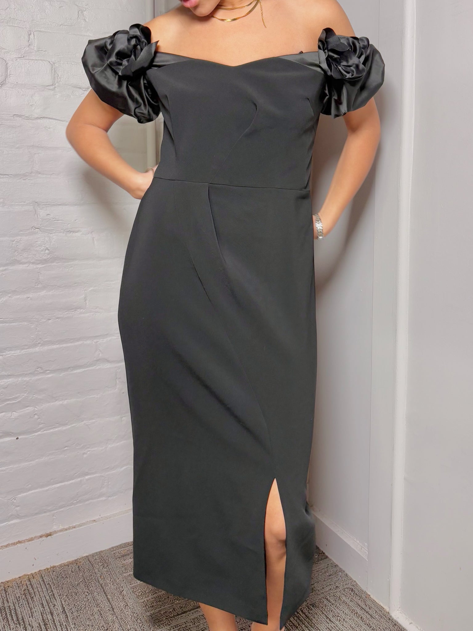Marchesa Notte black midi cocktail dress, designed for standout special occasions. Featuring dramatic ruffled puff sleeves, a front slit, and a fully lined silhouette, this piece exudes the brand’s signature elegance and modern romance. New with tags, size 6.