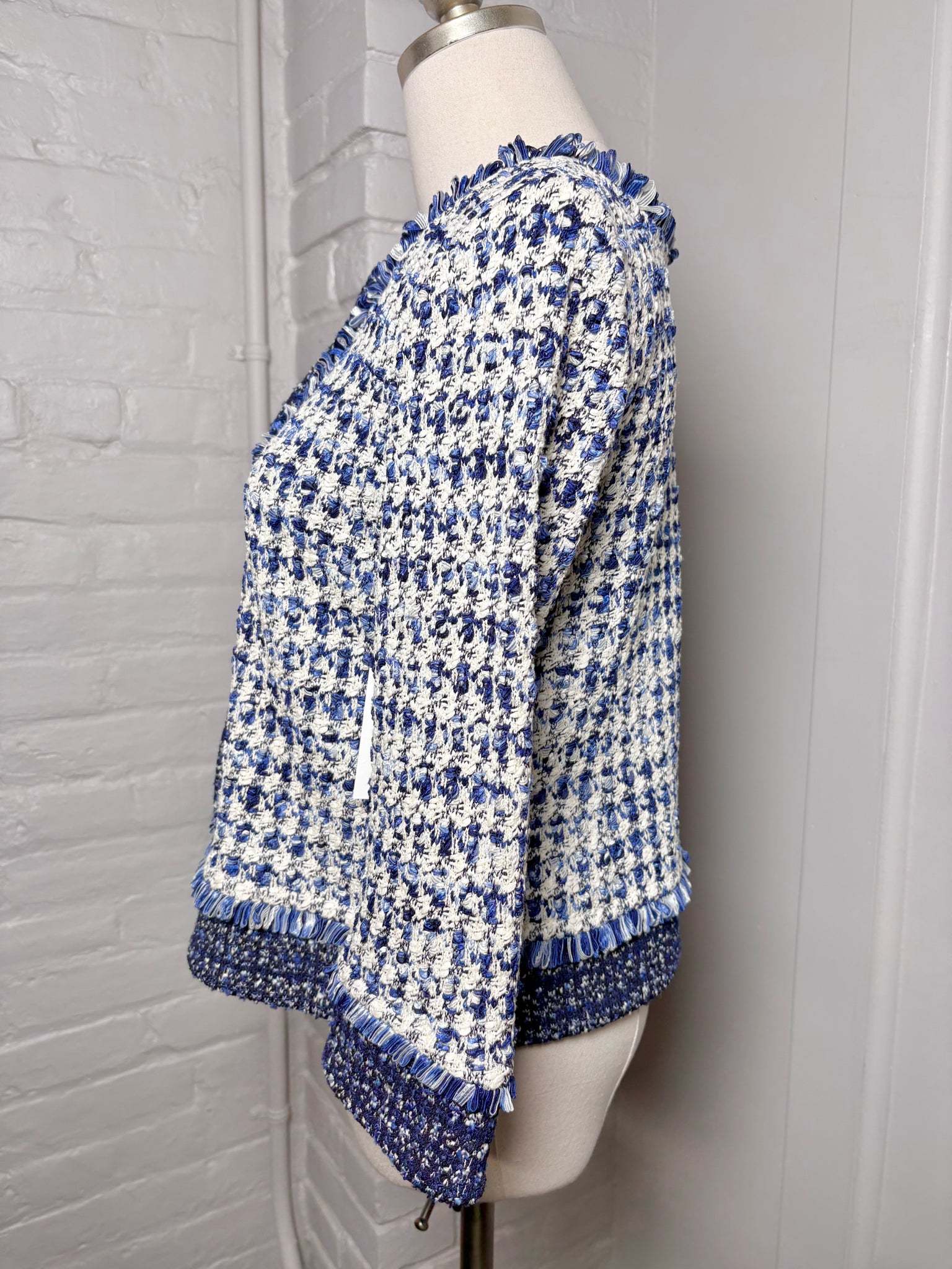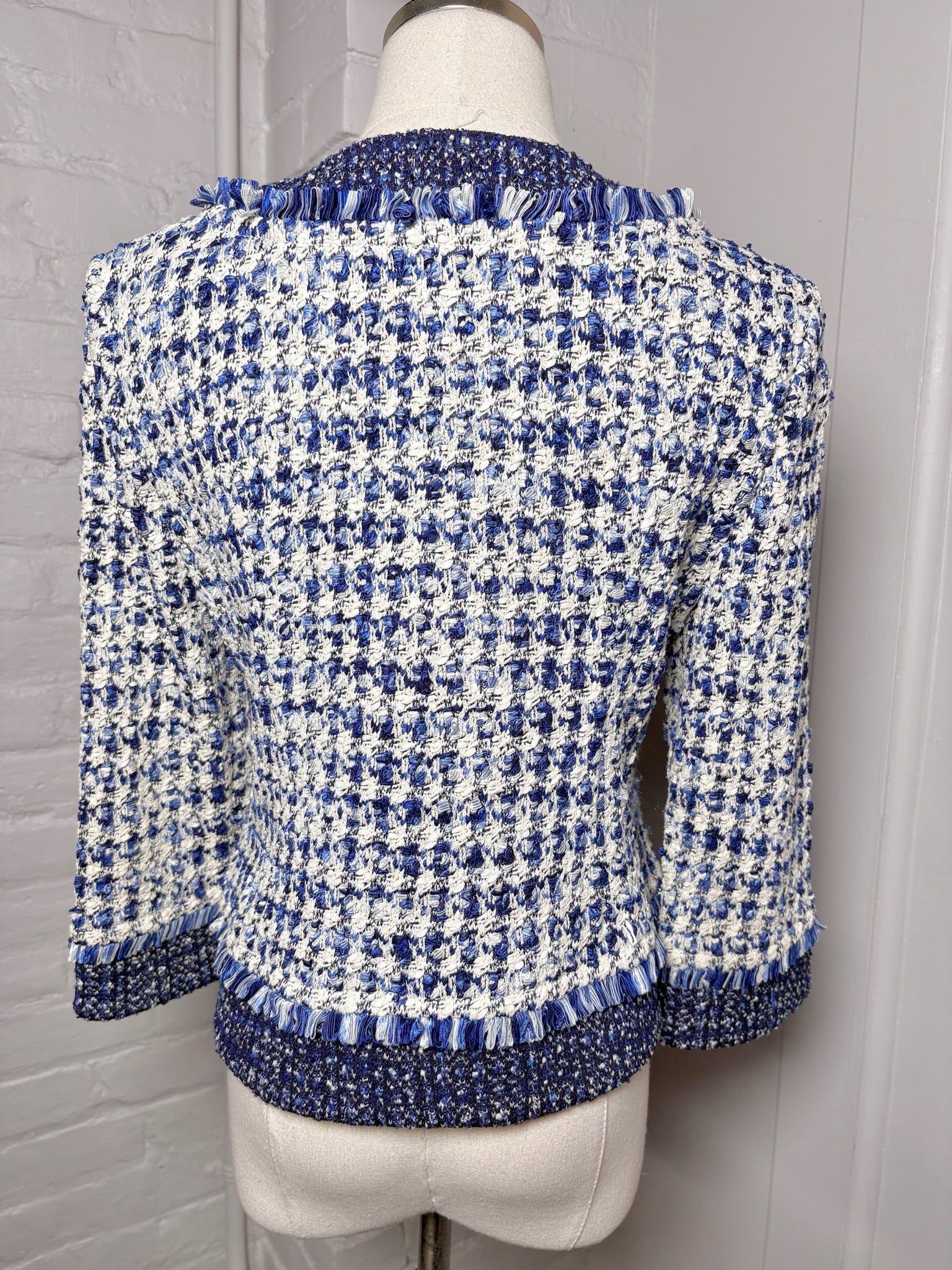 Women Size 6 St. John Blue, White Boucle Cropped Fringe Trim Blazer