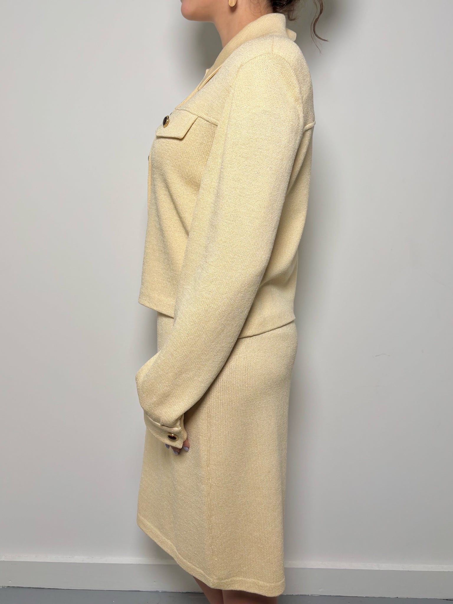 Elegant and versatile, this St. John pencil skirt is crafted in a soft butter yellow wool and rayon knit blend. Designed with a flattering pull-on silhouette and subtle stretch at the waist, it offers both comfort and sophistication. The streamlined cut makes it an ideal foundation piece for refined styling.