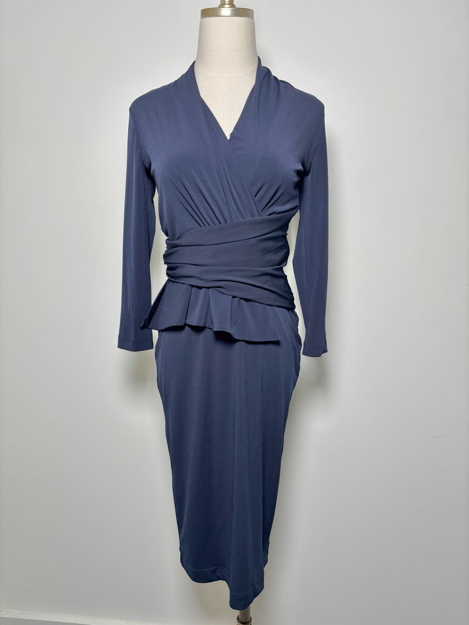 The Fold “Auletta” navy stretch knit sheath dress in size 6, featuring a flattering V-neckline, elegant 3/4 sleeves, and artful waist draping. A refined bodycon silhouette ideal for polished cocktail and evening wear.