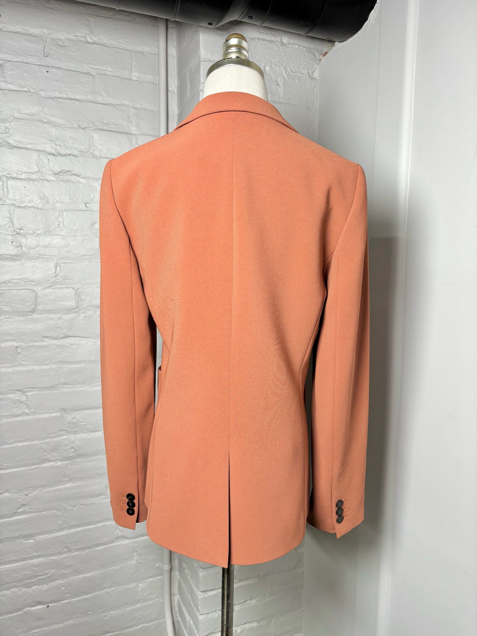Elevate your wardrobe with this sleek Theory blazer in a warm terracotta hue. Featuring a single-button closure, long front pockets, and a contrasting black lining, it offers a refined, modern silhouette perfect for both professional and chic casual looks. Pre-Owned.