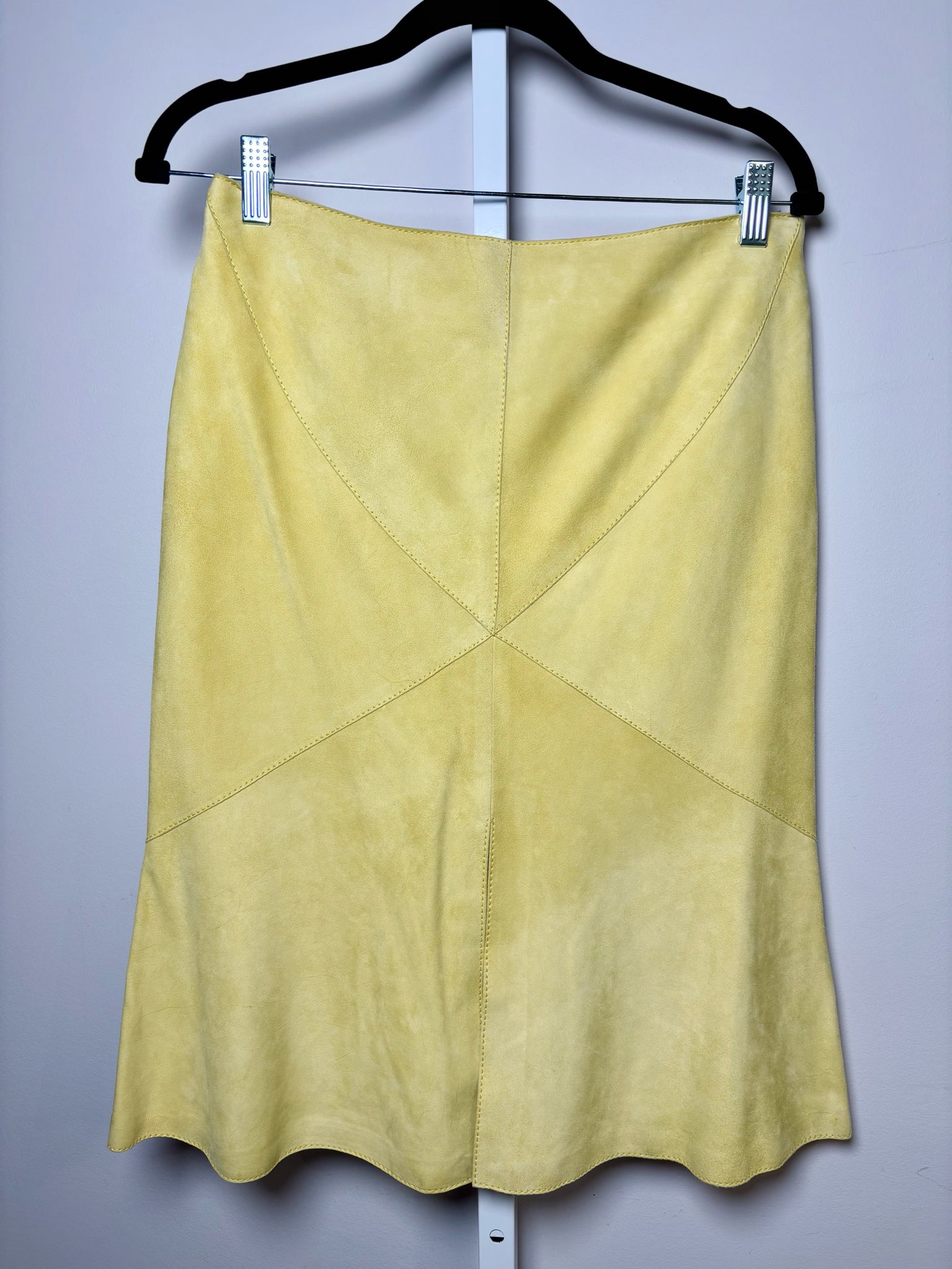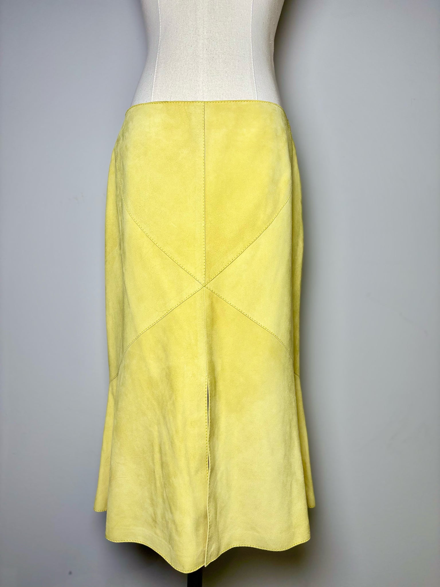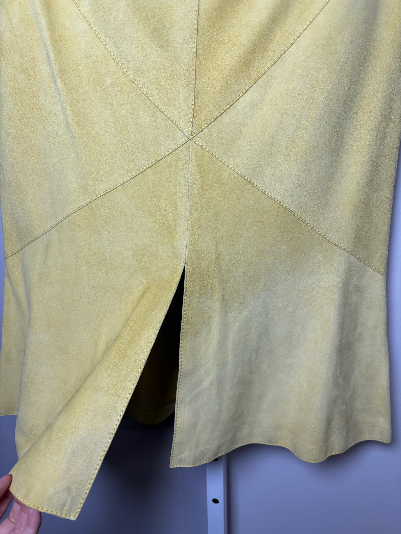 Valentino Garavani yellow leather suede a-line with center slit and side zipper. It is partially lined. Pre-owned.