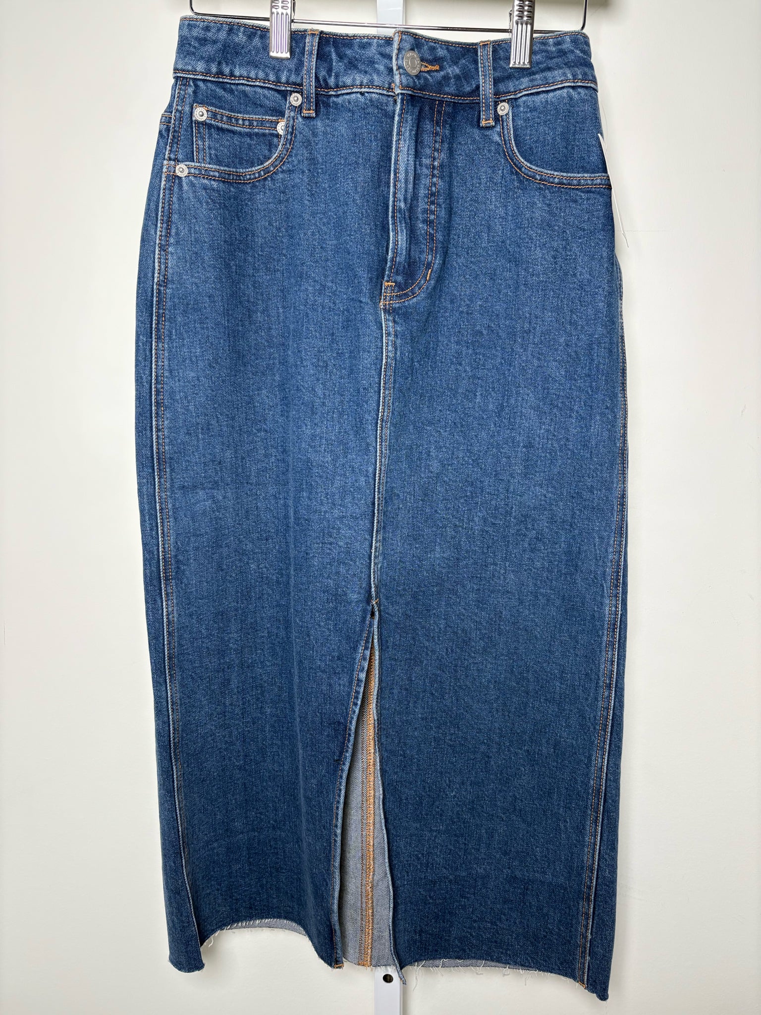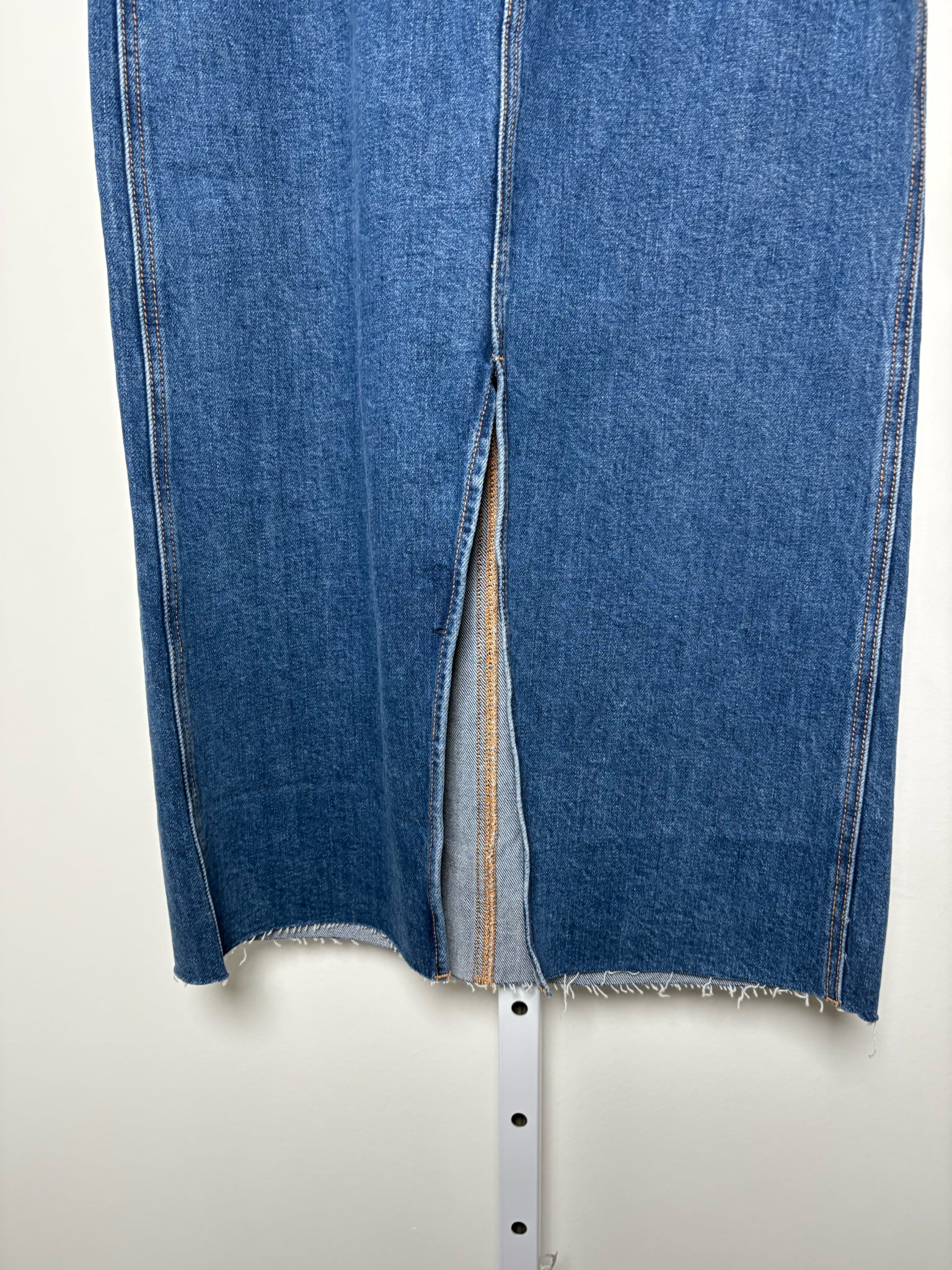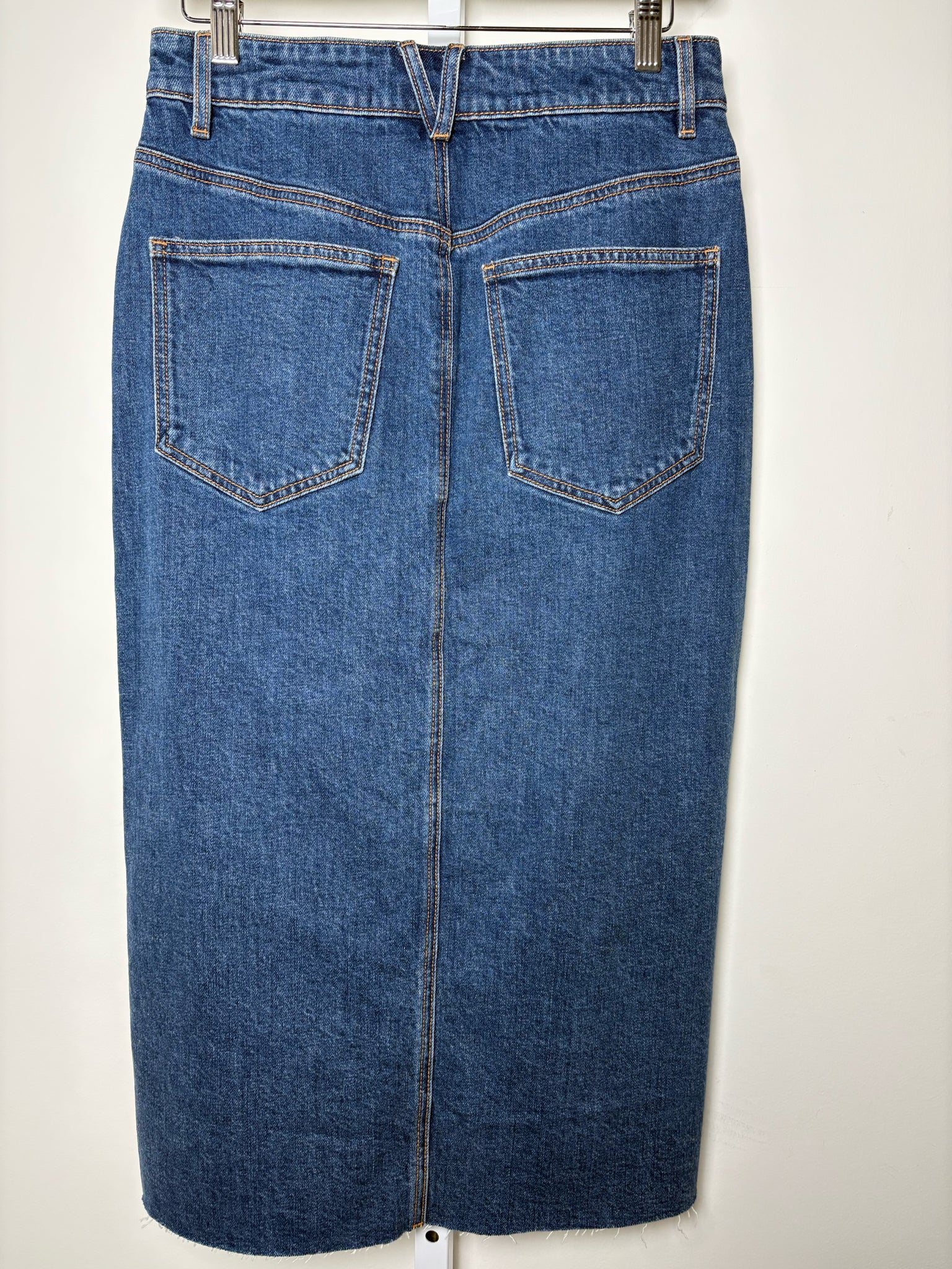 Veronica Beard blue midi denim pencil skirt with frayed hem and front center slit in a size 6.