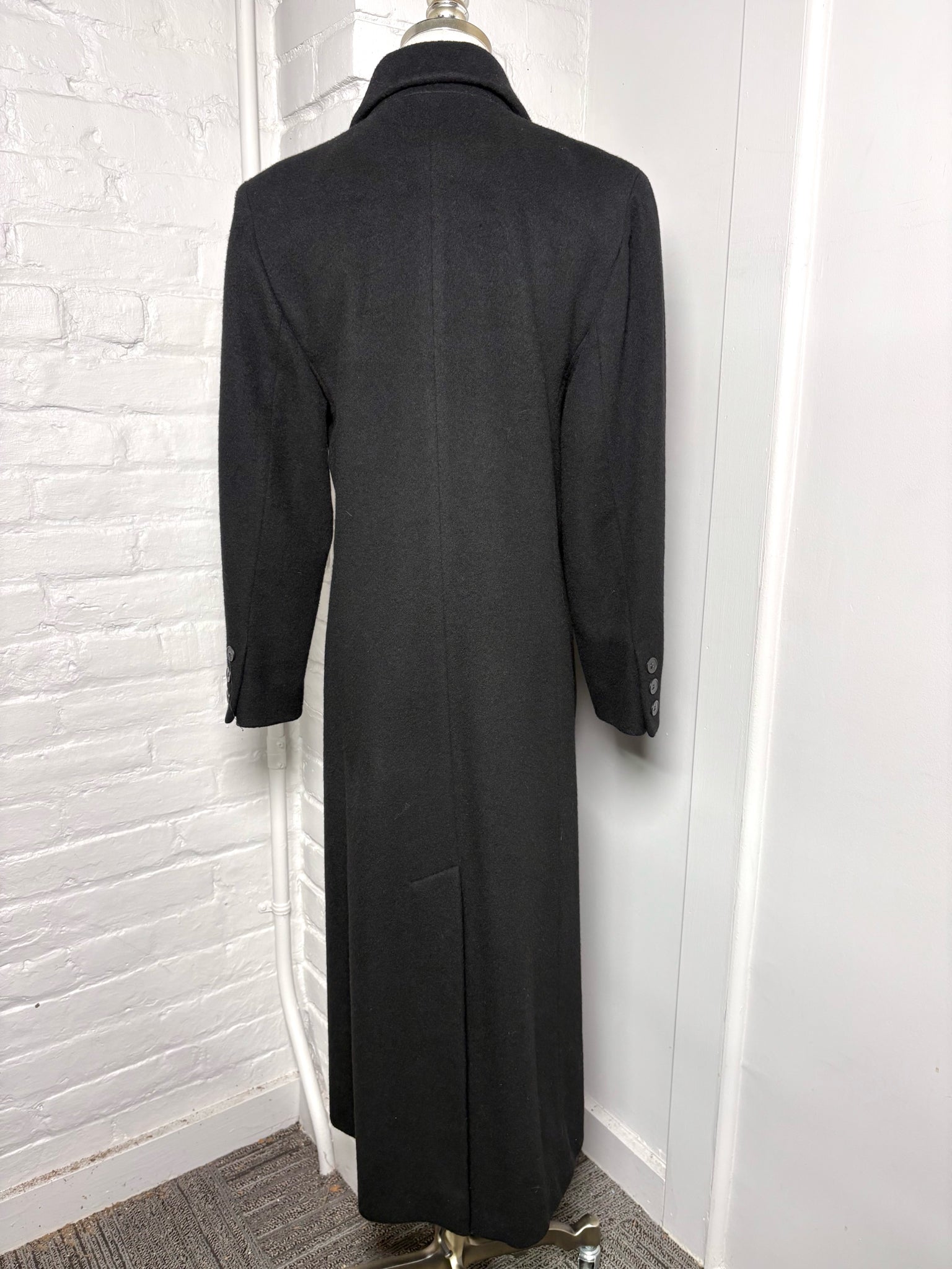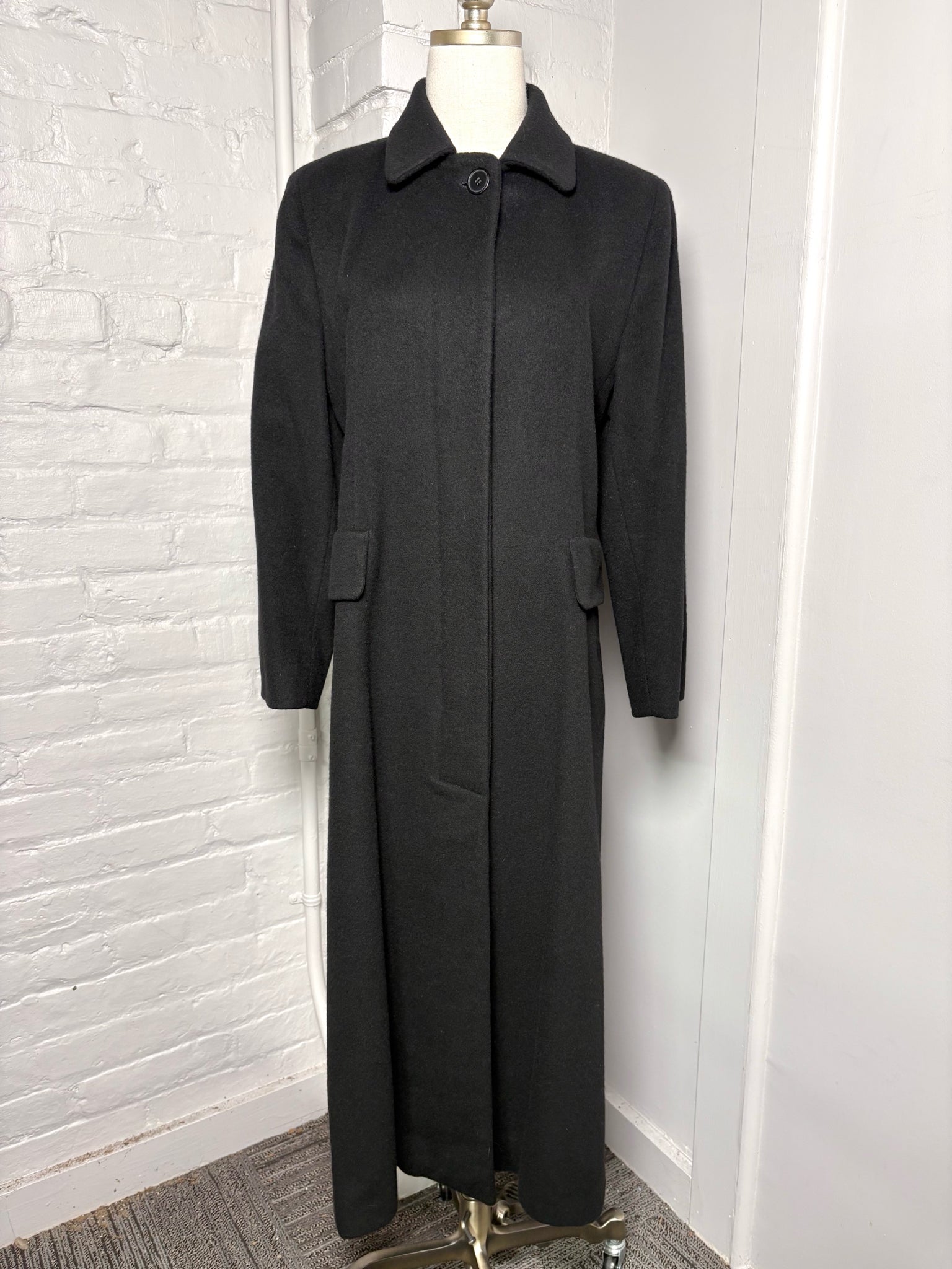 Albert Nipon black wool and cashmere button down coat with 5 concealed buttons in a size 6P.