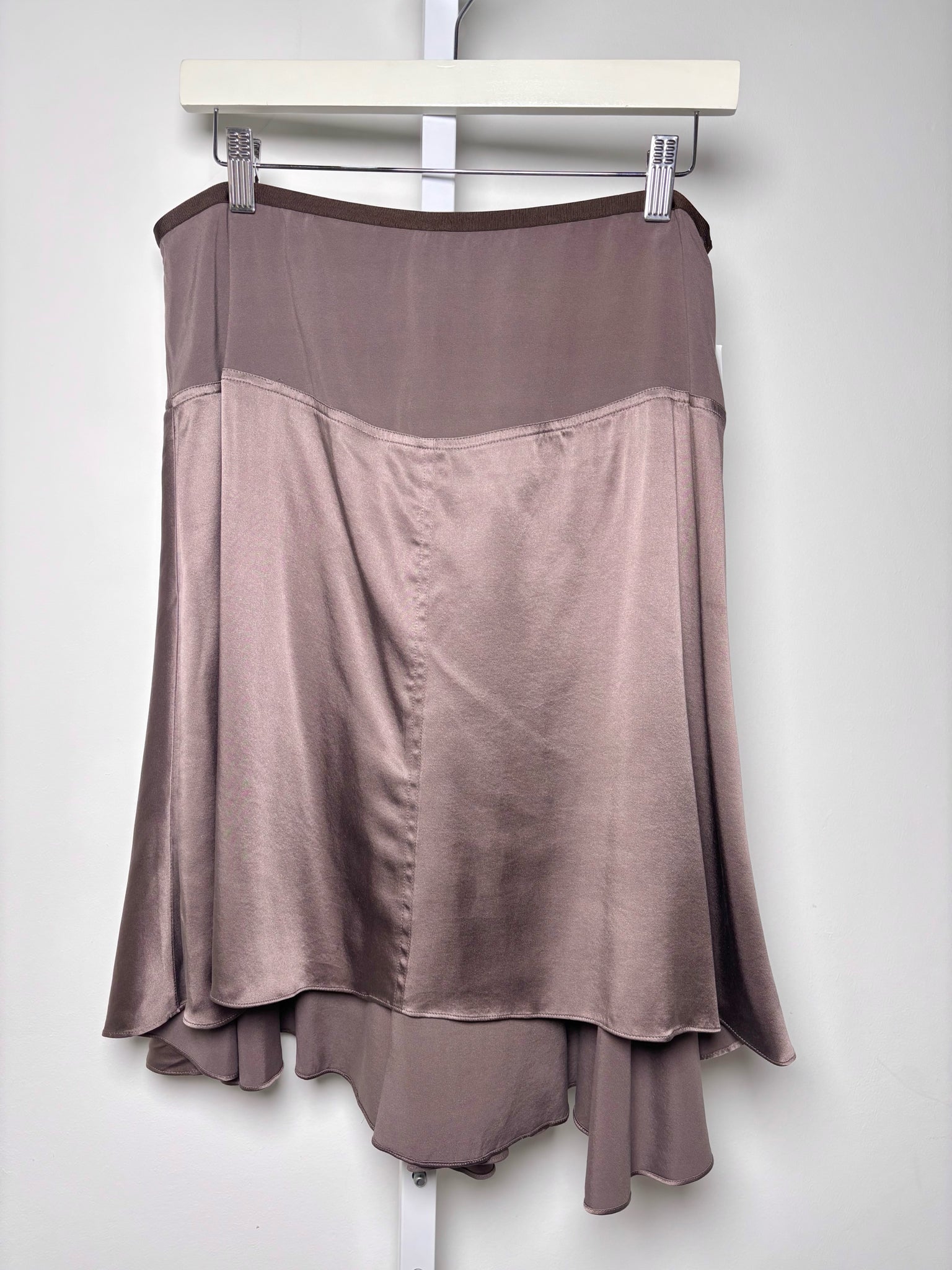 Diane Von Furstenburg taupe silk asymmetrical midi skirt with ruffle hem in a size 8. Priced as-is.