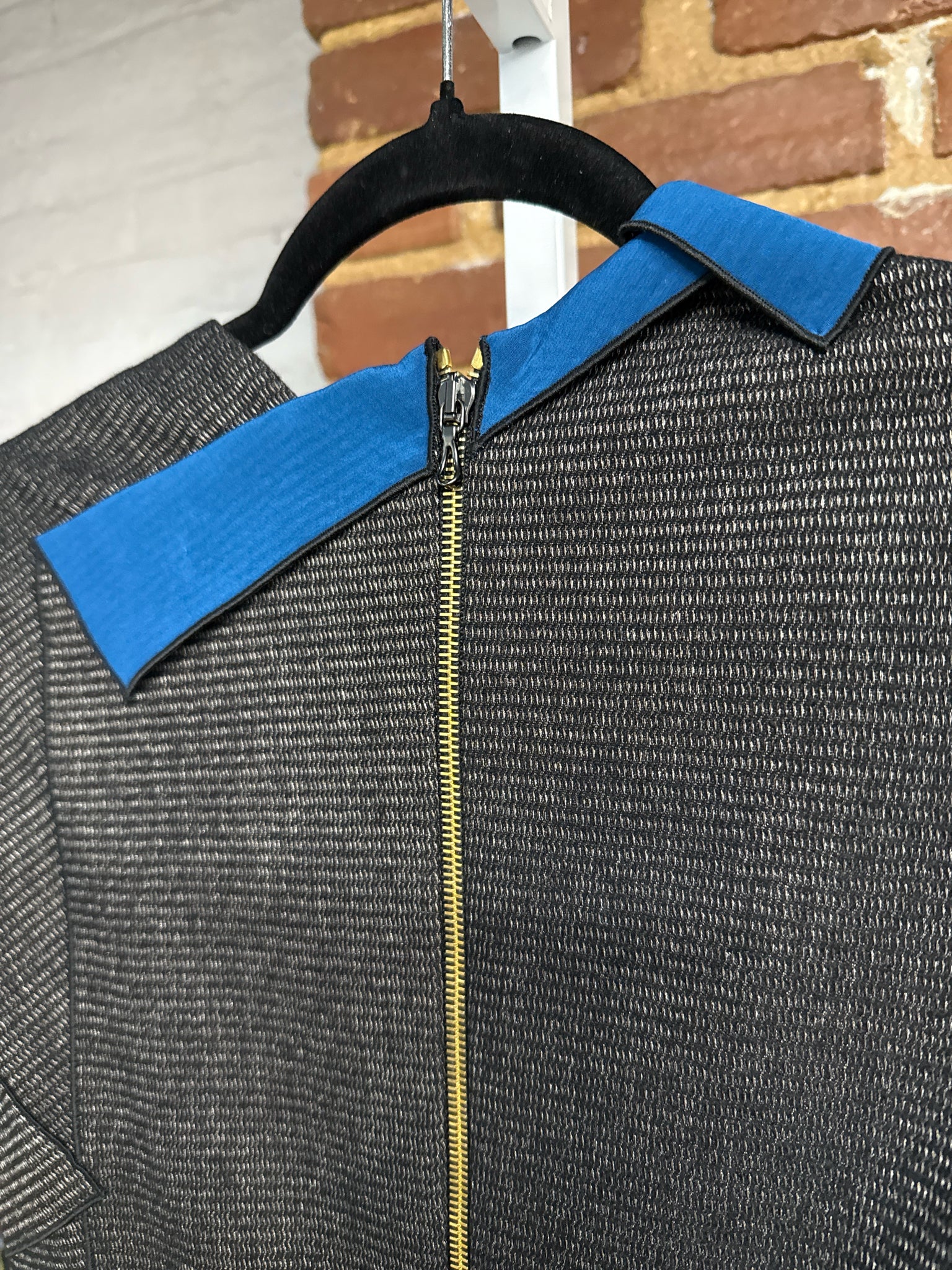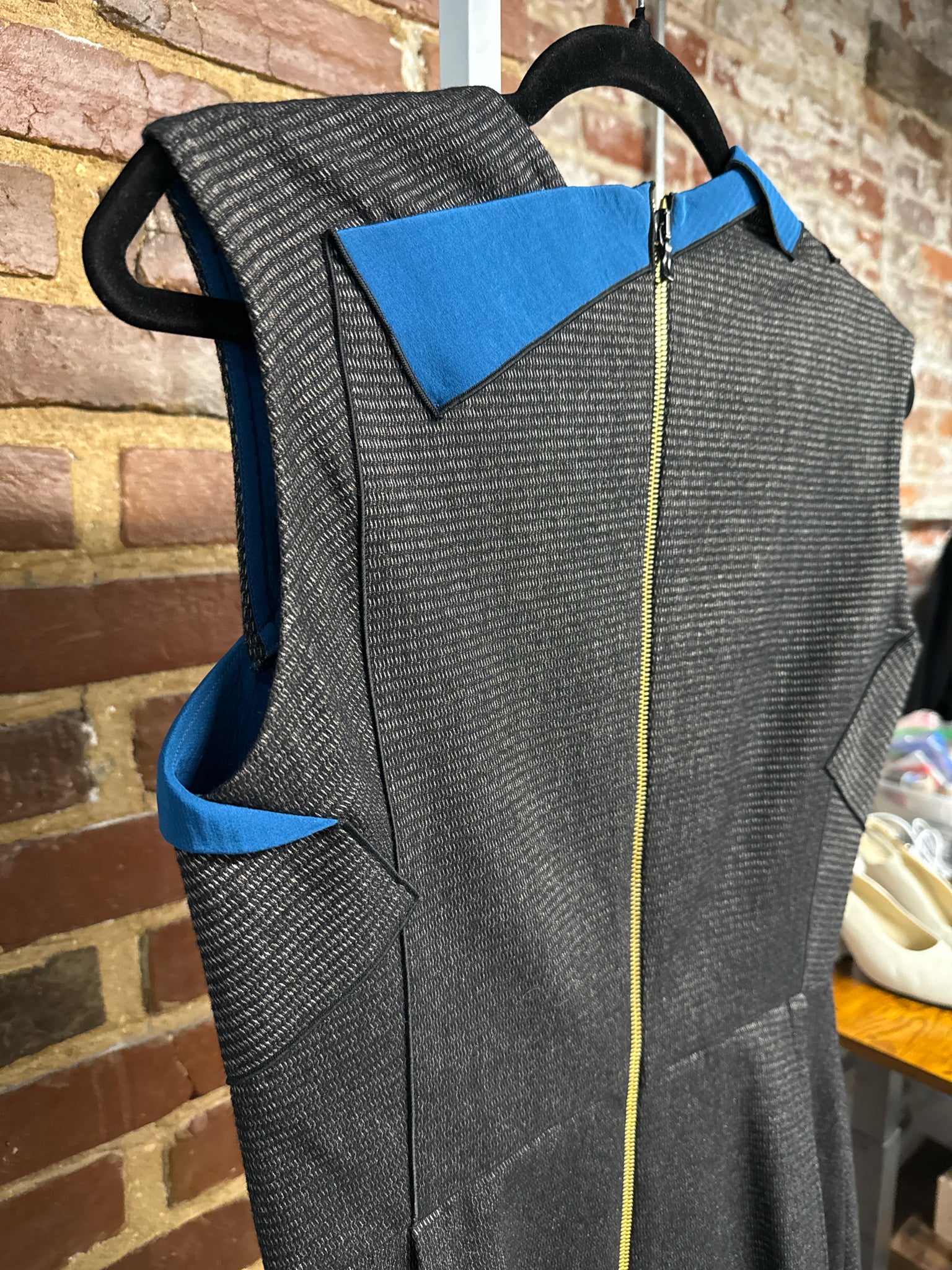 This Roland Mouret fit-and-flare dress features impeccable tailoring in dark gray tweed with teal accents, highlighting the designer’s signature sculpted silhouette. The structured bodice cinches the waist while the flared skirt creates elegant movement and a flattering fit.