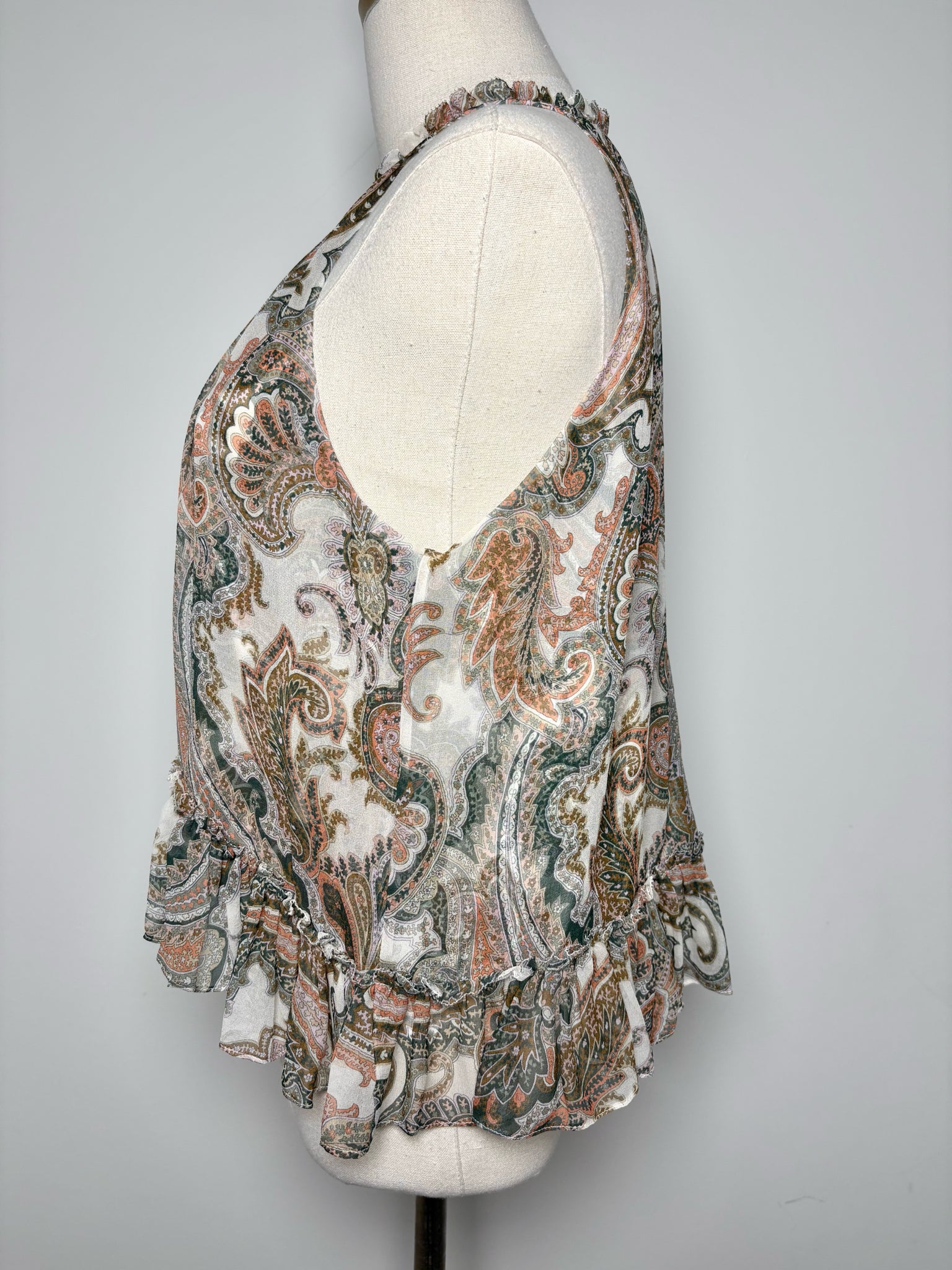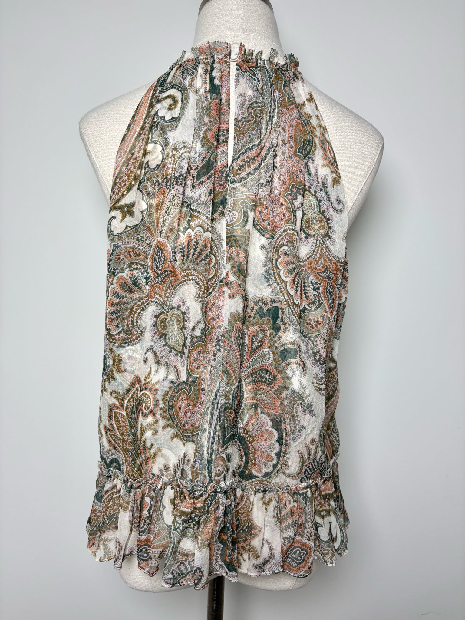 Veronica Beard 100% silk paisley print sleeveless "Renee" top with ruffle neckline and ruffle bottom detail. Pre-owned.