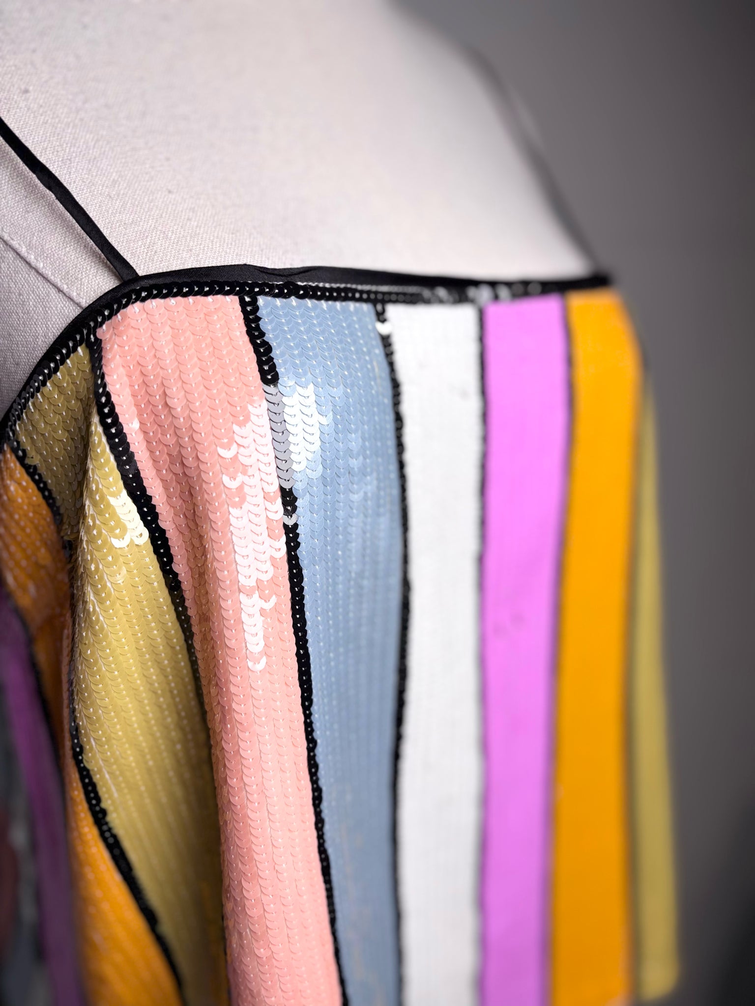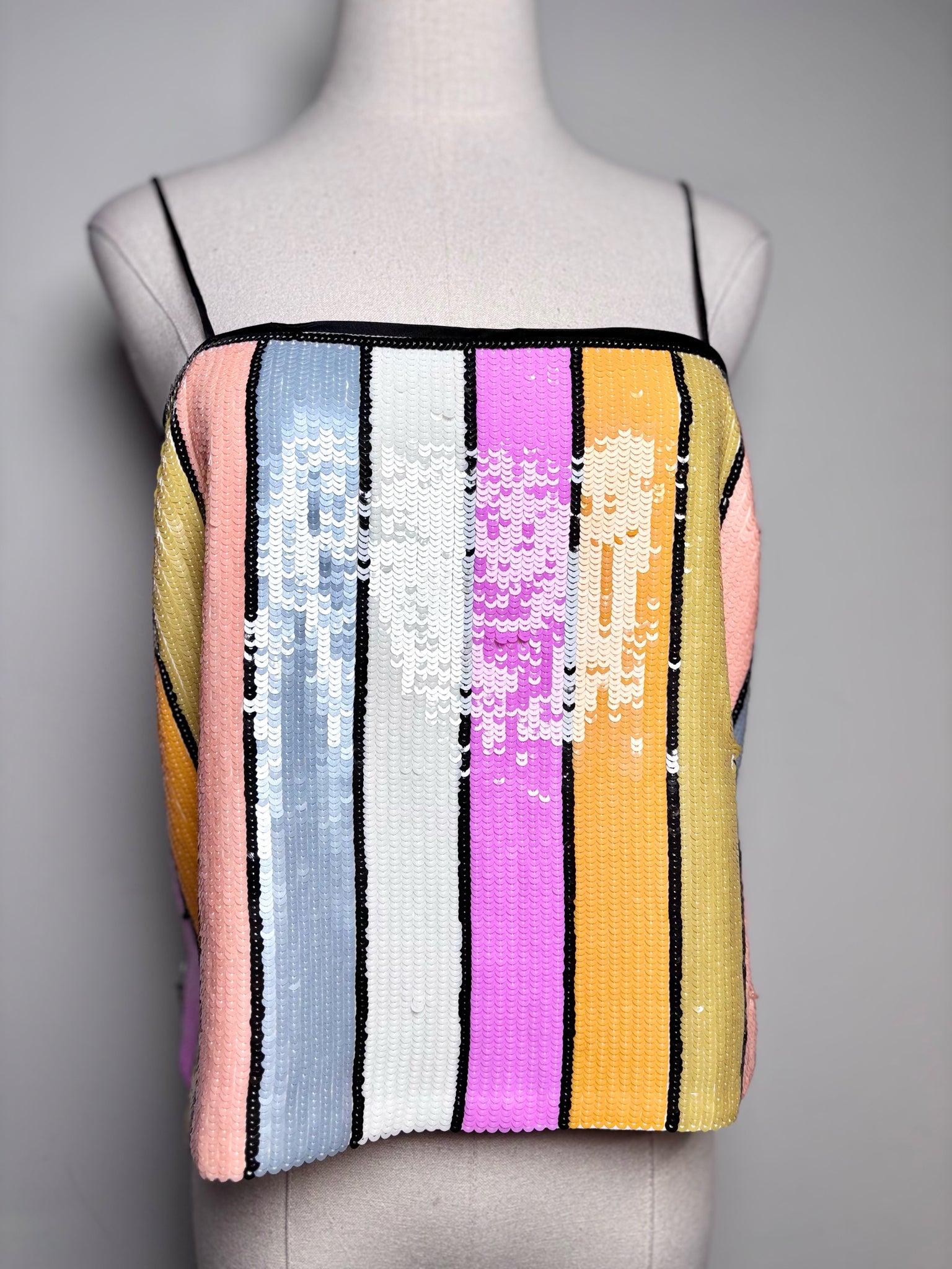 This Veronica Beard top features multi-color vertical stripes in orange, black, cream, pink, and blue, adorned with sequins for a striking, light-catching finish. Designed with black straps and a special-occasion sensibility, this Women’s Size 8 piece offers a bold yet refined statement for evening or event styling.
