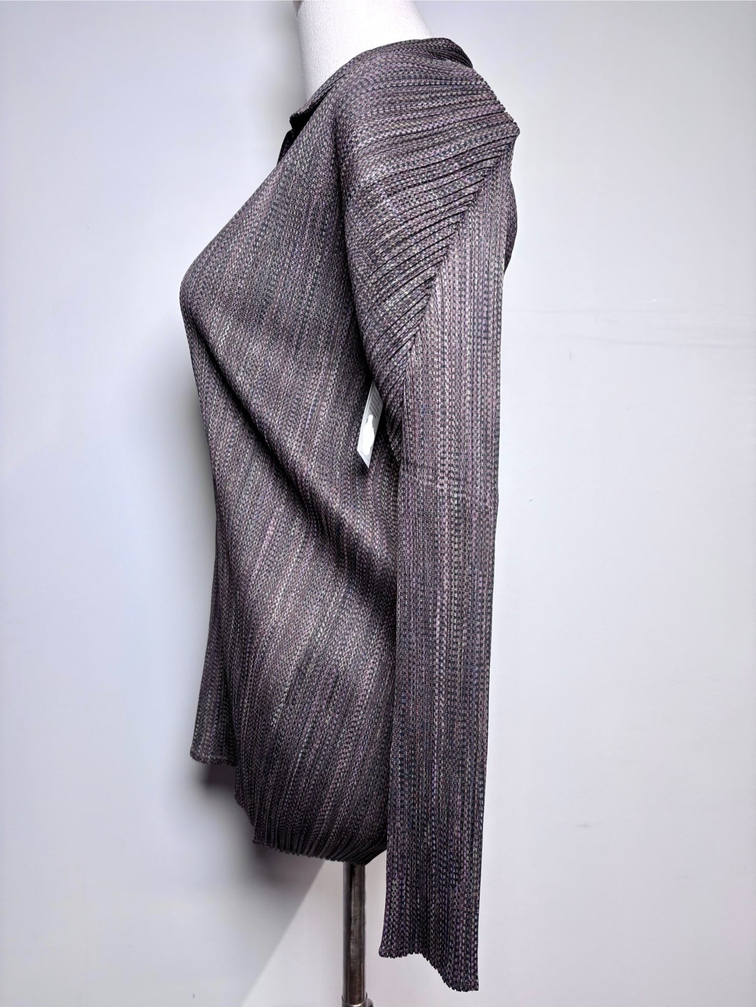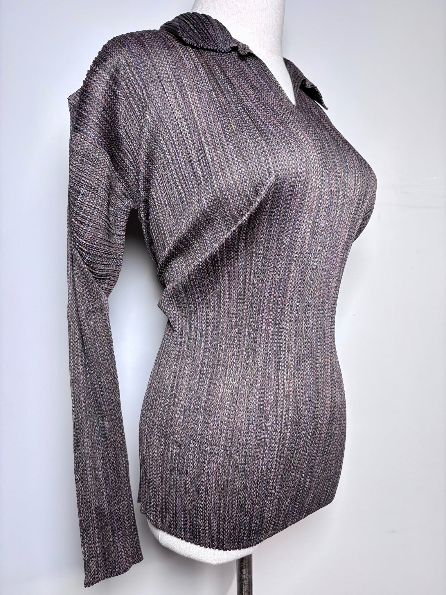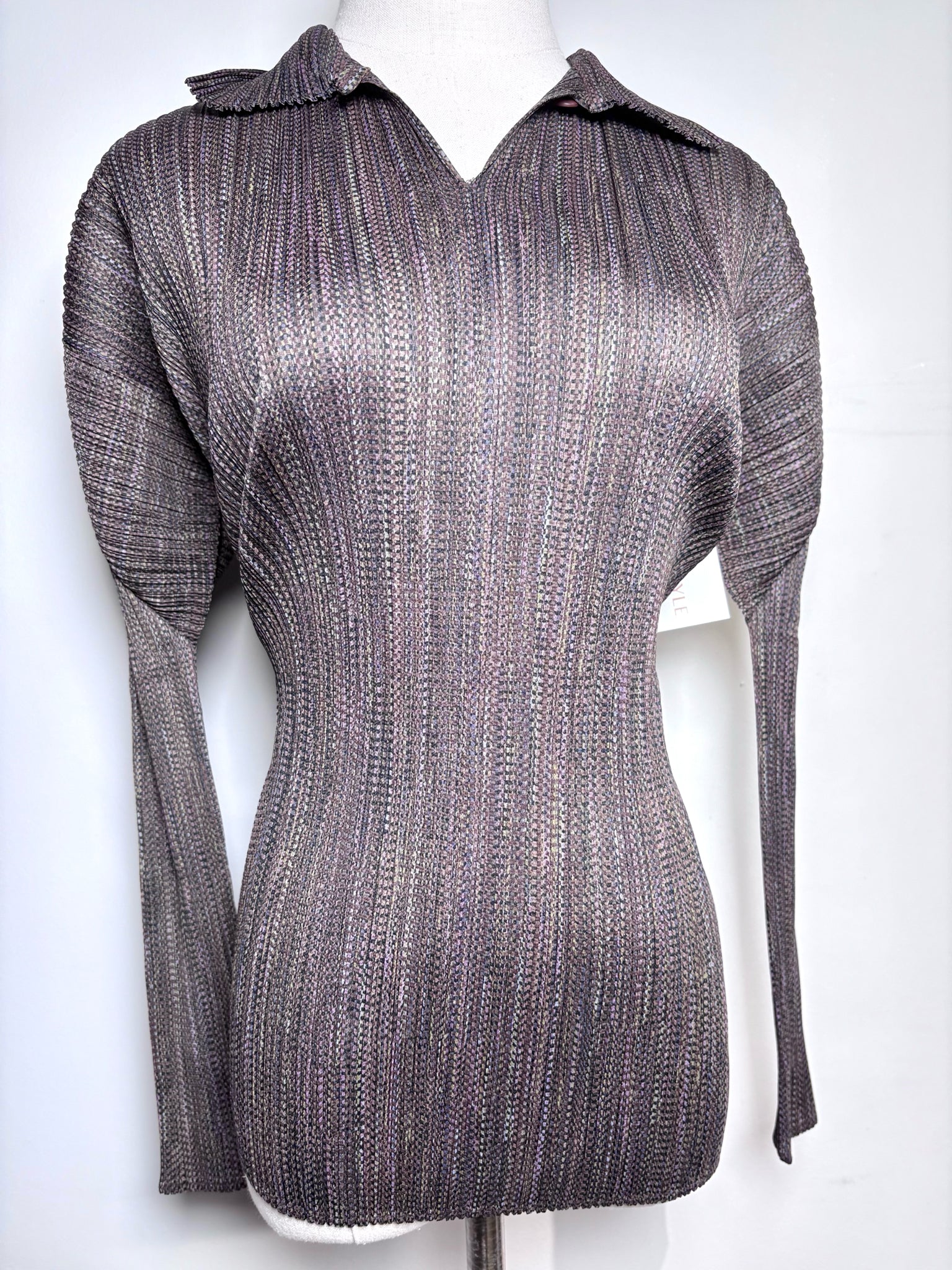 Collector’s Item and distinctly crafted, this Issey Miyake women’s top features multi box pleats with stretch construction, a V-neck with collar, and long sleeves, made in Japan and finished in a brown stripe design, offered in women’s size F (Free/One Size).