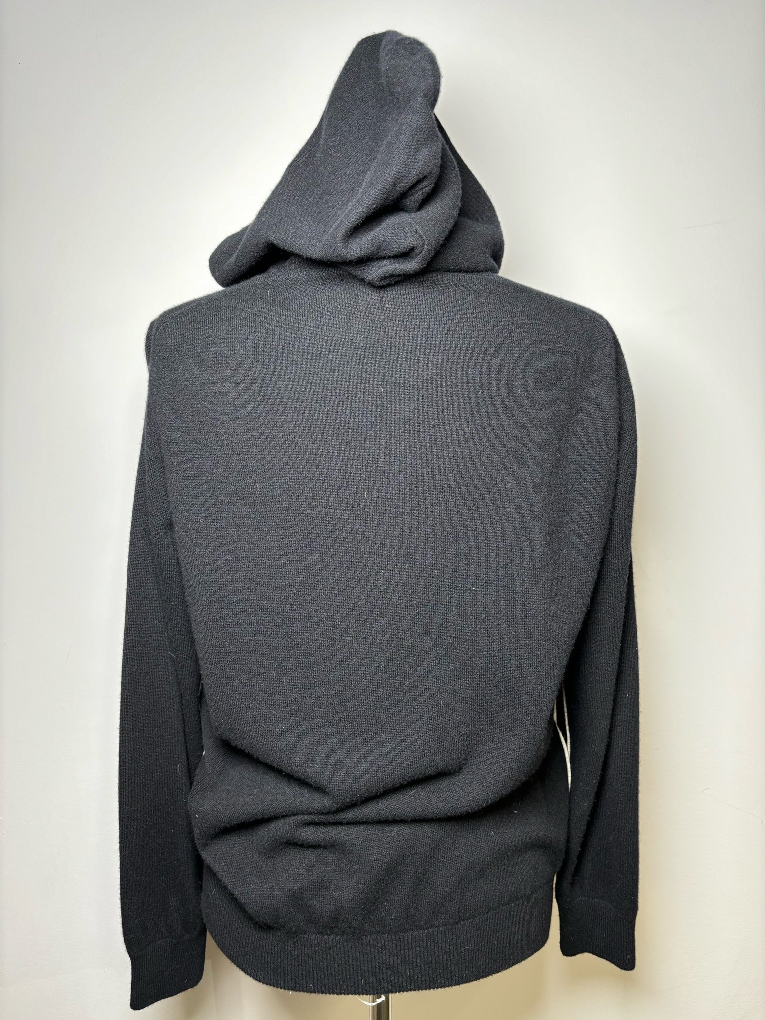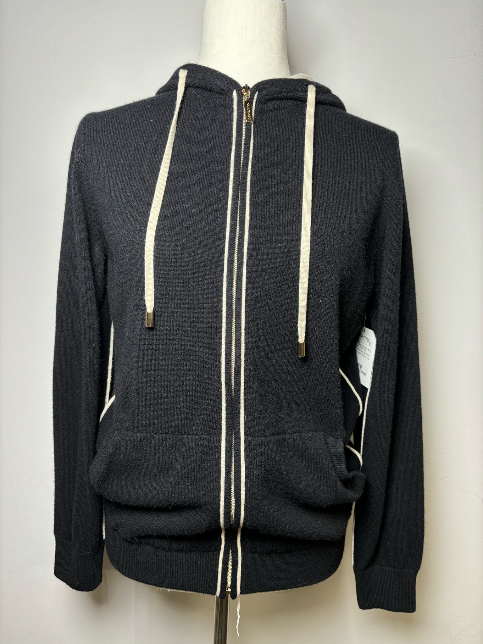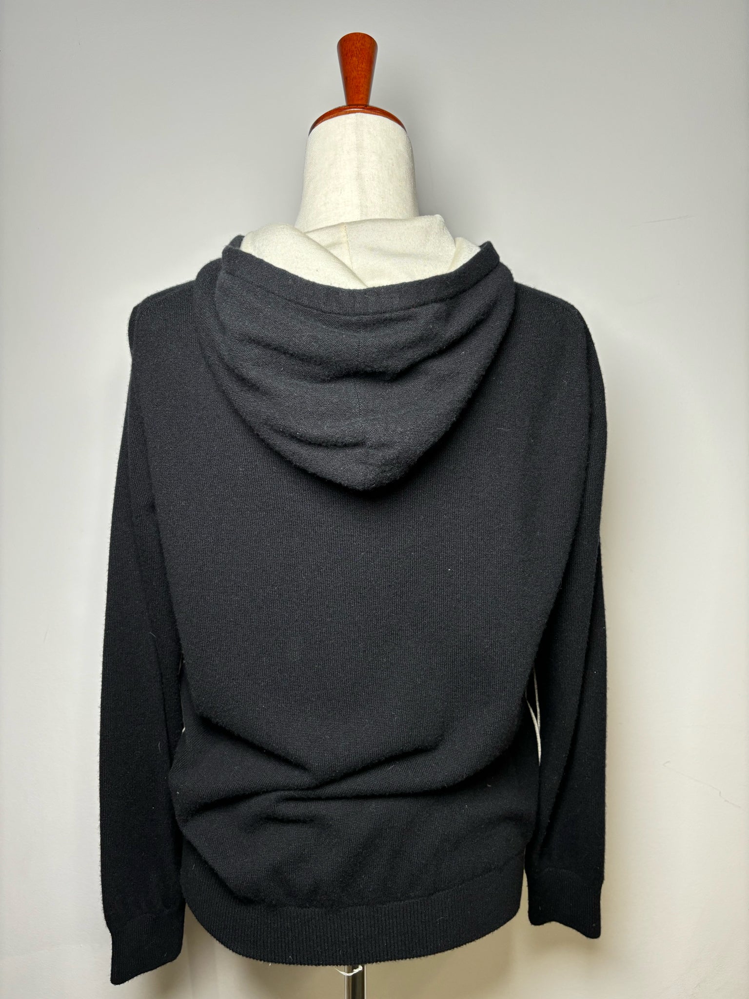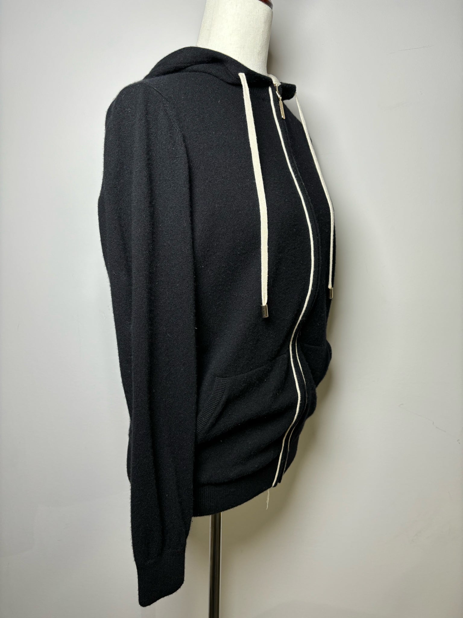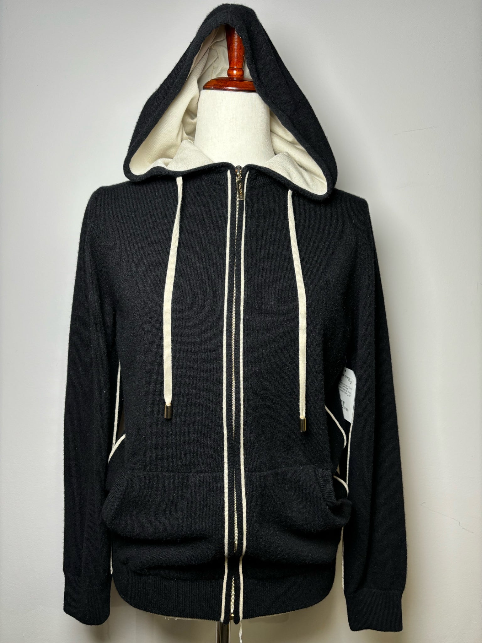 Colombo black cashmere front zip-up sweater with hood and cream piping. Pre-owned.