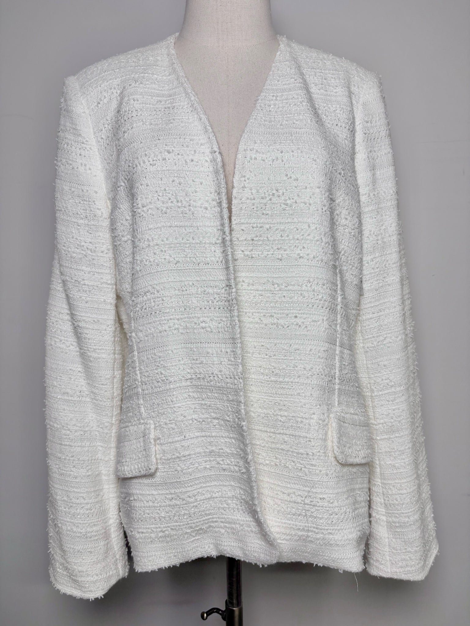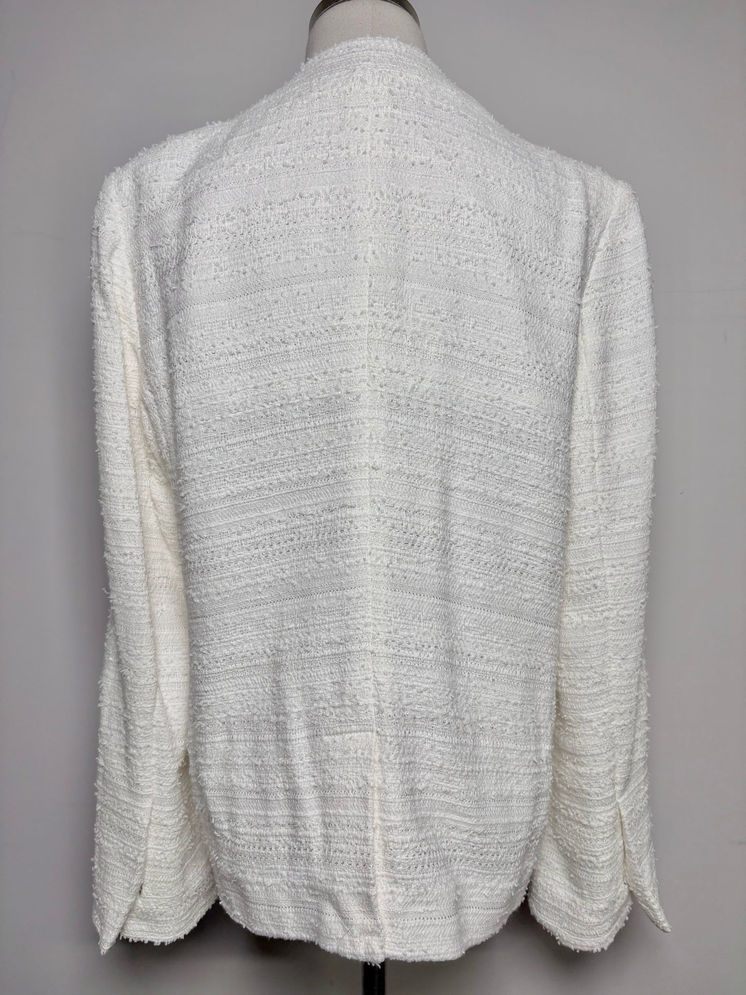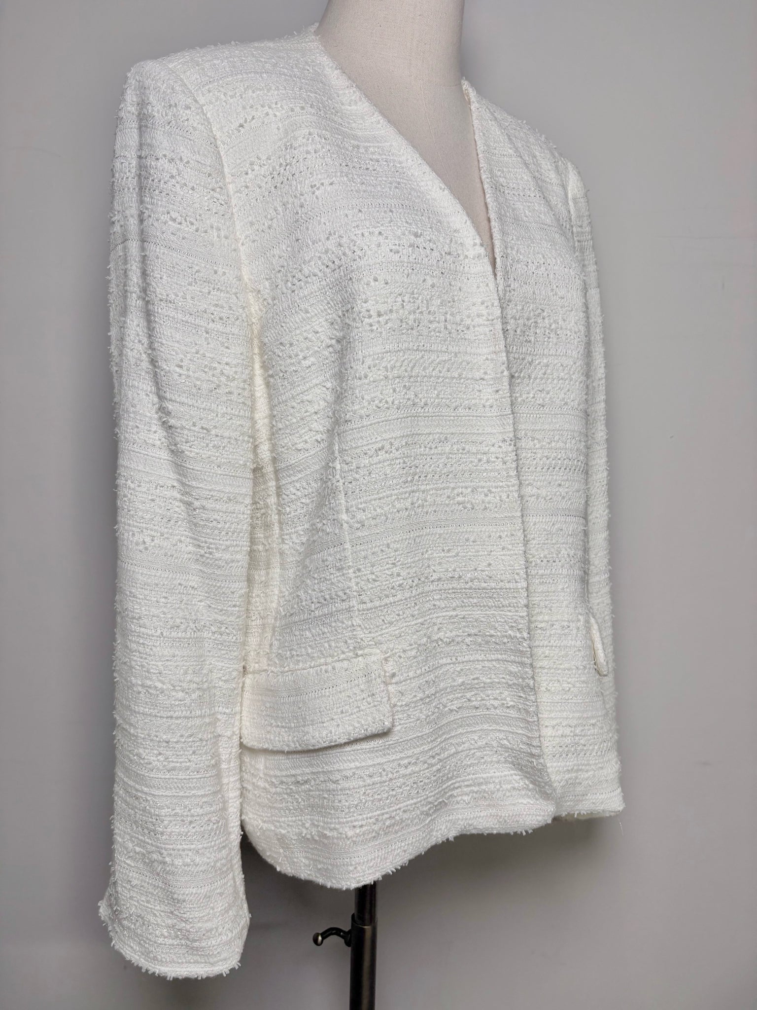 Crafted from an elegant ivory tweed cotton blend, the Kobi Halperin "Elle" jacket is an essential piece, featuring a sophisticated open-front silhouette and chic faux pockets. This stylish, timeless layer in size L offers a polished update to your luxury collection.