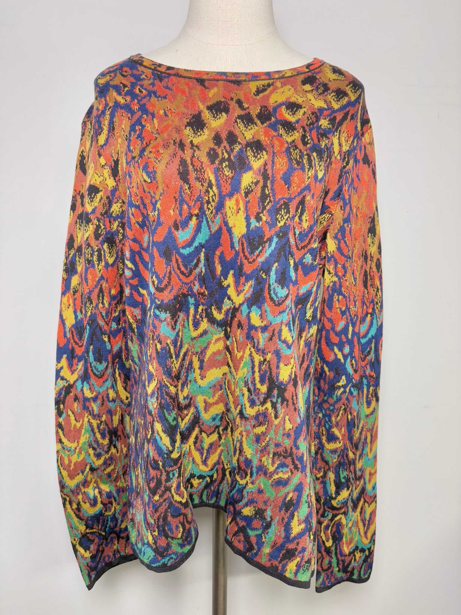 Vibrant and artisanal, this Peruvian Connection long-sleeve sweater is crafted from soft Pima cotton and features a multicolor abstract pattern in orange, yellow, blue, and green, accented with black trim. A statement knit that blends bold artistry with everyday comfort in size L.
