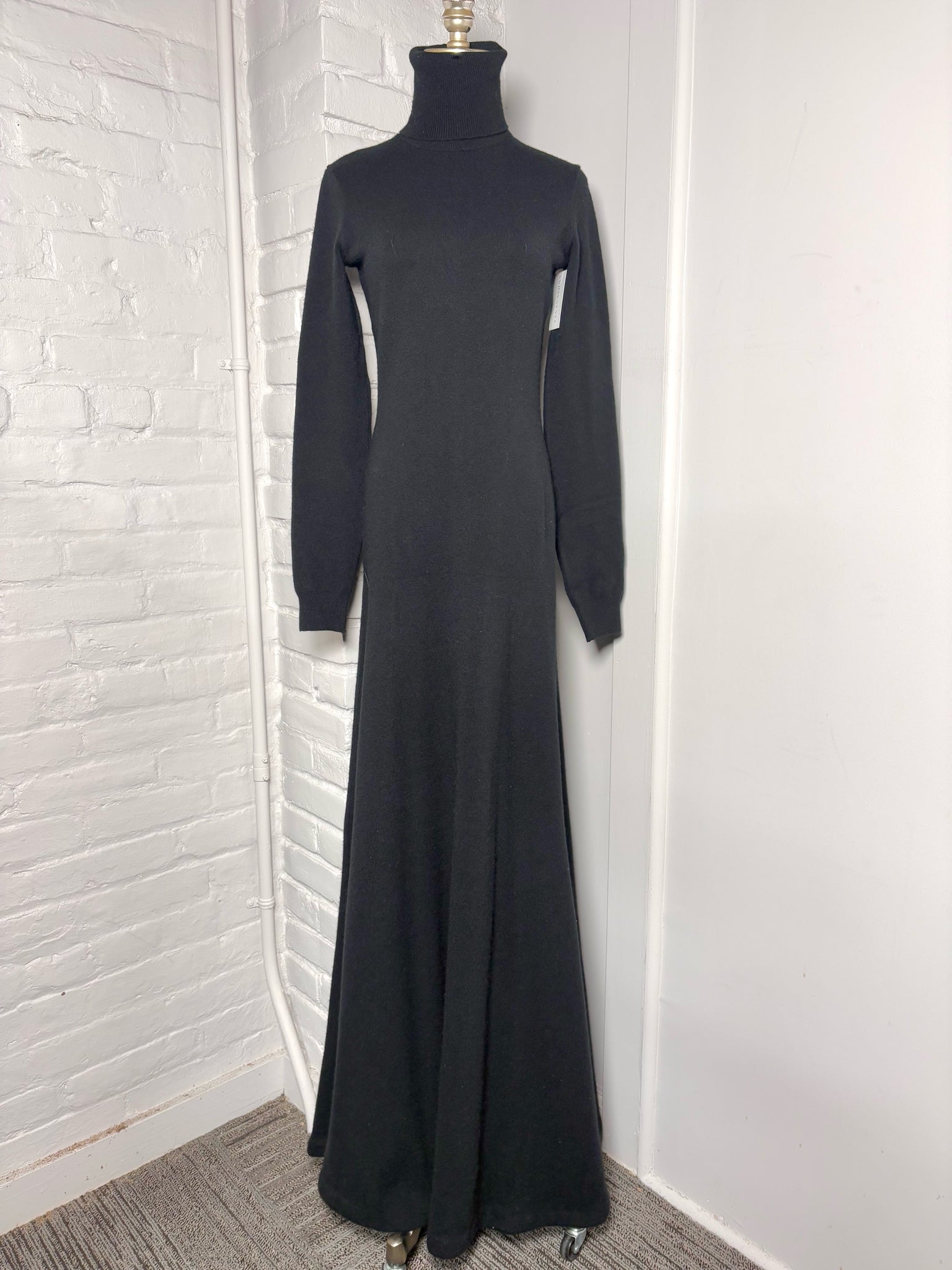Ralph Lauren Purple Label black cashmere stretch knit dress featuring a sleek turtleneck, long sleeves, and a graceful fit-and-flare maxi silhouette. Crafted in a size Large, this piece embodies elevated minimalism with the brand’s signature refined craftsmanship and luxurious softness.