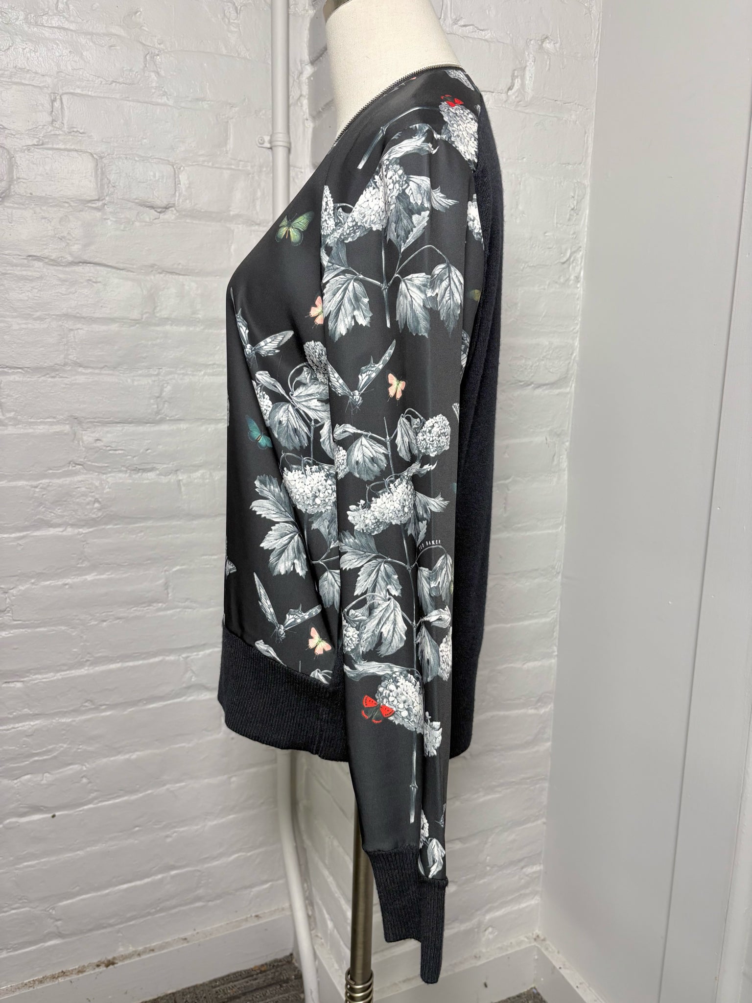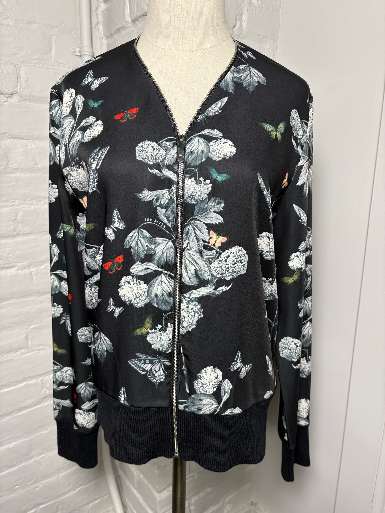 Ted Baker black, gray, red and white floral with butterflies pattern zip up jacket in a size large.