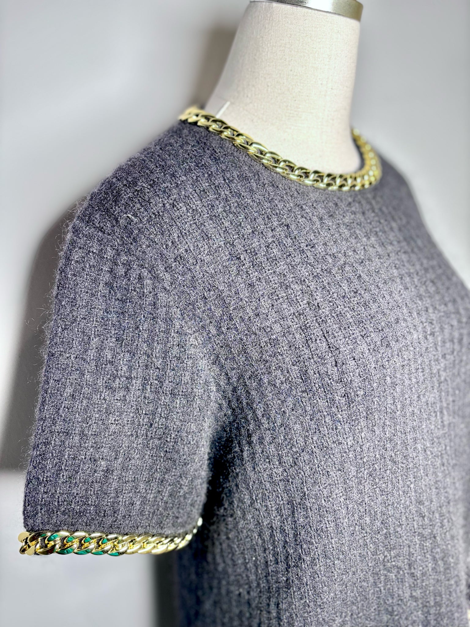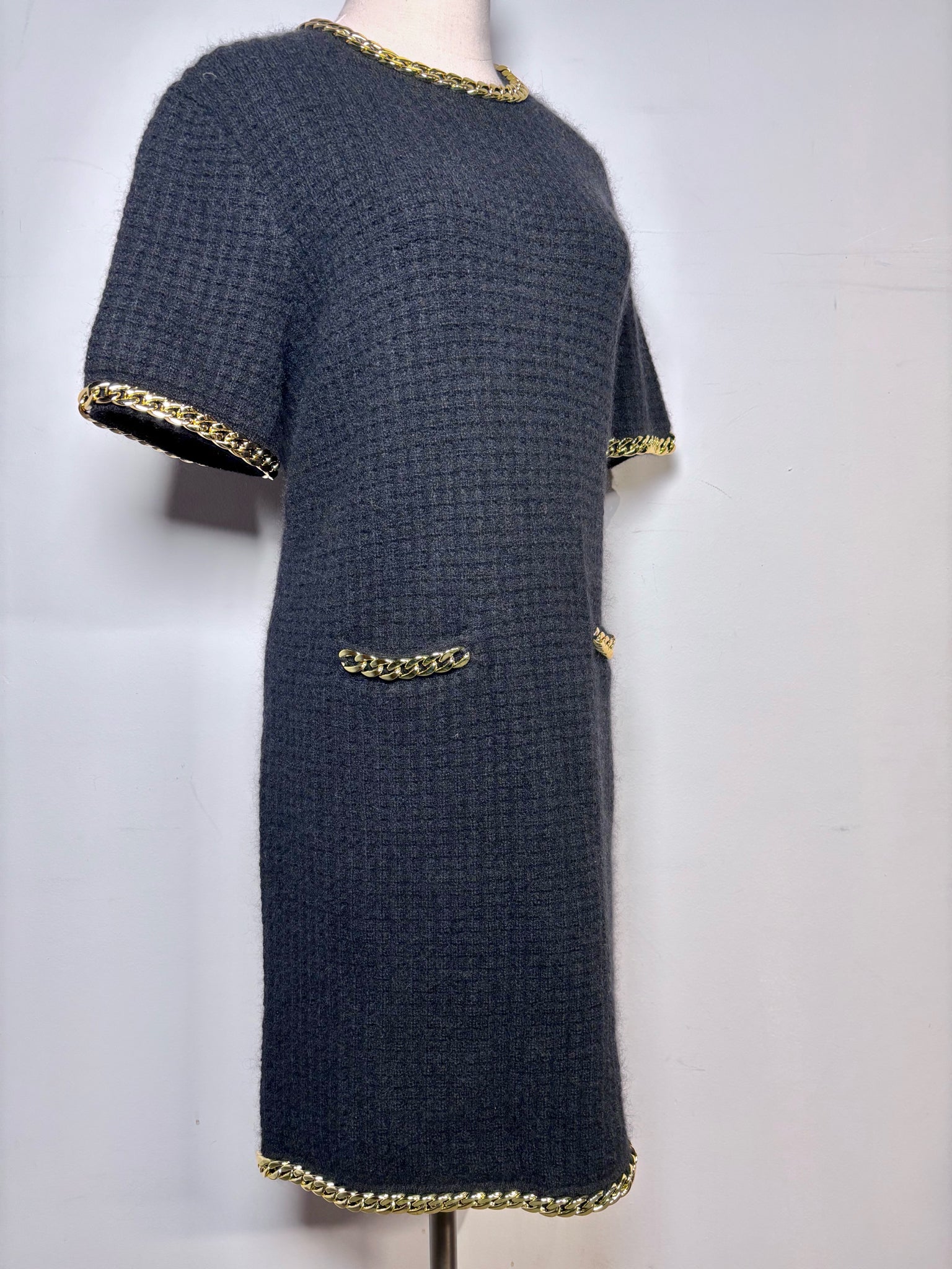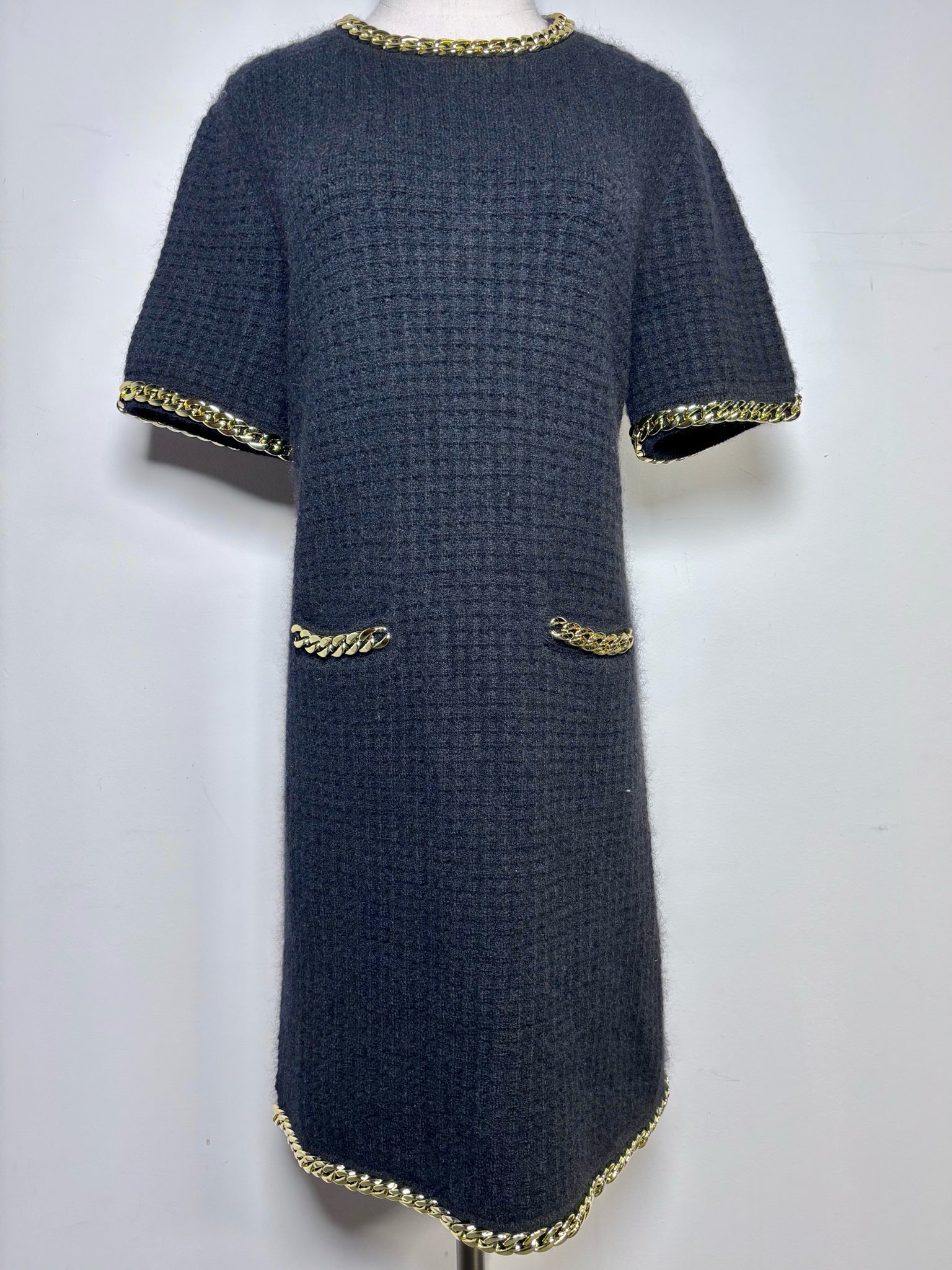 This Tory Burch shift dress is crafted in black wool knit and features a round neckline, short sleeves, and a fully lined interior for a smooth, structured fit. Gold-tone chain detailing at the neck, sleeves, and pockets adds a refined, signature finish. Brand new with tags, this Women’s Size L dress offers a polished, versatile silhouette suited for both work and evening wear.