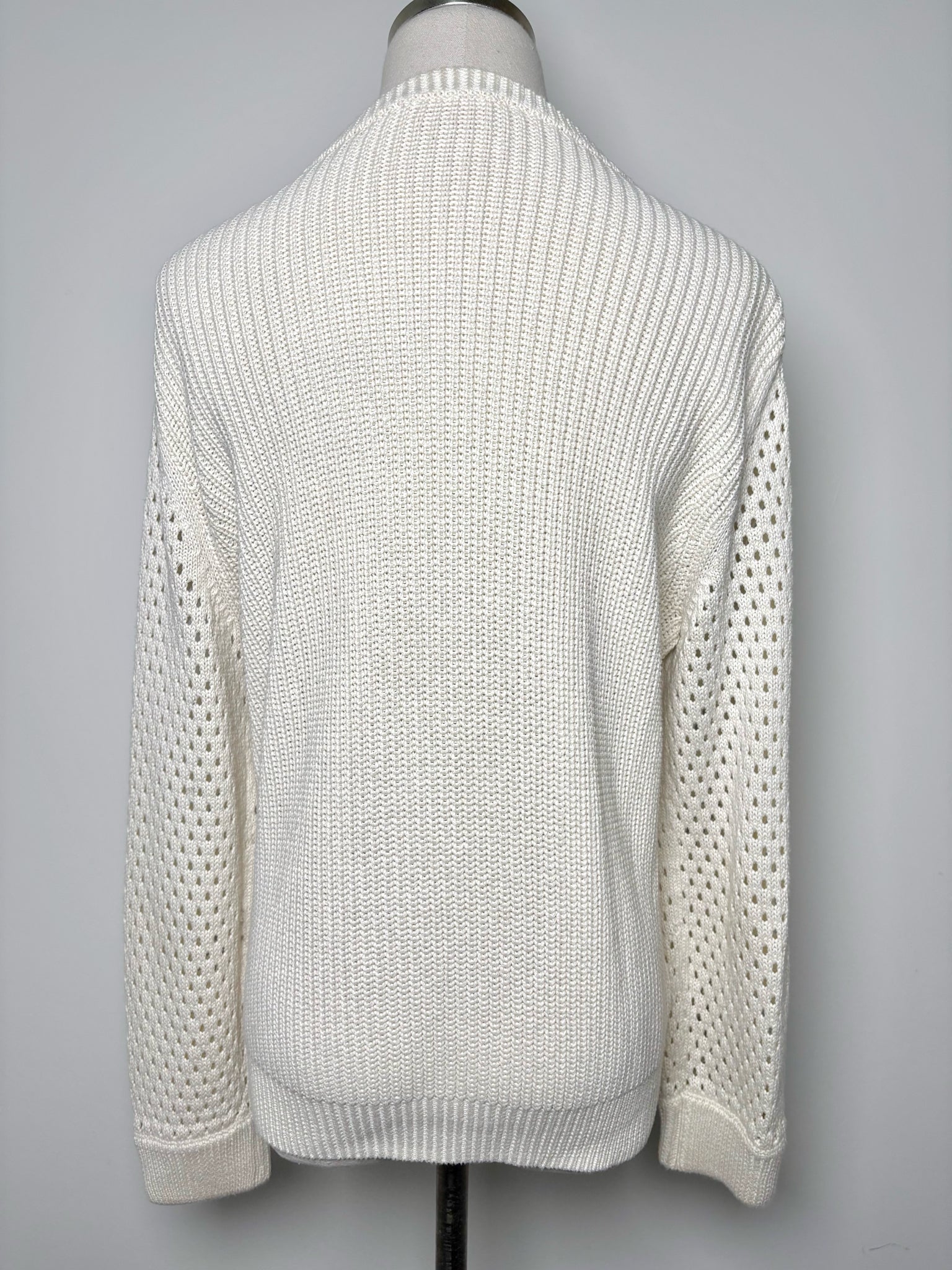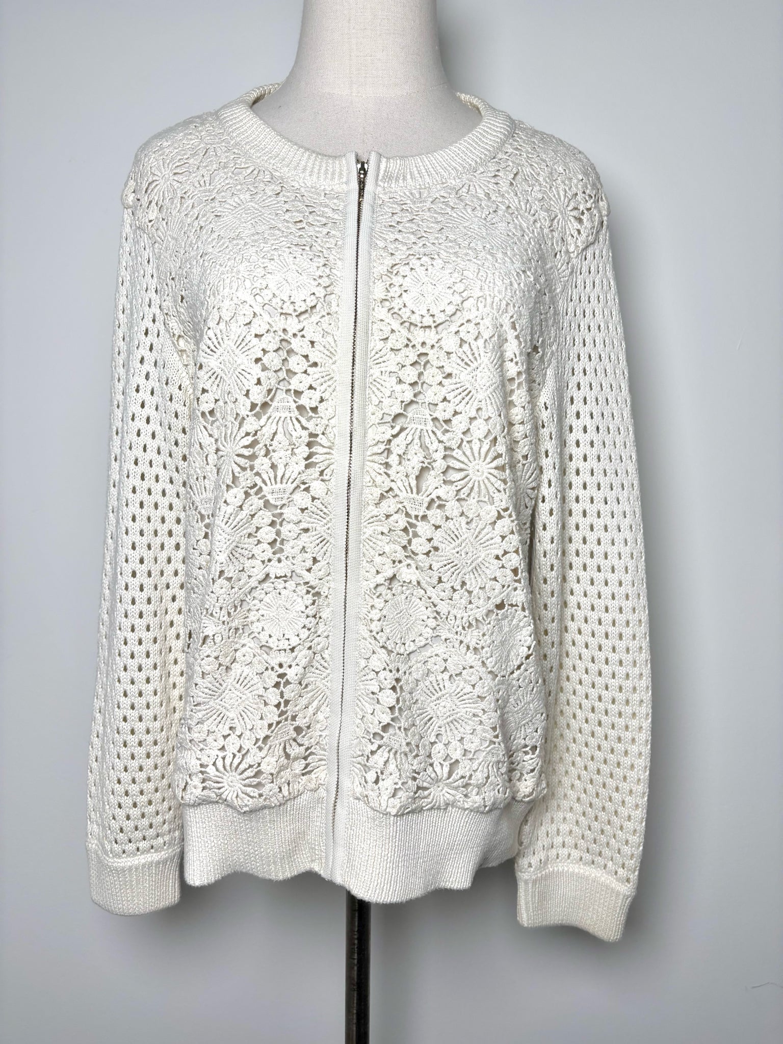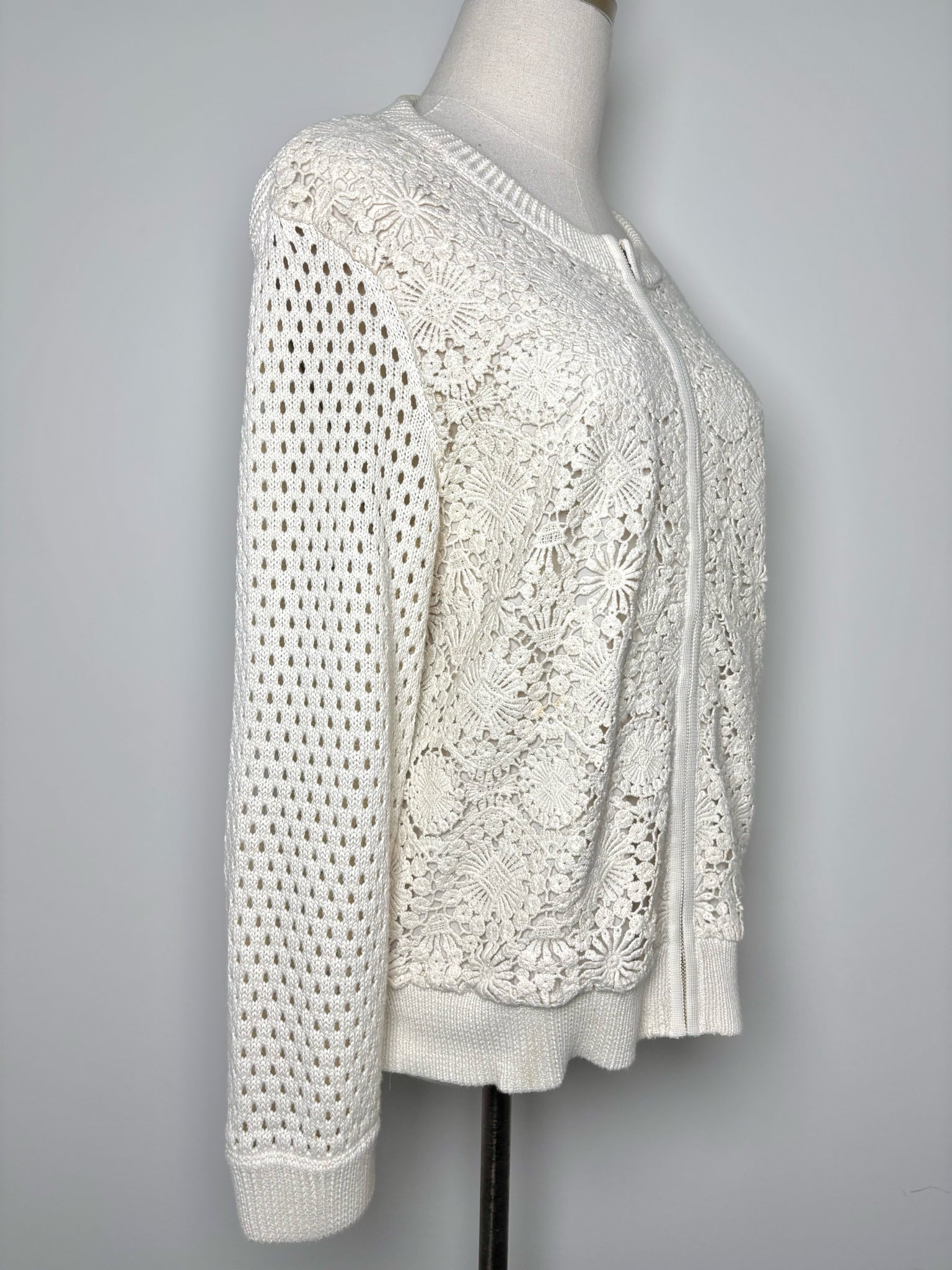 Tory Burch cream crochet knitted jacket with front zipper. Pre-owned.