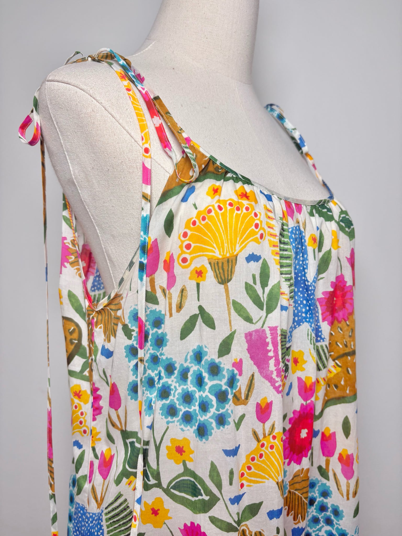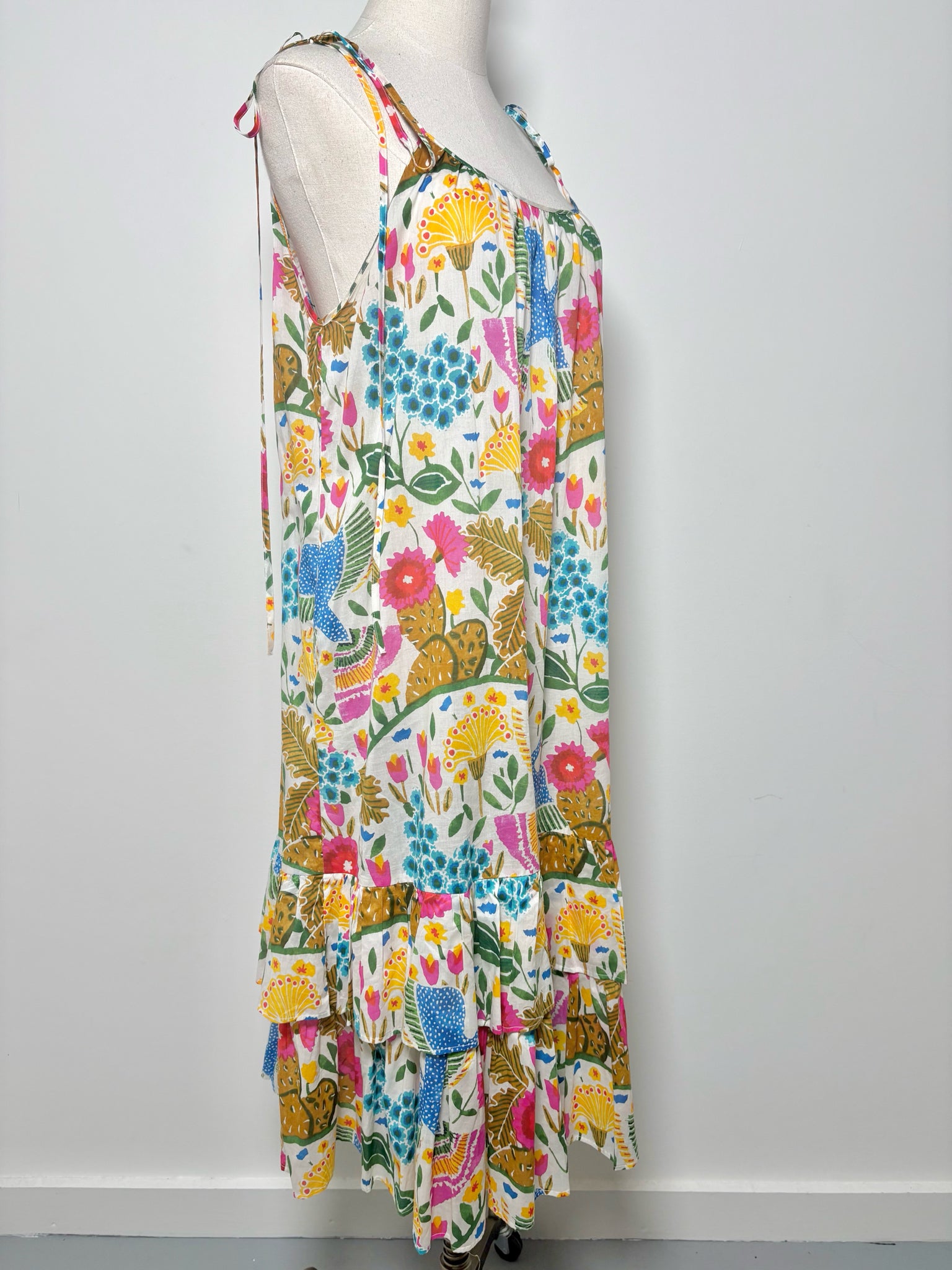 La DOUBLE J. colorful floral pattern a-line midi ruffled hem dress with tie spaghetti straps that tie. It is one size only and has pockets.