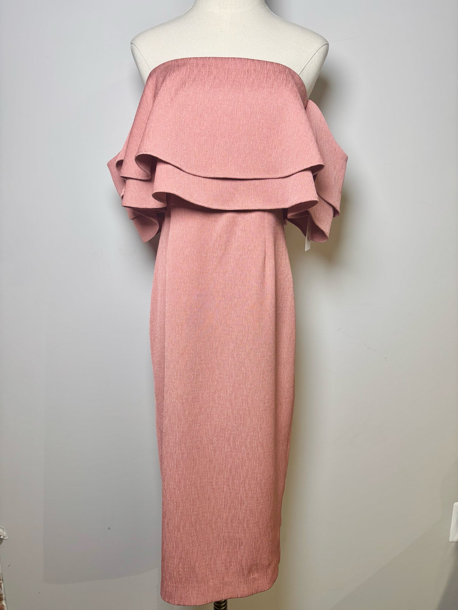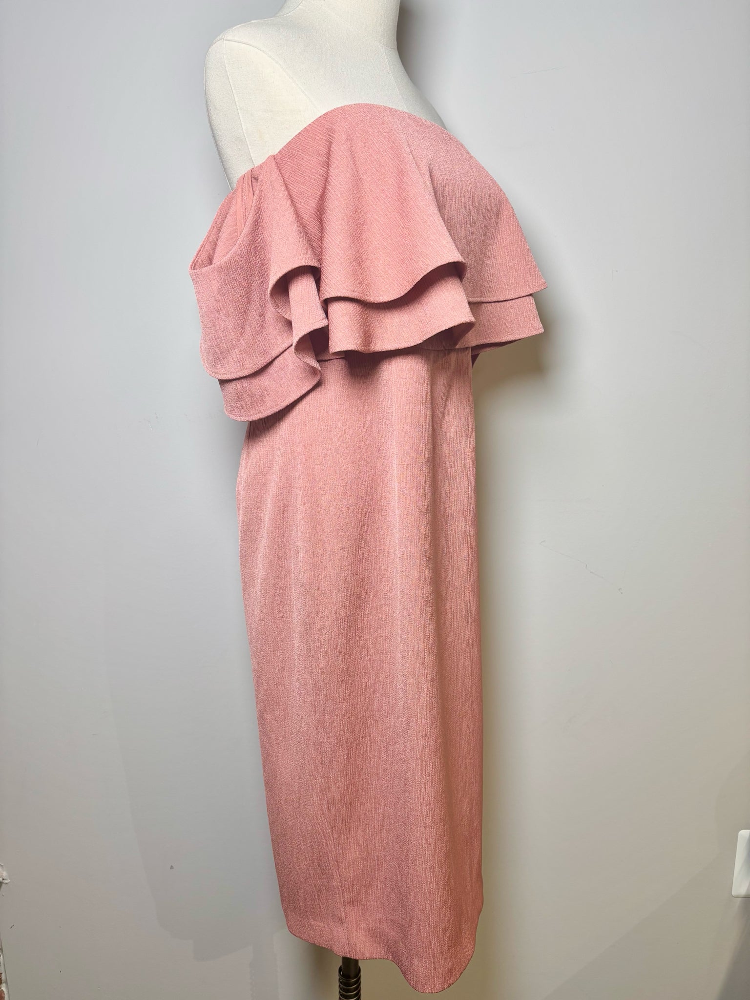 Keepsake blush pink off the shoulder ruffles/ tiered-flounce bodice overlay, conceals zip back closure. It is lined. Pre-owned.