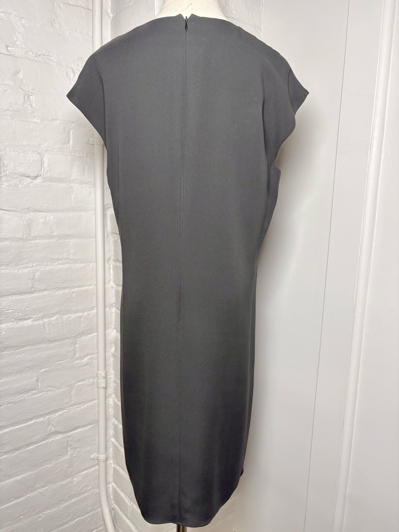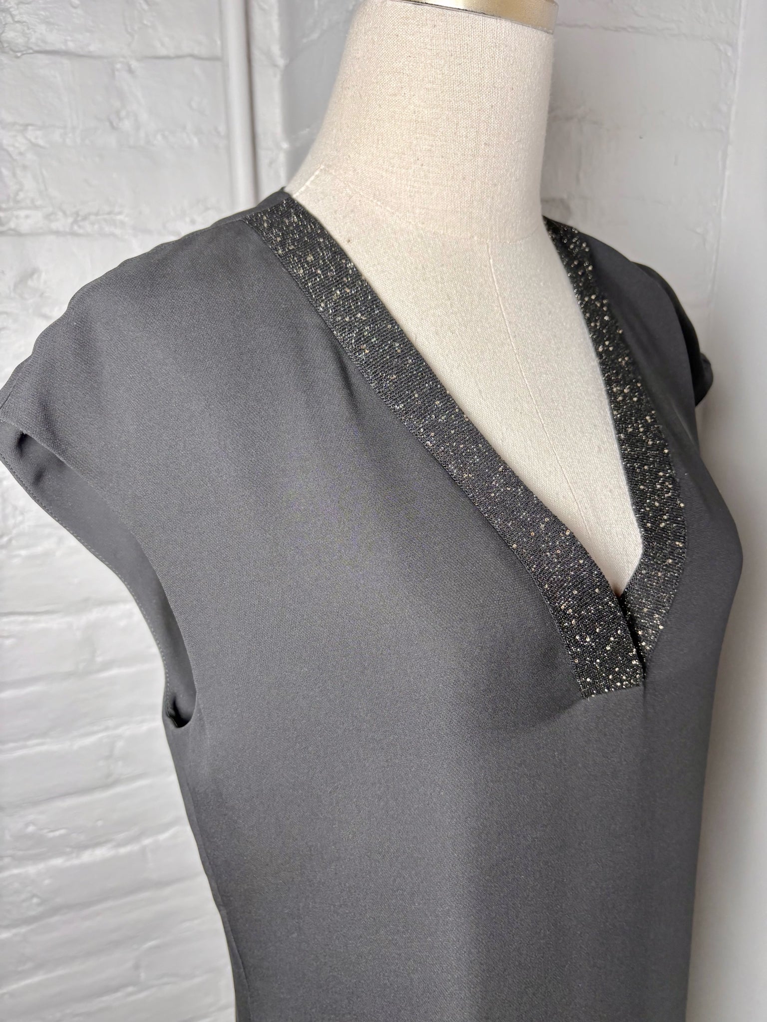 Lafayette 148 black v-neck sleeveless shift below knee dress with gold glitter trim in a size medium.
