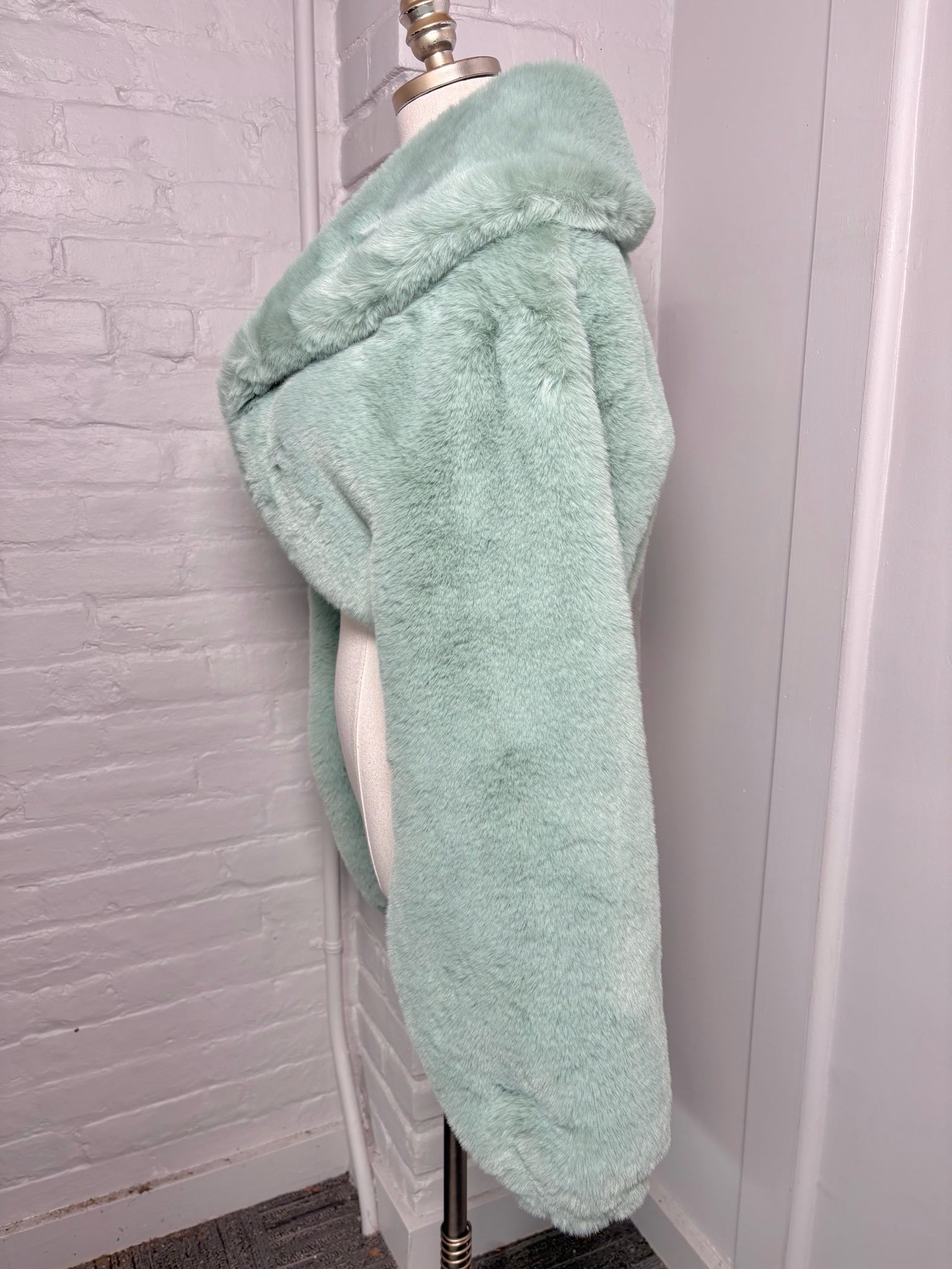 Naked Wardrobe teal faux fur cropped shrug — a statement piece that blends bold color with luxe texture. This plush, soft-touch shrug features an exaggerated collar and elasticized cuffs and hem for a chic, sculpted fit. Perfect for layering over dresses or denim for an effortlessly glamorous finish. Comes in a size medium.