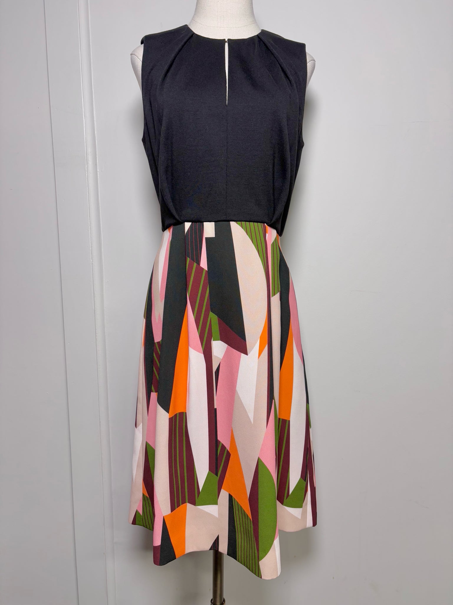 Elegant and contemporary, this Paul Carroll dress features a sleek black sleeveless bodice paired with a fit-and-flare skirt in a striking geometric print. A polished special-occasion piece in size M that blends modern artistry with timeless silhouette.