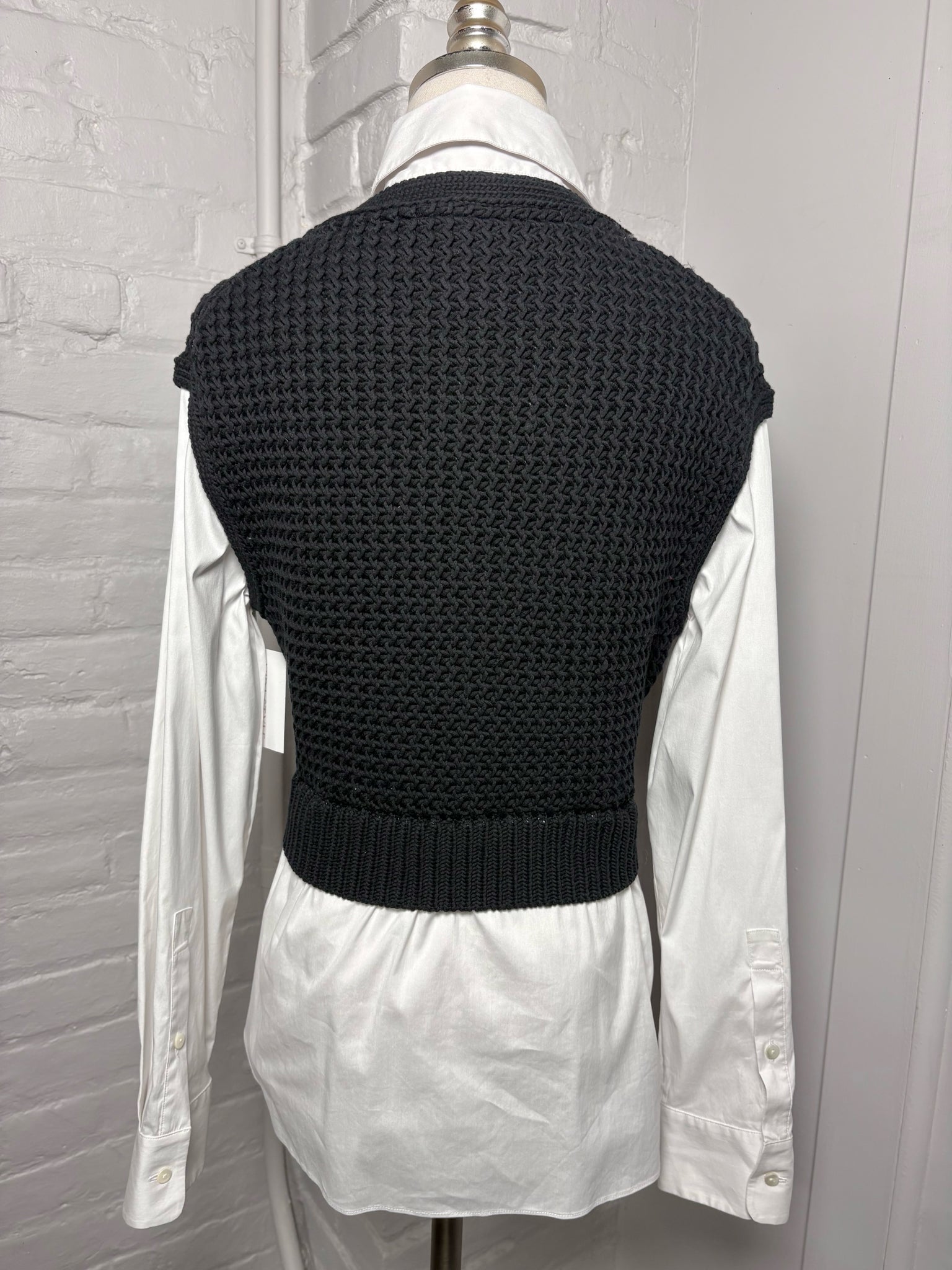 Theory black knit sweater vest with white button down layered under in a size medium.
