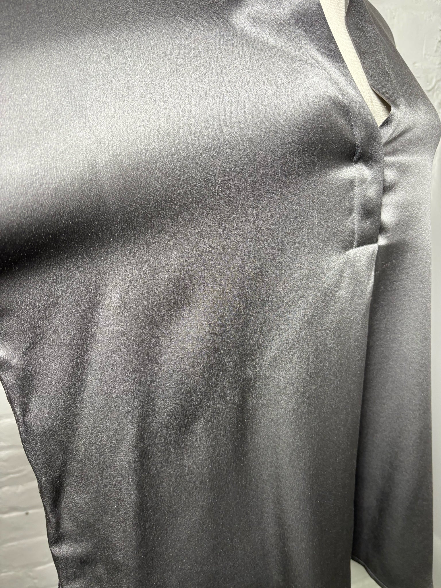Vince shiny gray/silver silk high low quarter button long sleeve blouse in a size medium. It has very small piling, priced as-is.