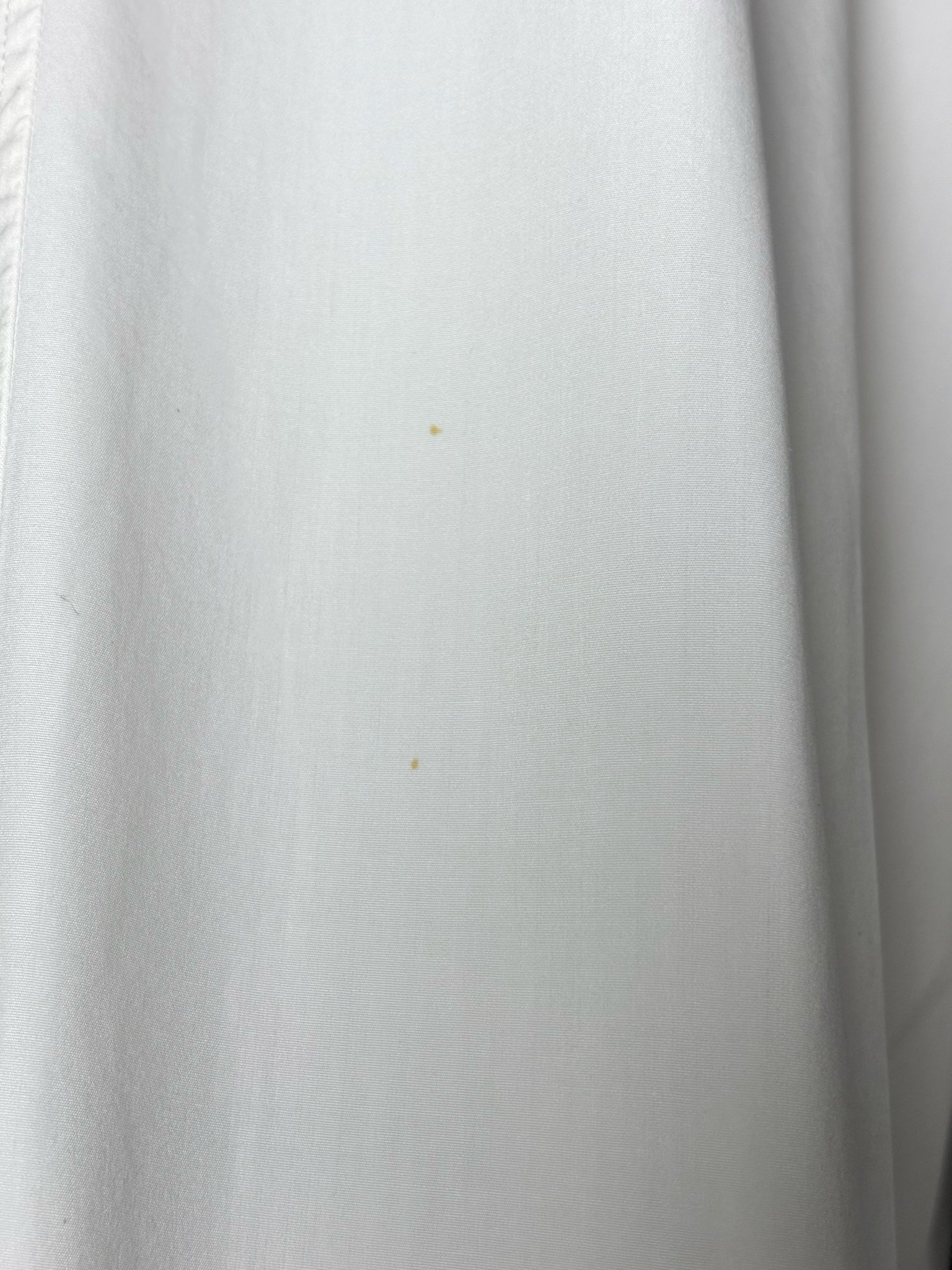 This vintage Yohji Yamamoto shirt features a crisp white cotton construction with a boxy silhouette, long sleeves, a minimalist small collar, and side button tab details for a subtle architectural touch. A rare archival piece that embodies the designer’s avant-garde tailoring. Note: there are two tiny dot stains on the back and small holes on the right shoulder — priced as is.