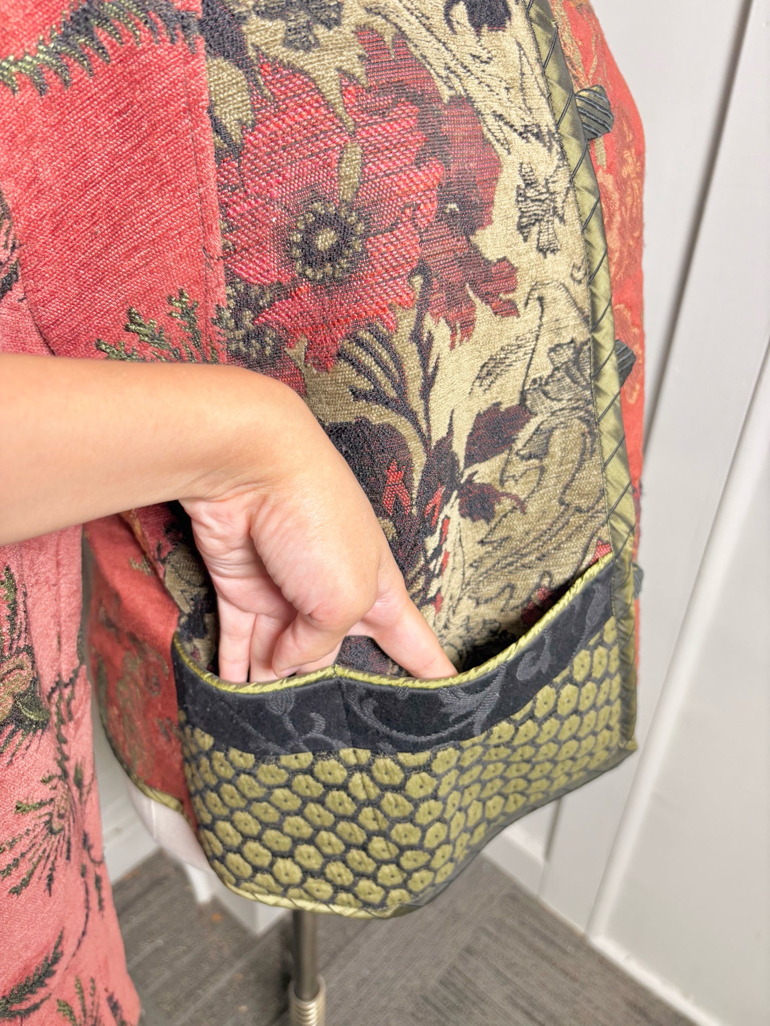Mary Lynn O'Shea olive green, red, and black jacquard asian inspired handmade jacket in a size P.