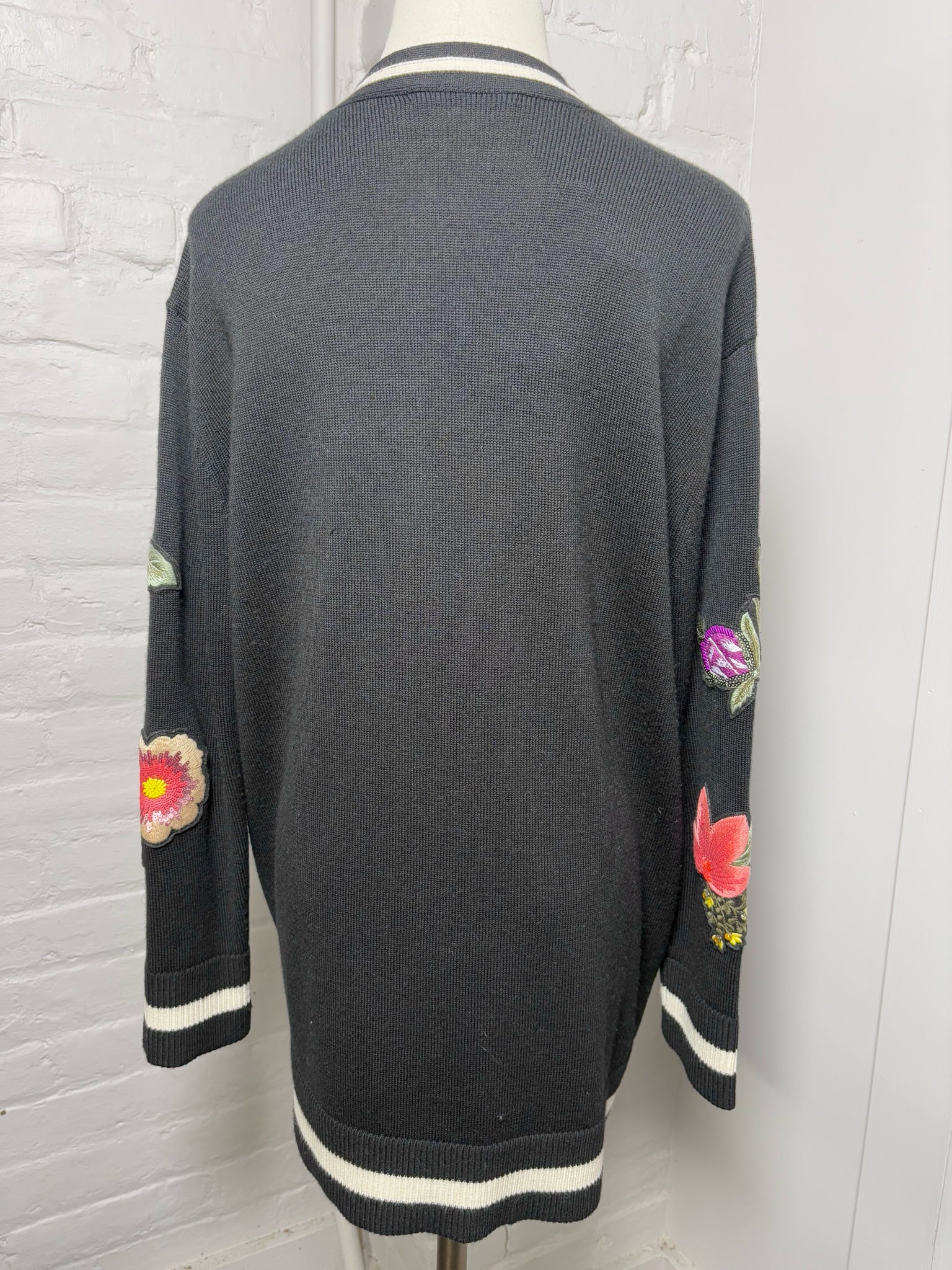 Alice + Olivia black oversized long V-neck cardigan adorned with intricate embellishments, beads, embroidery, sequins, and accent buttons. This size S statement knit delivers a luxe, hand-detailed look with effortless sophistication.