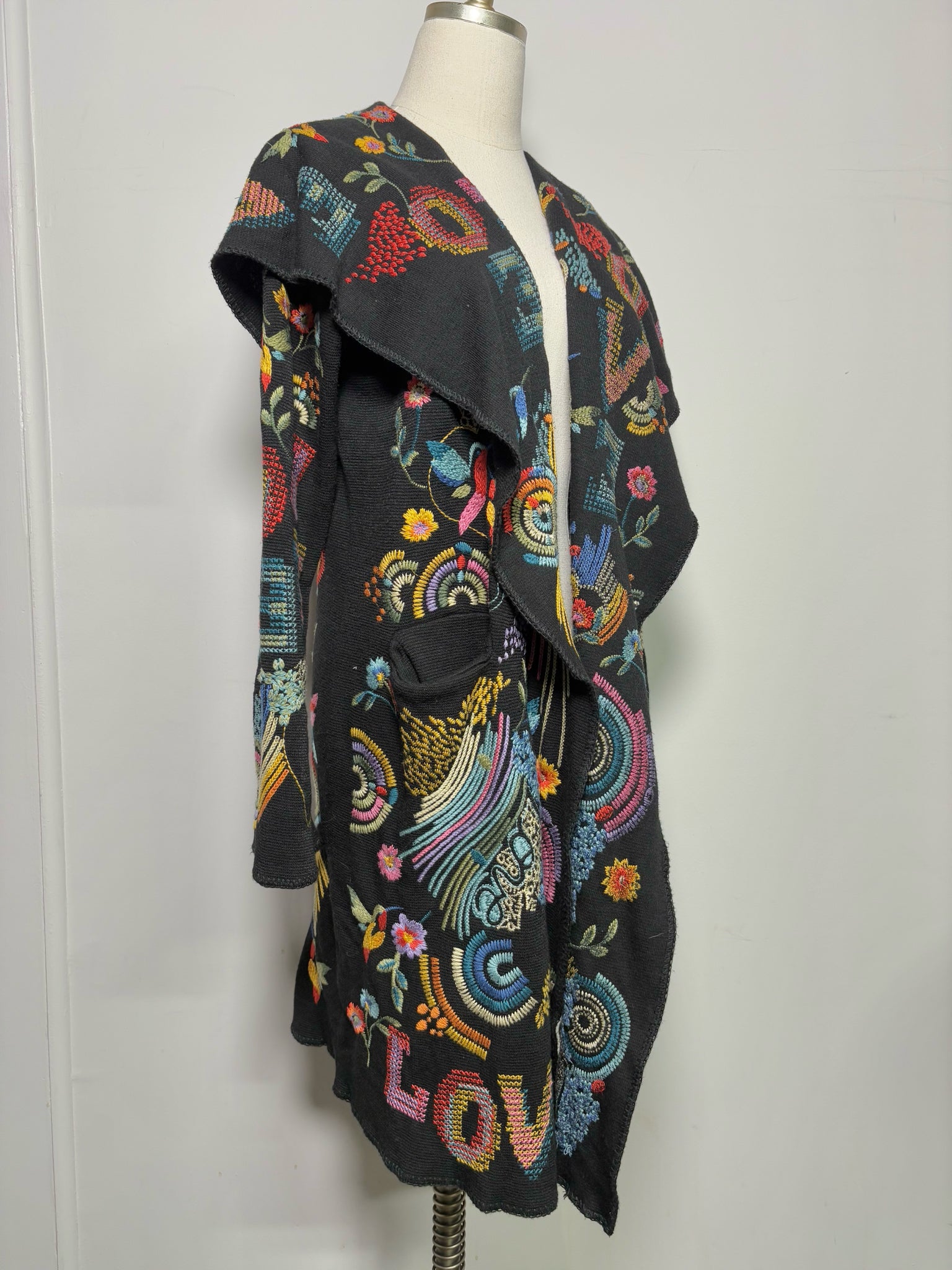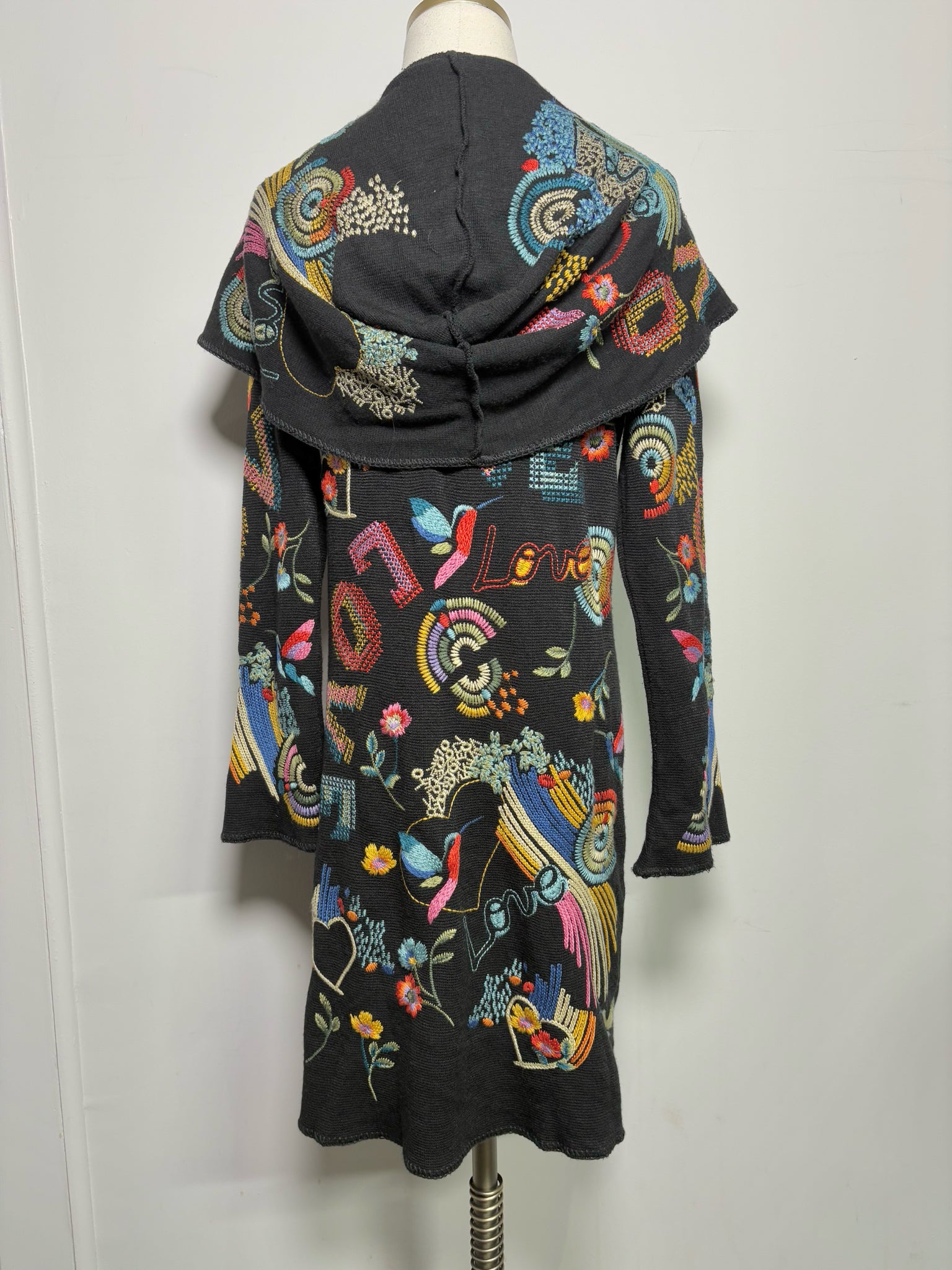 Whimsical and vibrant, this Johnny Was “Biya Duster” cardigan features multicolor abstract embroidery of rainbows, flowers, and the word “LOVE” on a black base. Designed with an attached hood and open front, it offers a playful, bohemian layering piece in size S.