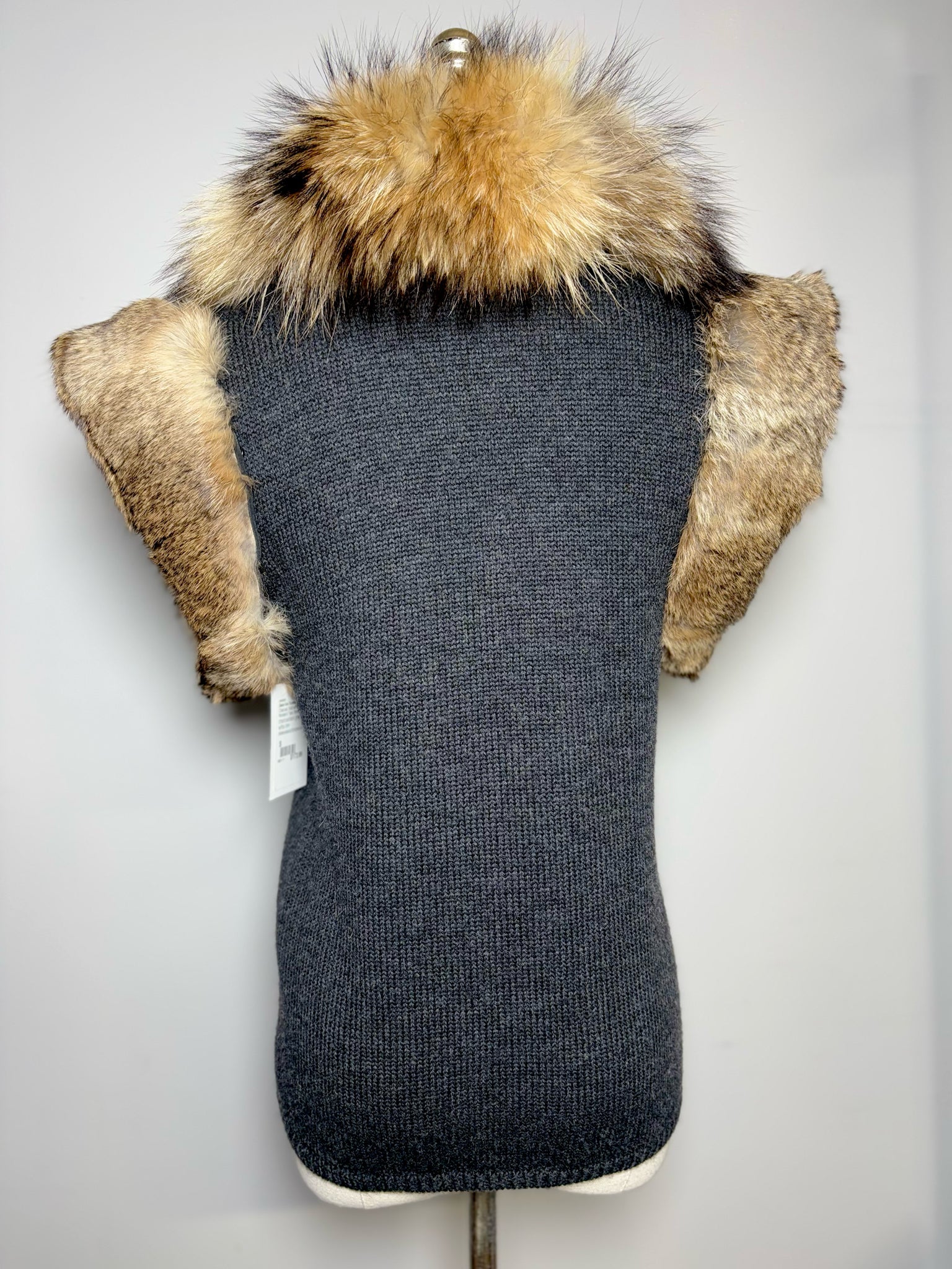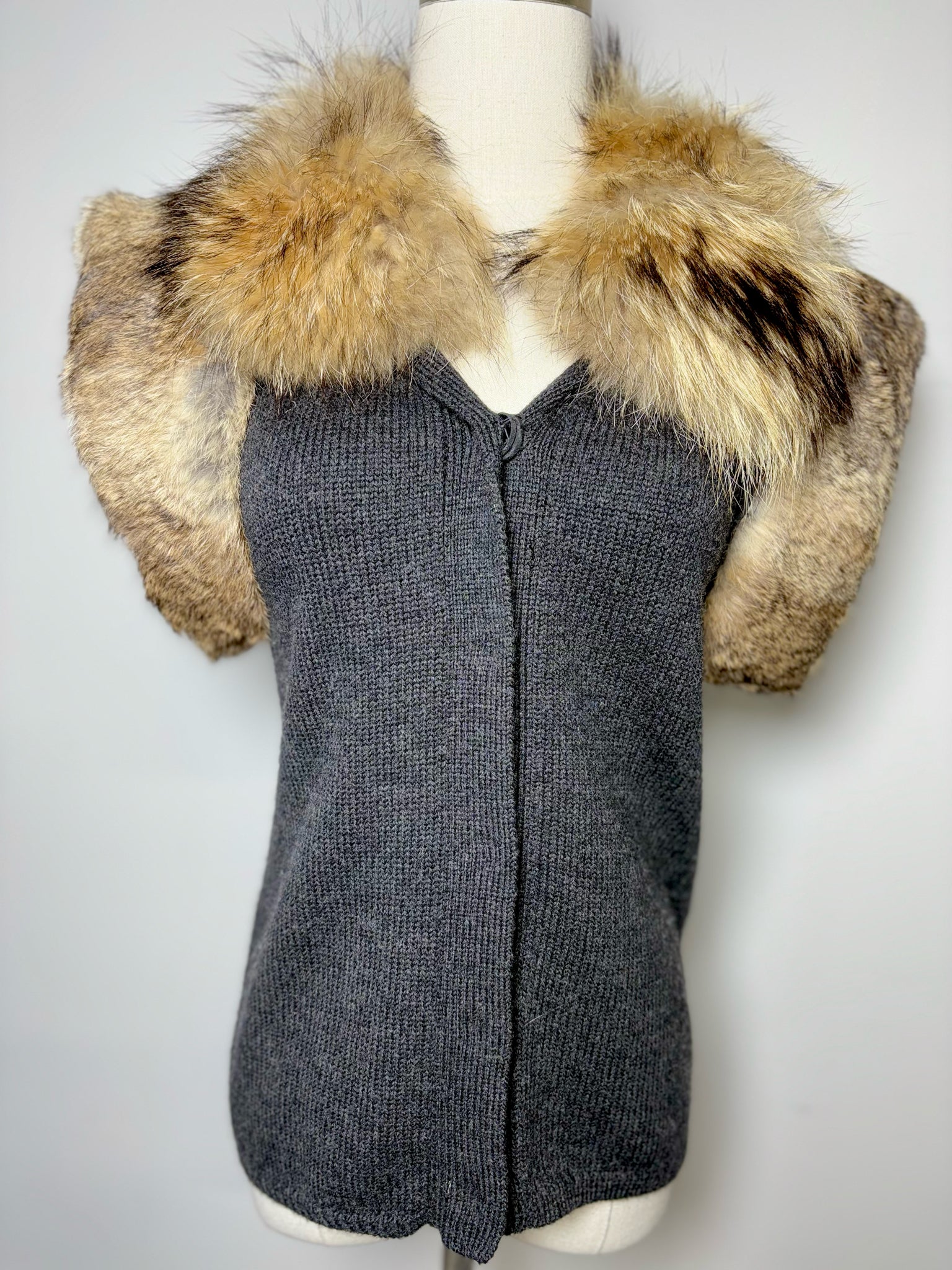 Women Size S Diane Von Furstenberg Charcoal Solid w/Fox Trim Wool Blend Sweater