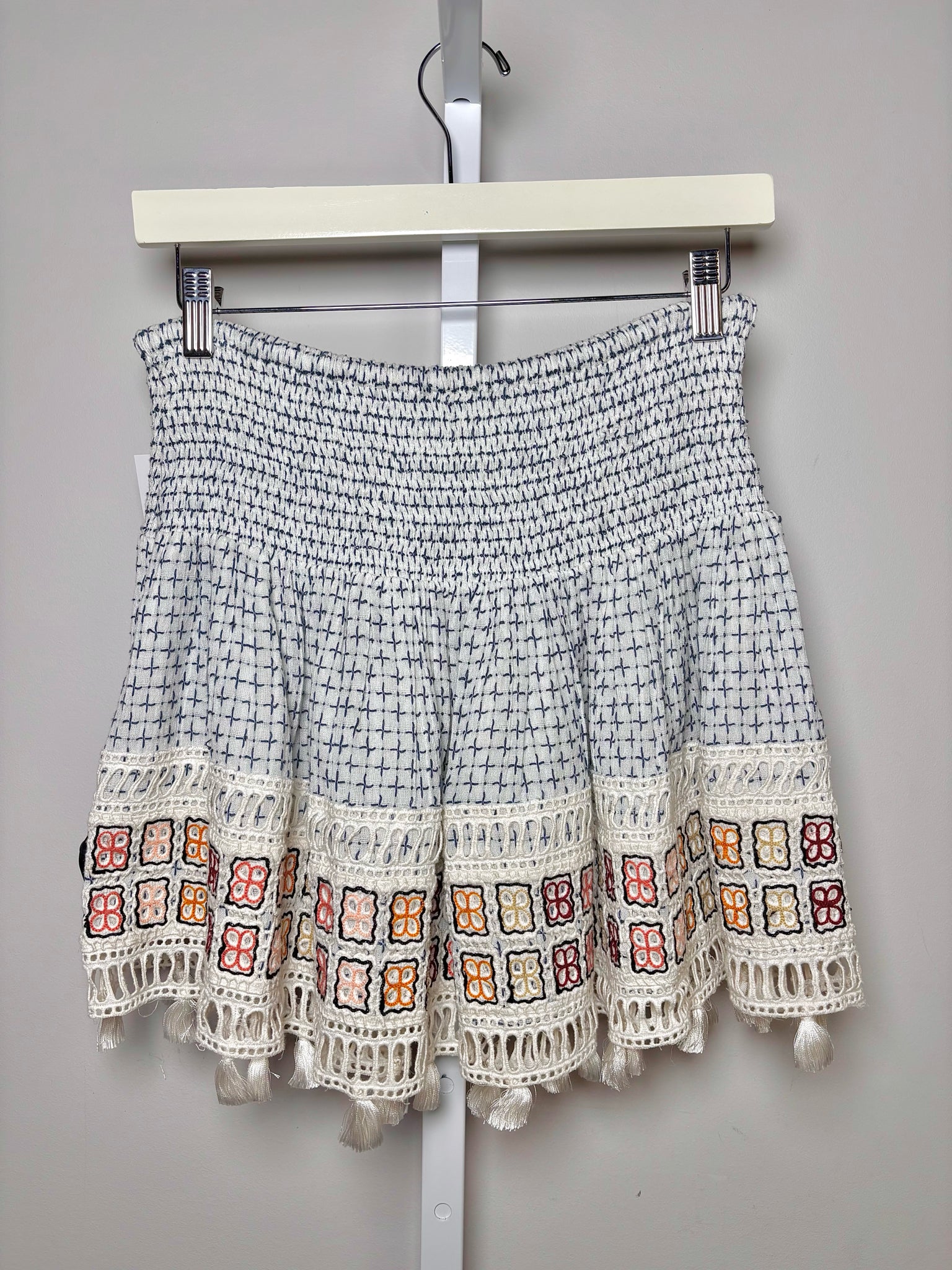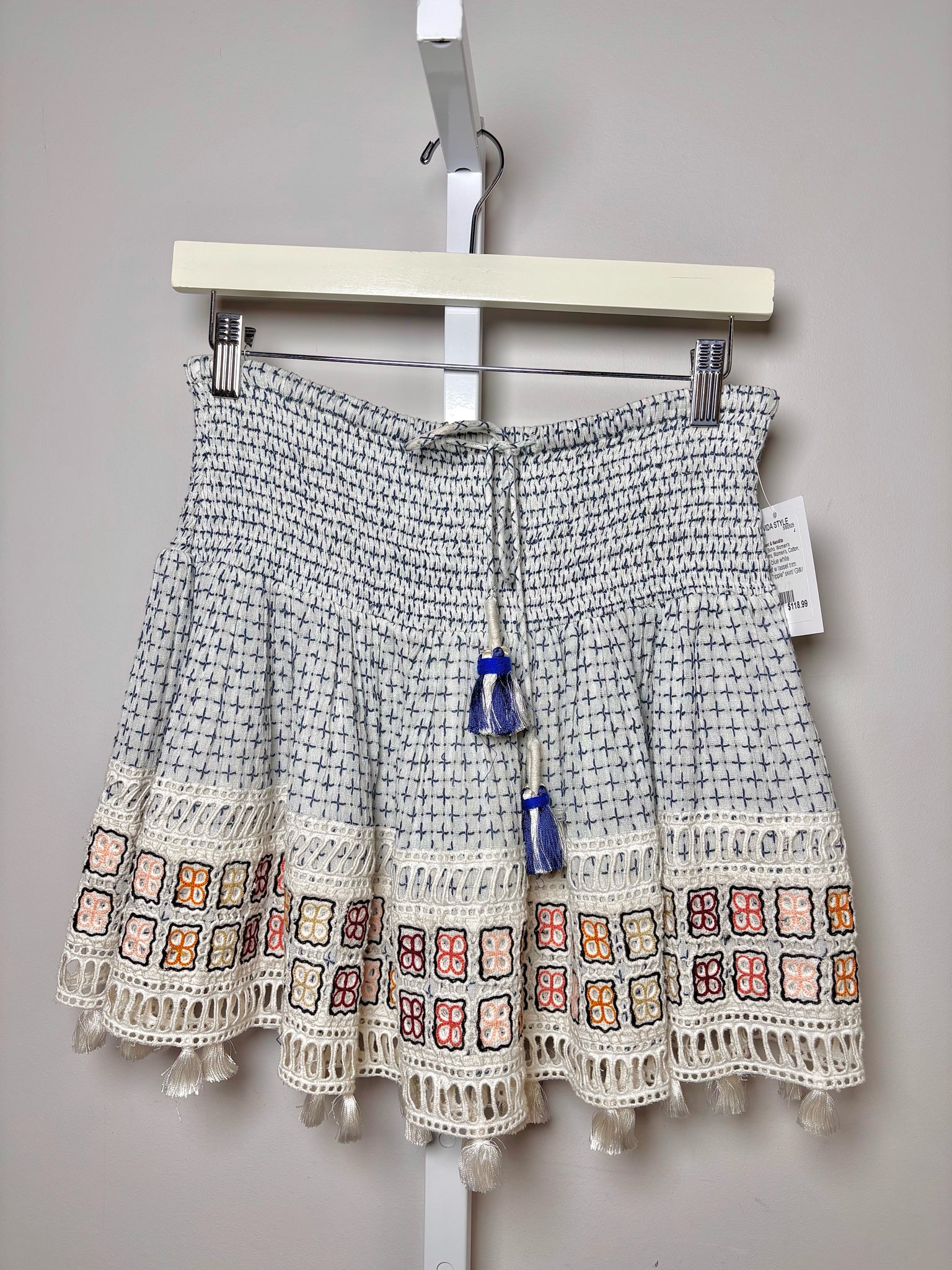 Hemant & Nandita blue and white boho eyelet mini "ripple" skirt with tassels on the trim. Comes new with tags