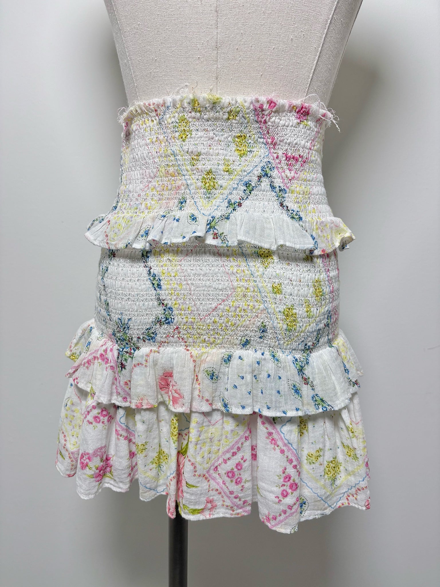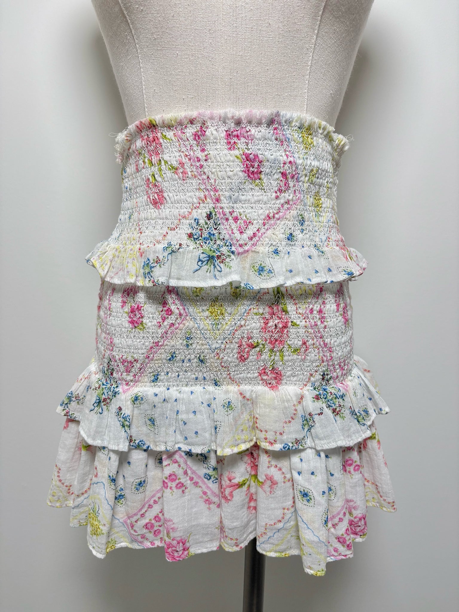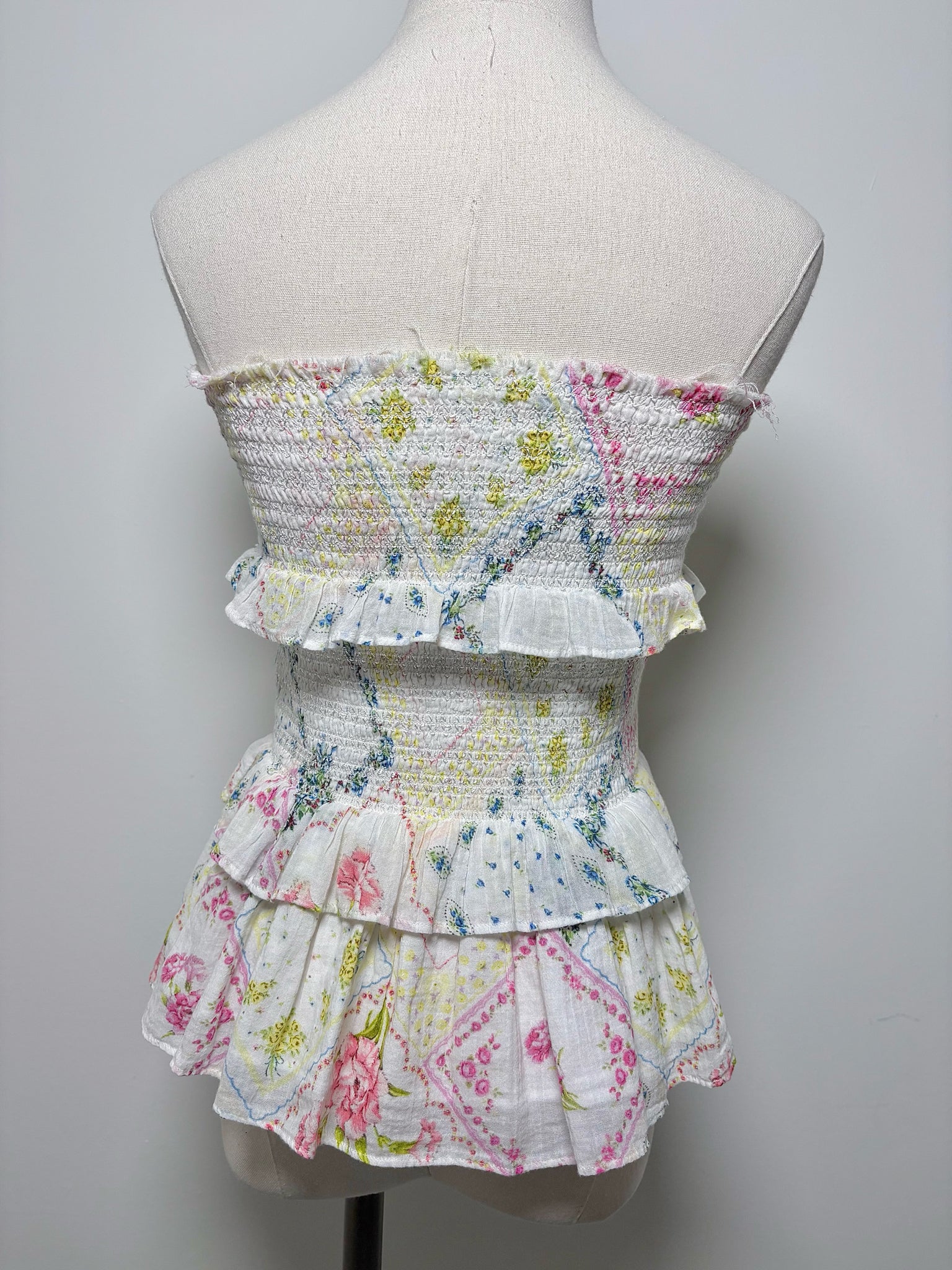 Feminine and versatile, this LoveShackFancy smocked ruffle mini skirt in Size Small features a soft white, pink, blue, and yellow floral print with tiered ruffle detailing. Can be styled as a skirt or worn as a tube top, and pairs beautifully with the matching top (sold separately). Pre-owned in excellent condition—see website for coordinating listing.