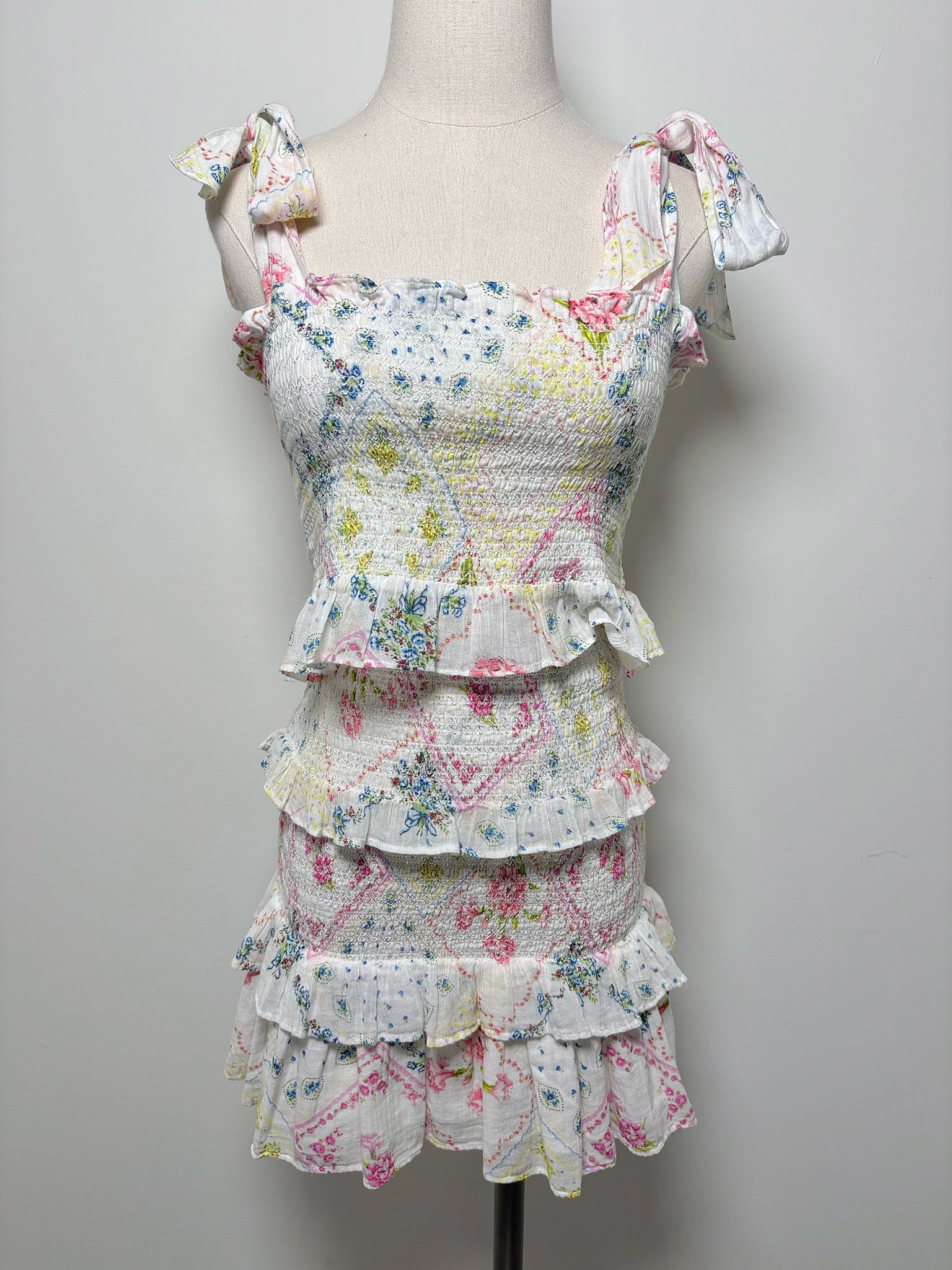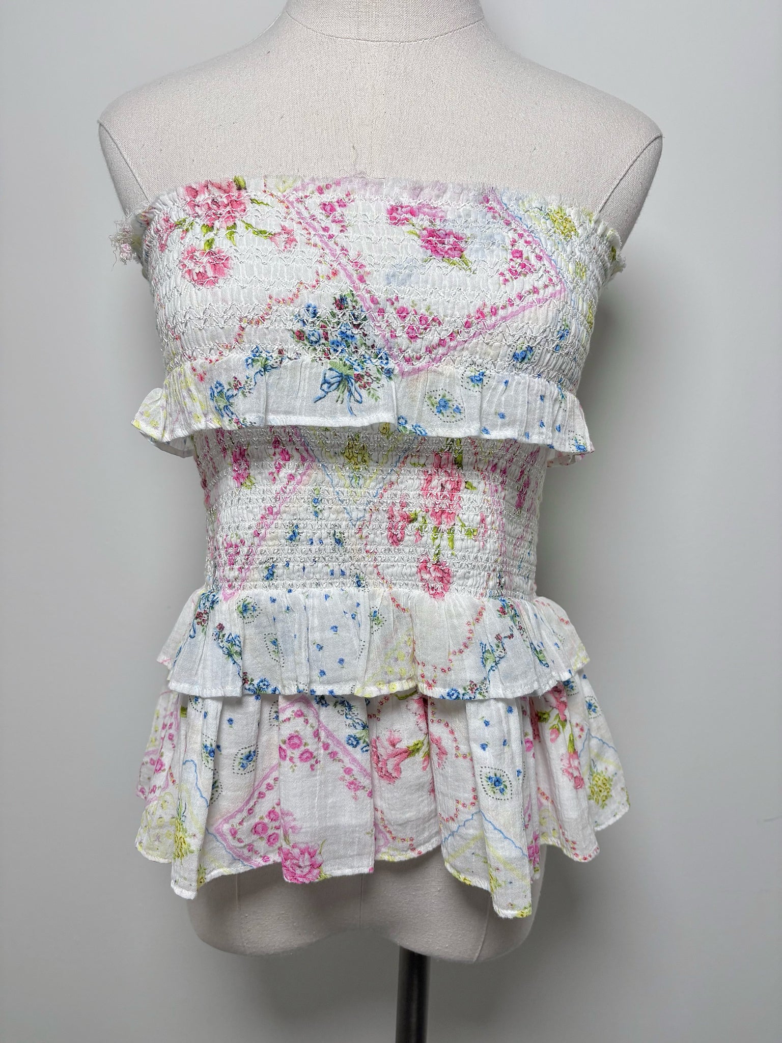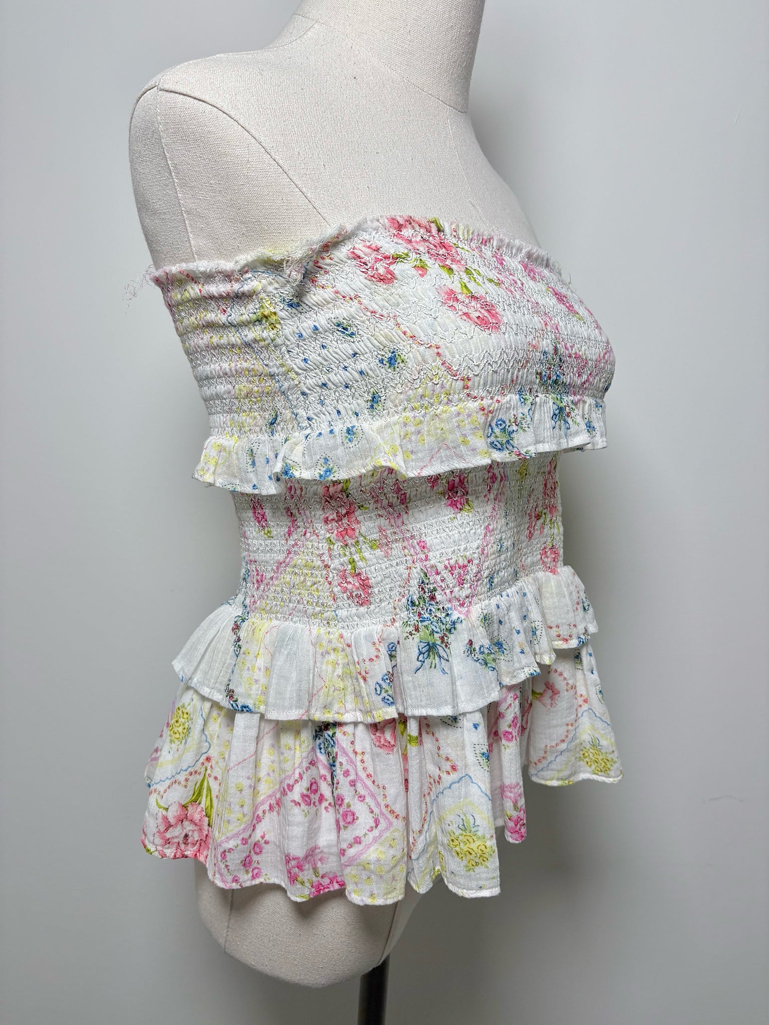 Feminine and versatile, this LoveShackFancy smocked ruffle mini skirt in Size Small features a soft white, pink, blue, and yellow floral print with tiered ruffle detailing. Can be styled as a skirt or worn as a tube top, and pairs beautifully with the matching top (sold separately). Pre-owned in excellent condition—see website for coordinating listing.