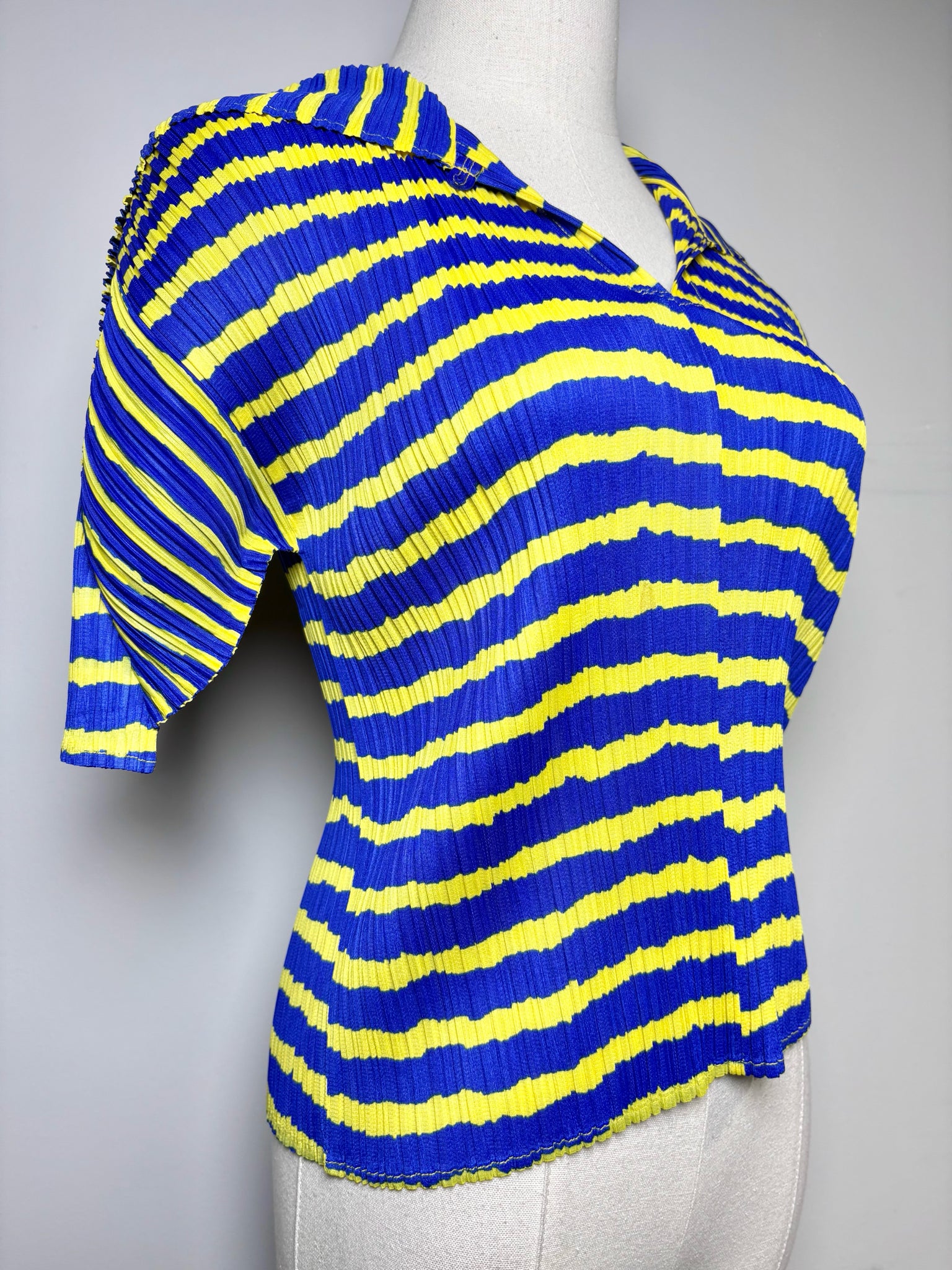 Bright and sculptural, this Issey Miyake Pleats Please women’s top features vertical stretch pleats with an oversized collar and short sleeves, crafted in Japan and finished in a yellow and blue stripe design, offered in an estimated women’s size S/M.