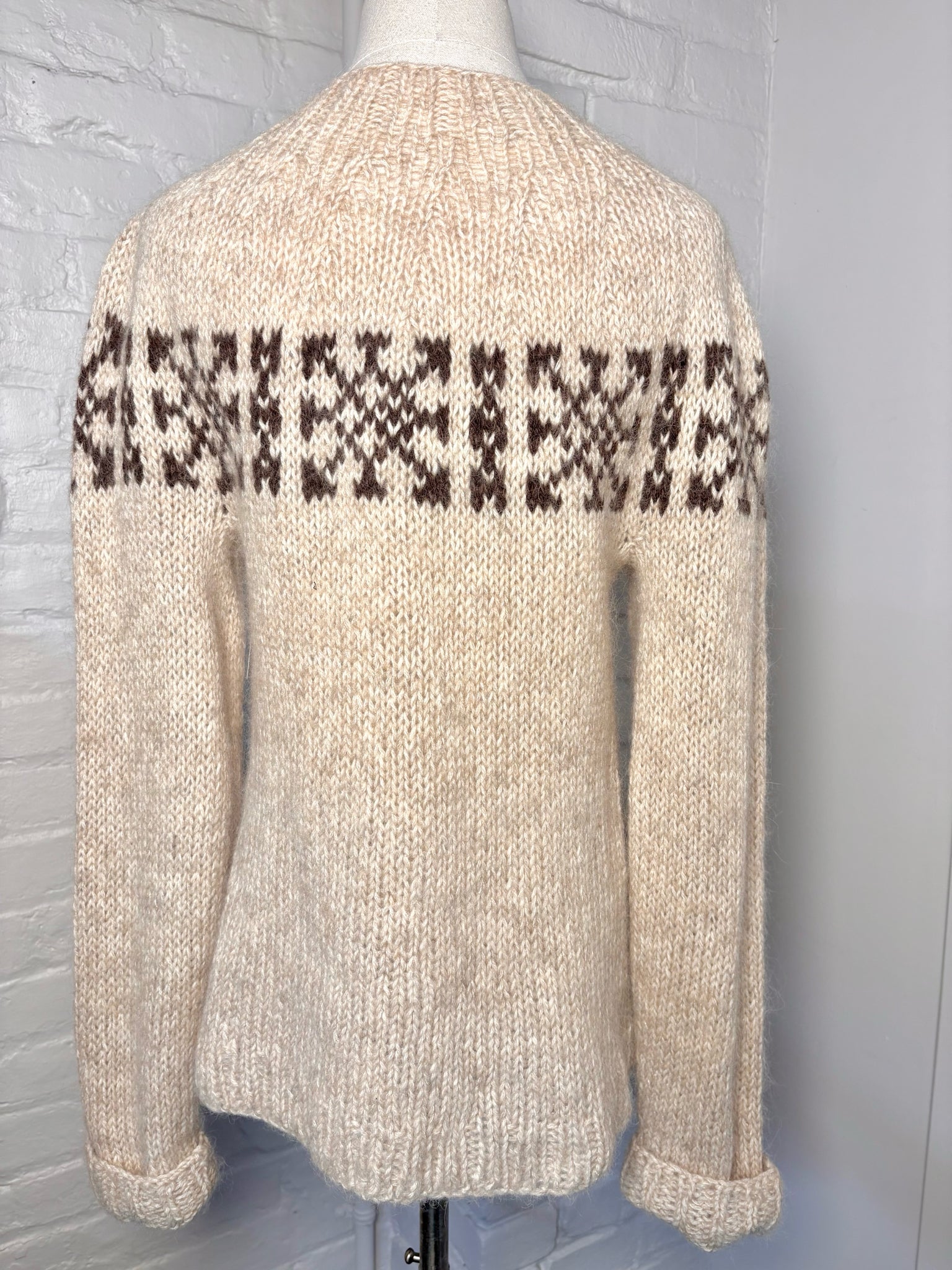 Light tan/khaki brown Fair Isle print hand-knitted long sleeve sweater in a size small.