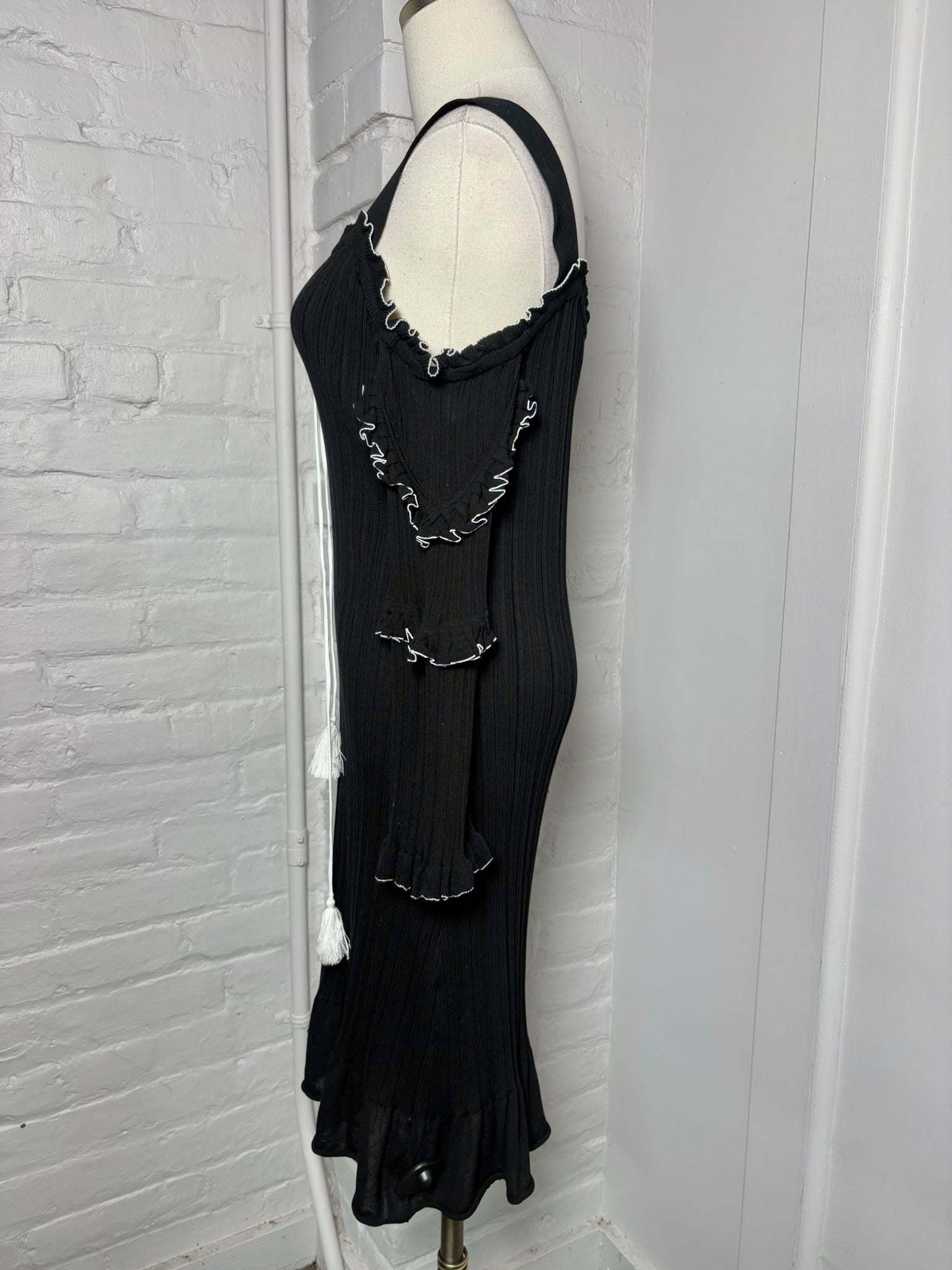 Derek Lam 10 Crosby black stretch knit midi dress with white ribbed lettuce trim, pom pom ties, and cold shoulder in a size S/P.