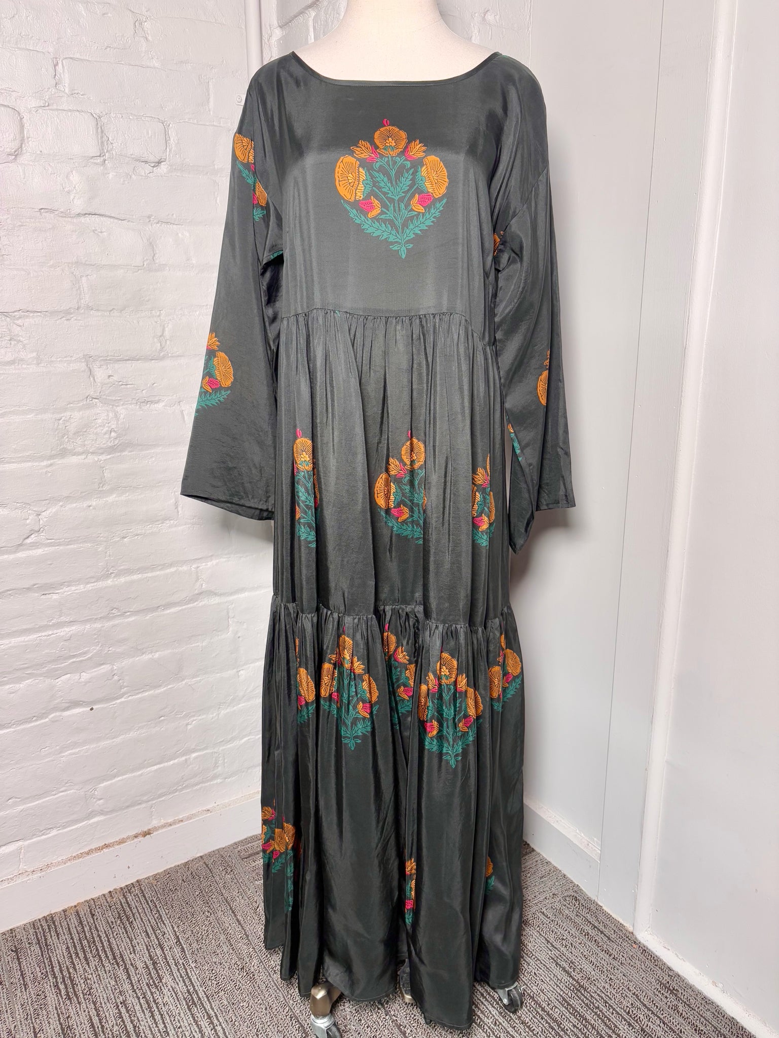 Pink Chicken black floral pattern silk maxi tiered dress with bell sleeves and pockets in a size small.