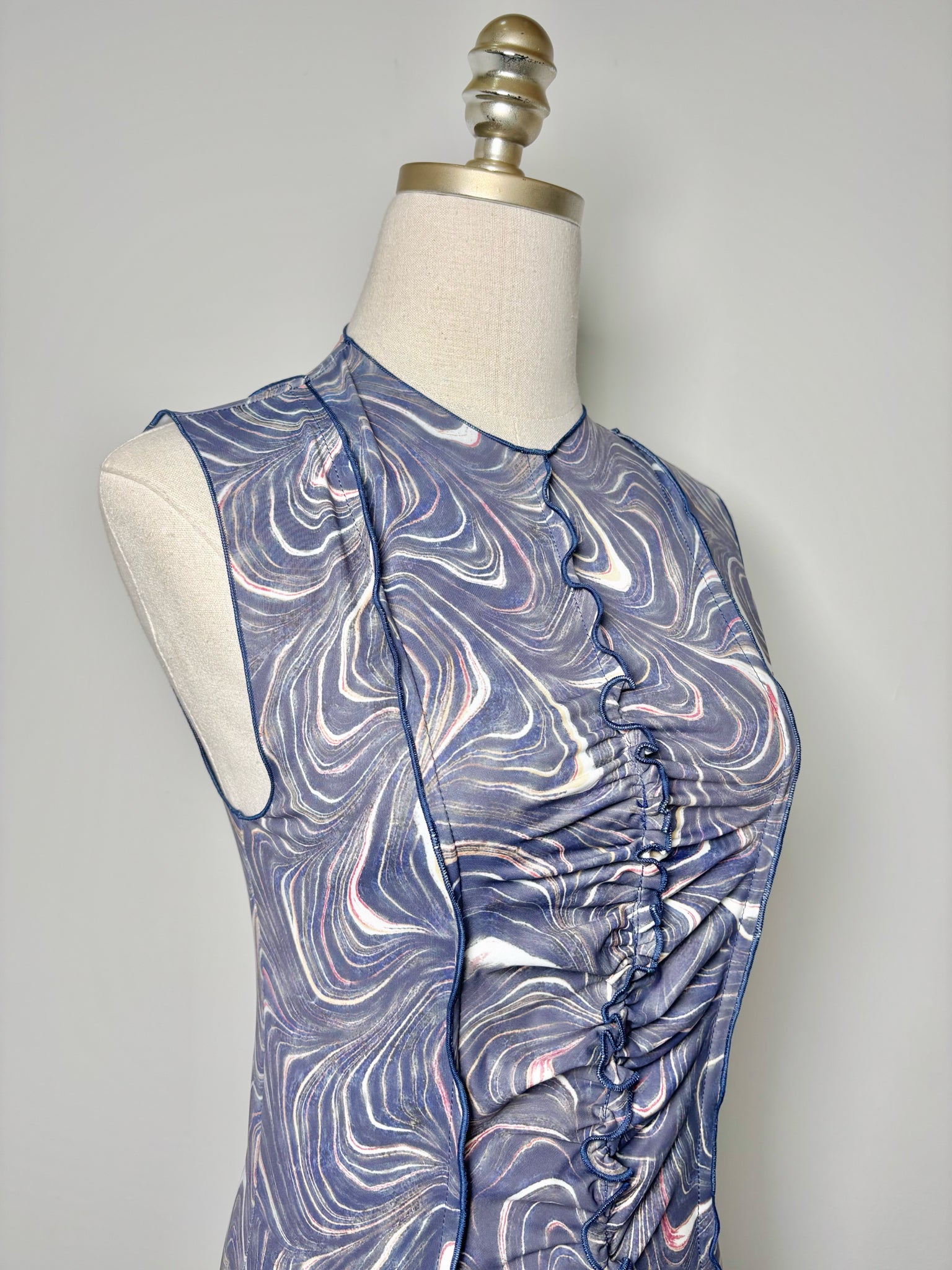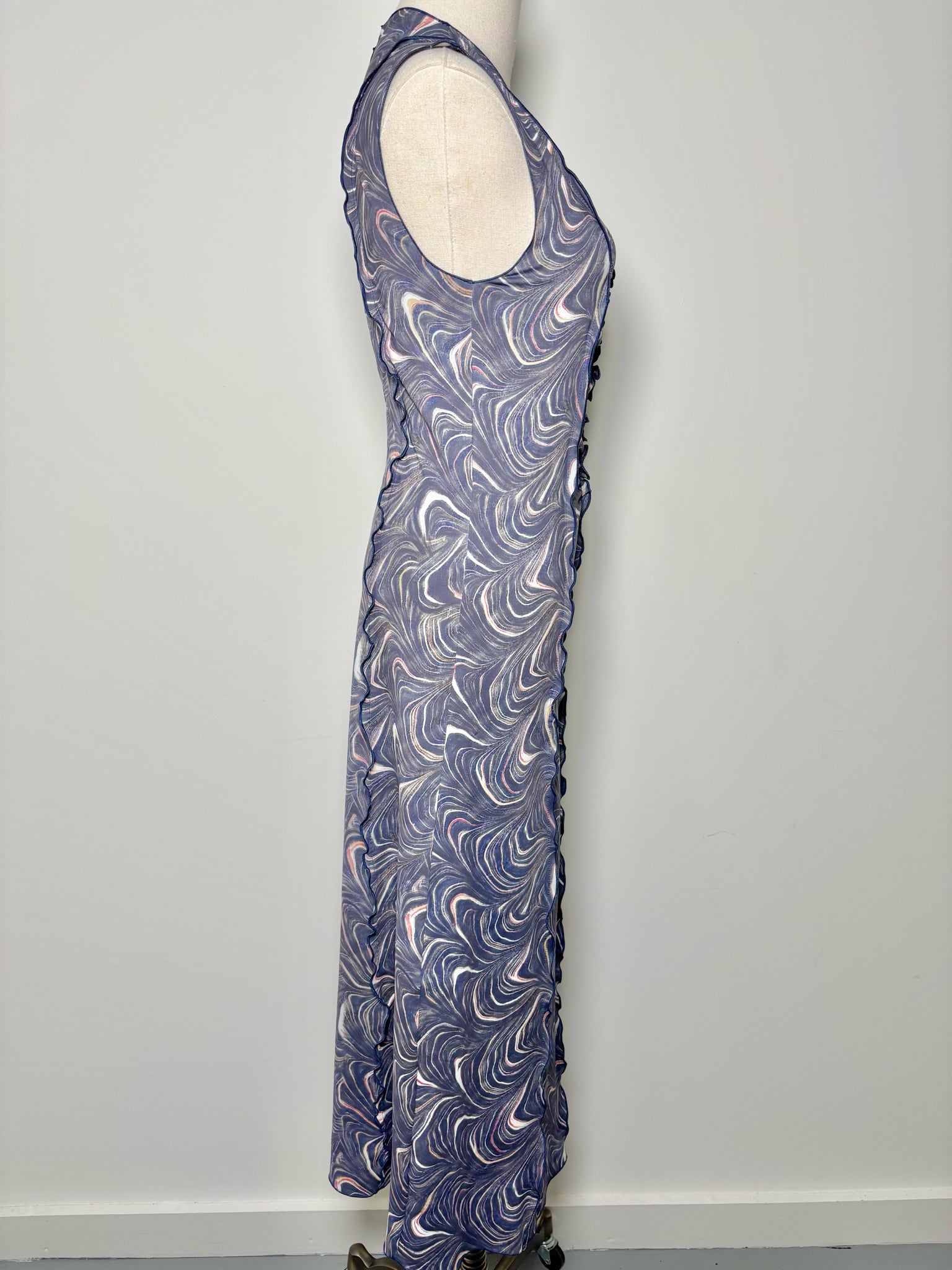 Feminine with an artistic twist, this SEA New York Amara dress features a distinctive blue marble print and delicate front ruffle detailing. The sleeveless silhouette and midi length offer effortless wearability, while a concealed back zipper ensures a smooth fit and comfort. Pre-Owned