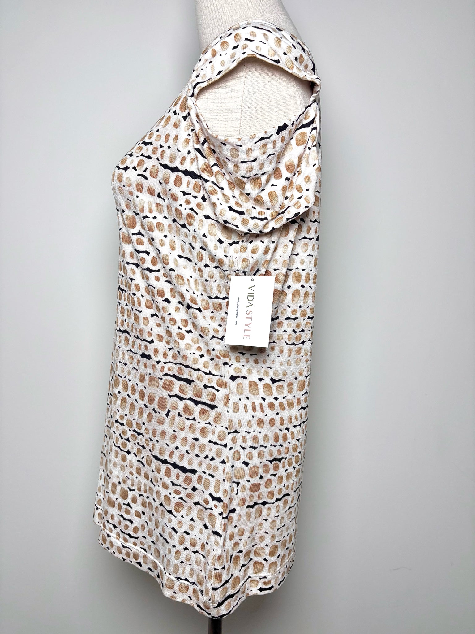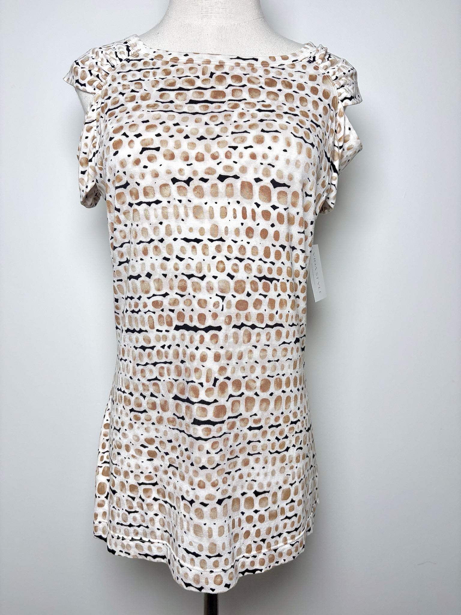 St. John tan, cream and black dotted pattern short sleeve top with a cut out cold shoulder in a size small.
