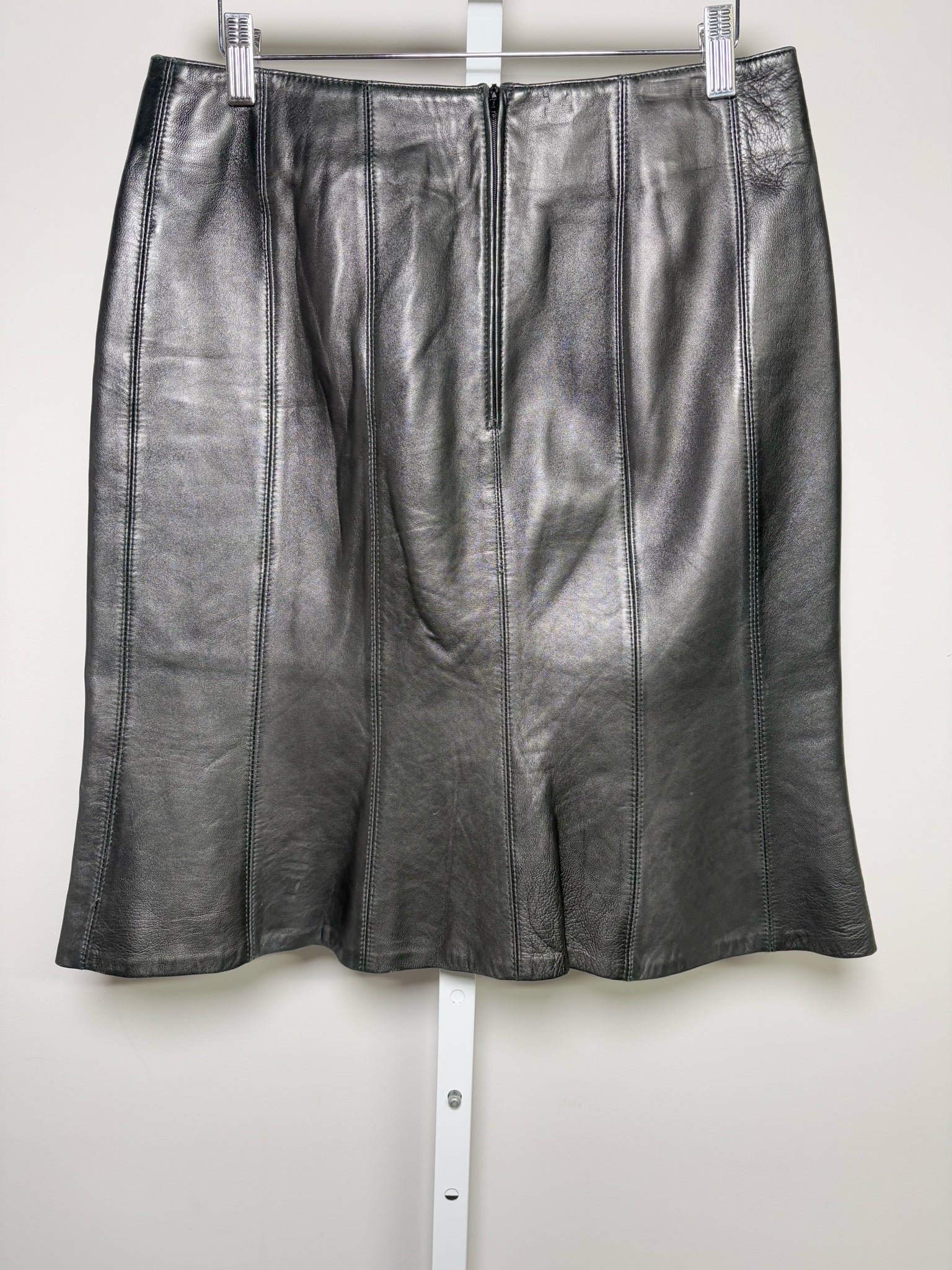 Vintage Swann black leather skirt showcasing exquisite multi-stitch artistry and a dramatic trumpet hem that moves beautifully with every step. Fully lined for a luxurious feel, this rare find brings timeless edge and sophistication to any wardrobe. Size Small.