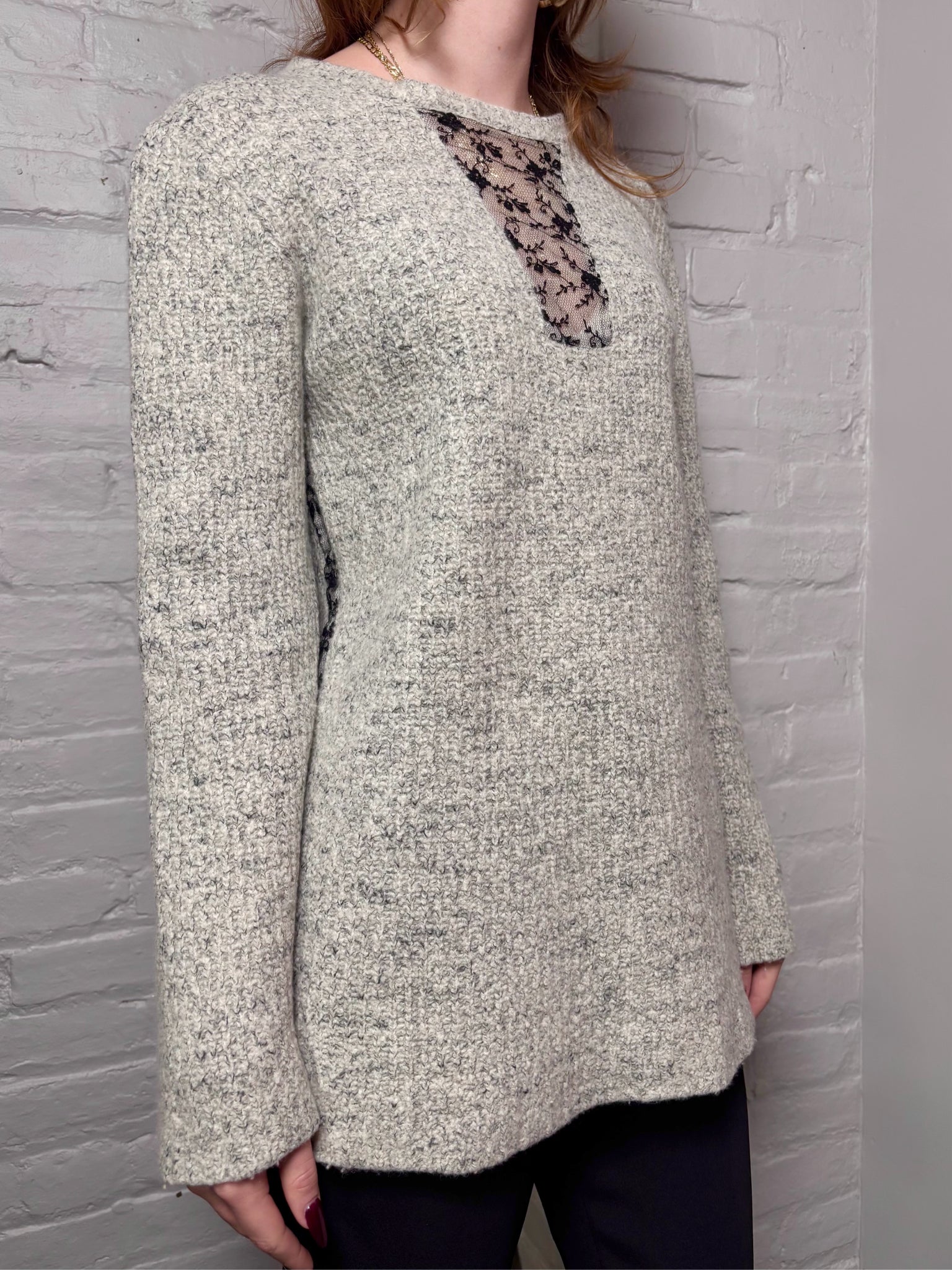Thakoon light gray tweed bouclé sweater featuring a refined round neckline, elevated with black lace panels at the neck and sides for a touch of delicate contrast. Crafted in a size S, this piece blends texture and femininity for a chic, modern silhouette.