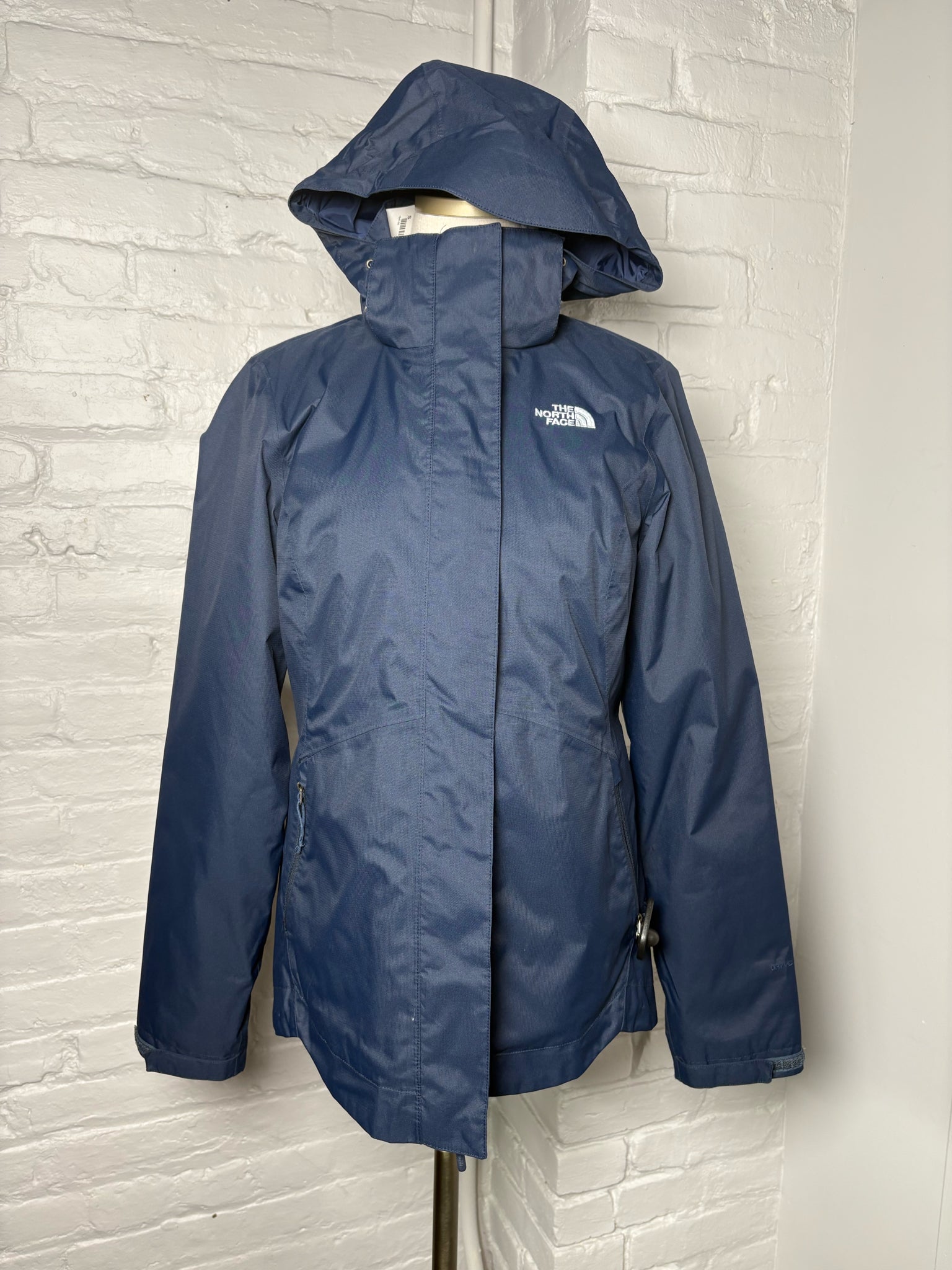 This The North Face Navy Monarch Triclimate 3-in-1 Jacket combines performance and versatility in one sleek design. Crafted from waterproof, windproof DryVent™ nylon, it features a removable light blue fleece liner for customizable warmth and comfort. Ideal for all-weather adventures, it seamlessly transitions from city wear to the outdoors. Size S.