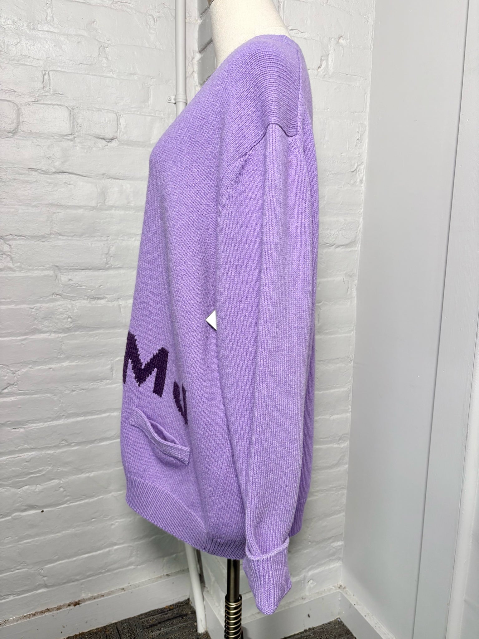 Marc Jacobs “The Big Cardigan” in rich purple 100% wool knit, designed with an oversized silhouette for a cozy, relaxed fit. Features front pockets and signature “MJ” lettering on the left side. Size extra large.