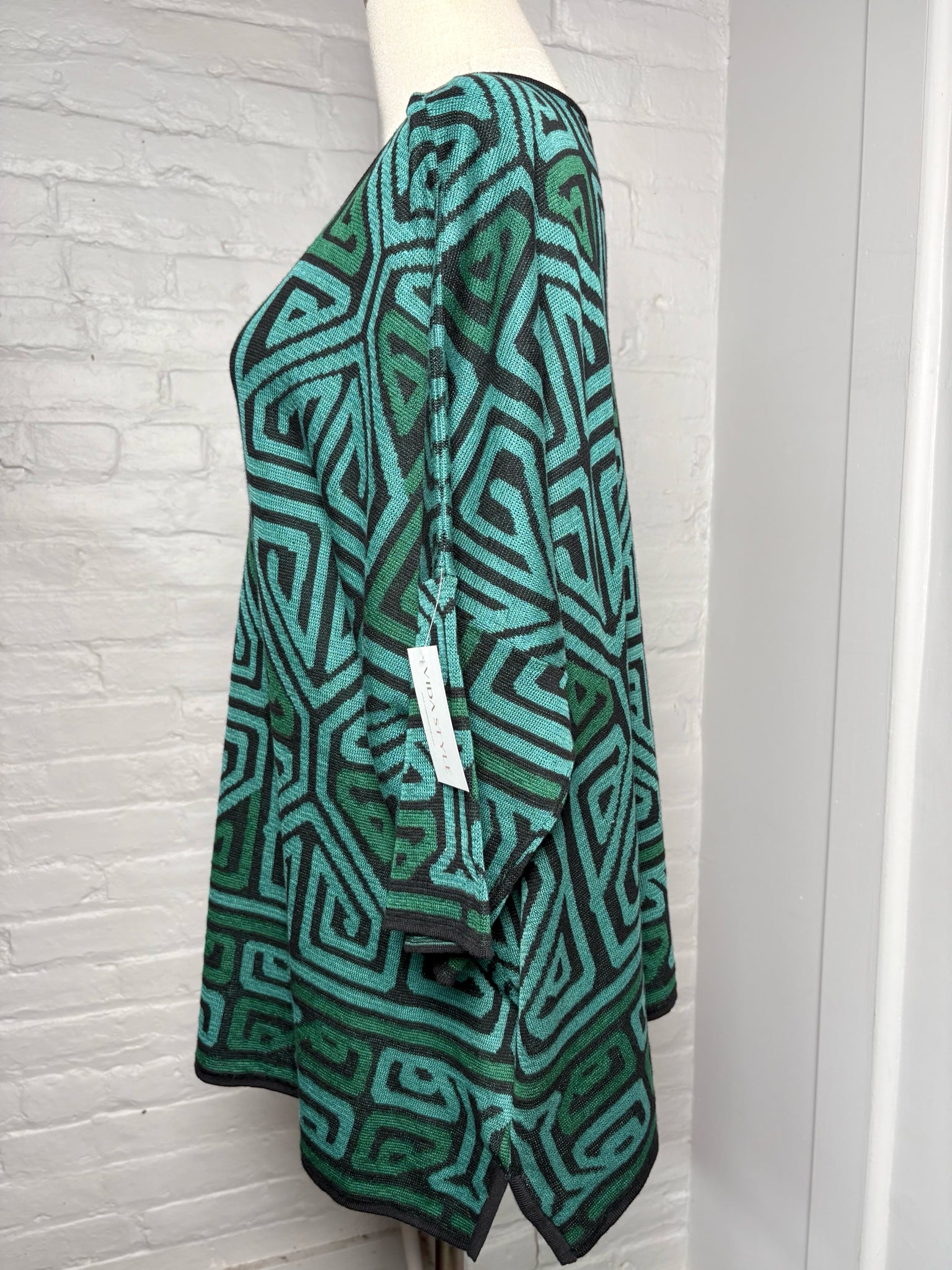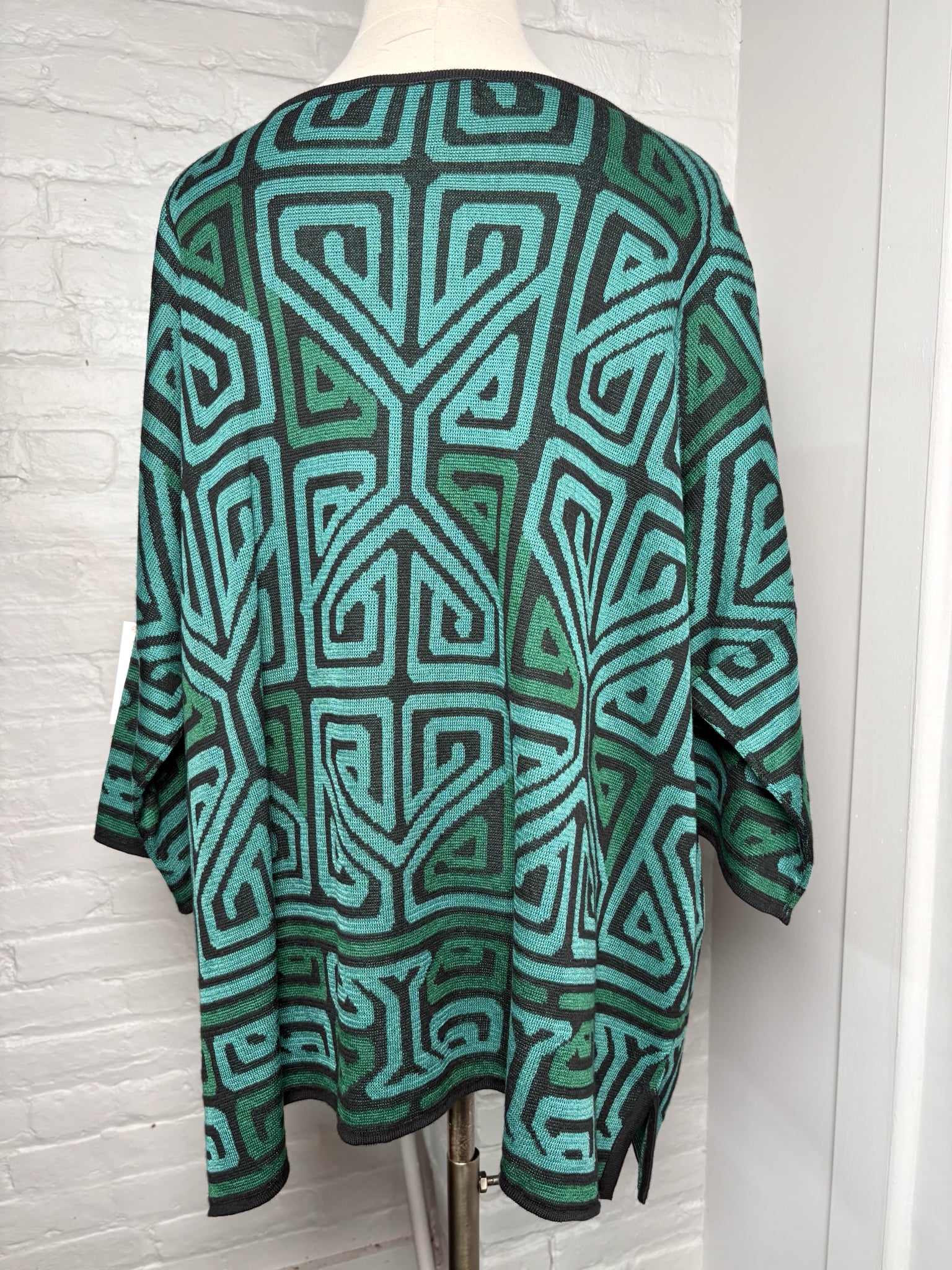 Peruvian Connection teal and black geometric pima cotton knit "tamarindo" sweater in a size extra large/XXL. Comes new with tags.